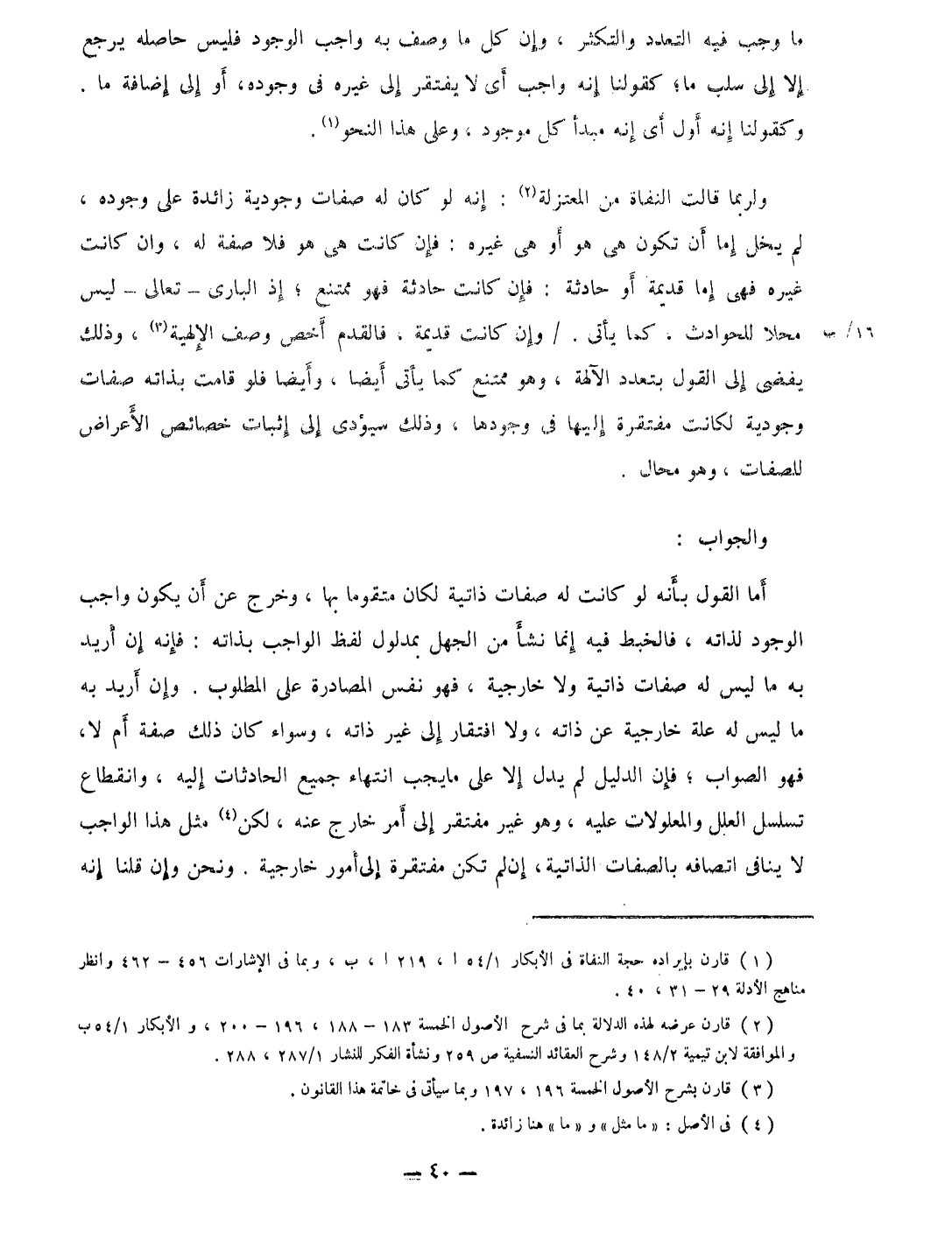 وَالْجَوَاب أما القَوْل بِأَنَّهُ لَو كَانَت لَهُ صِفَات ذاتية لَكَانَ مُتَقَوّما بهَا وَخرج عَن أَن يكون وَاجِب الْوُجُود لذاته فالخبط فِيهِ إِنَّمَا نَشأ من الْجَهْل بمدلول لفظ الْوَاجِب بِذَاتِهِ فَإِنَّهُ إِن أُرِيد بِهِ مَا لَيْسَ لَهُ صِفَات ذاتية وَلَا خارجية فَهُوَ نفس المصادرة على الْمَطْلُوب وَإِن أُرِيد بِهِ مَا لَيْسَ لَهُ عِلّة خارجية عَن ذَاته وَلَا افتقار إِلَى غير ذَاته وَسَوَاء كَانَ ذَلِك صفة أم لَا فَهُوَ الصَّوَاب فَإِن الدَّلِيل لم يدل إِلَّا على مَا يجب انْتِهَاء جَمِيع الحادثات إِلَيْهِ وَانْقِطَاع تسلسل الْعِلَل والمعلولات عَلَيْهِ وَهُوَ غير مفتقر إِلَى أَمر خَارج عَنهُ لَكِن مثل هَذَا الْوَاجِب لَا ينافى اتصافه بِالصِّفَاتِ الذاتية إِن لم تكن مفتقرة إِلَى أُمُور خارجية وَنحن وَإِن قُلْنَا إِنَّه