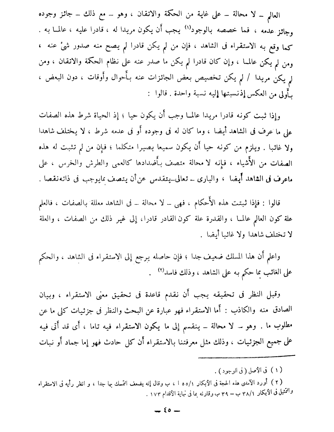 وَقبل النّظر فِي تَحْقِيقه يجب أَن نقدم قَاعِدَة فِي تَحْقِيق معنى الاستقراء وَبَيَان الصَّادِق مِنْهُ والكاذب أما الاستقراء فَهُوَ عبارَة عَن الْبَحْث وَالنَّظَر فِي جزئيات كلى مَا عَن مَطْلُوب مَا وَهُوَ لَا محَالة يَنْقَسِم إِلَى مَا يكون الاستقراء فِيهِ تَاما أَي قد أَتَى فِيهِ على جَمِيع الجزئيات وَذَلِكَ مثل معرفتنا بالاستقراء أَن كل حَادث فَهُوَ إِمَّا جماد أَو نَبَات
