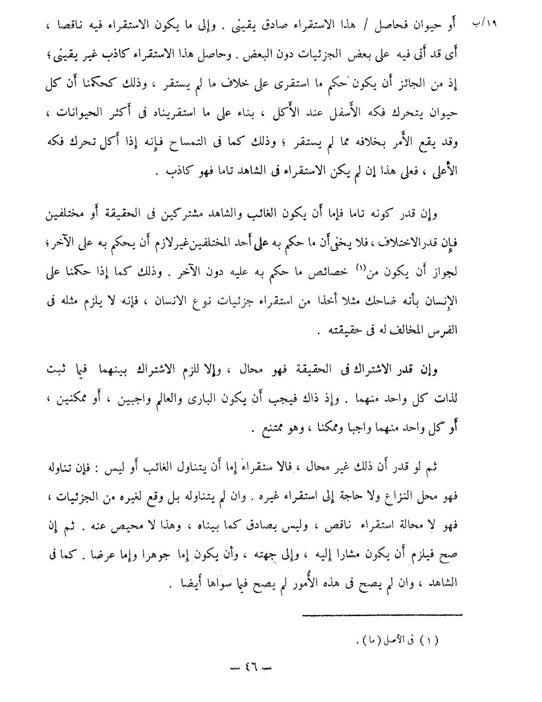 وَإِن قدر كَونه تَاما فإمَّا أَن يكون الْغَائِب وَالشَّاهِد مشتركين فِي الْحَقِيقَة أَو مُخْتَلفين فَإِن قدر الِاخْتِلَاف فَلَا يخفى أَن مَا حكم بِهِ على اُحْدُ الْمُخْتَلِفين غير لَازم أَن يحكم بِهِ على الآخر لجَوَاز أَن يكون من خَصَائِص مَا حكم بِهِ عَلَيْهِ دون الآخر وَذَلِكَ كَمَا إِذا حكمنَا على الْإِنْسَان بِأَنَّهُ ضَاحِك مثلا أخذا من استقراء جزئيات نوع الانسان فَإِنَّهُ لَا يلْزم مثله فِي الْفرس الْمُخَالف لَهُ فِي حَقِيقَته