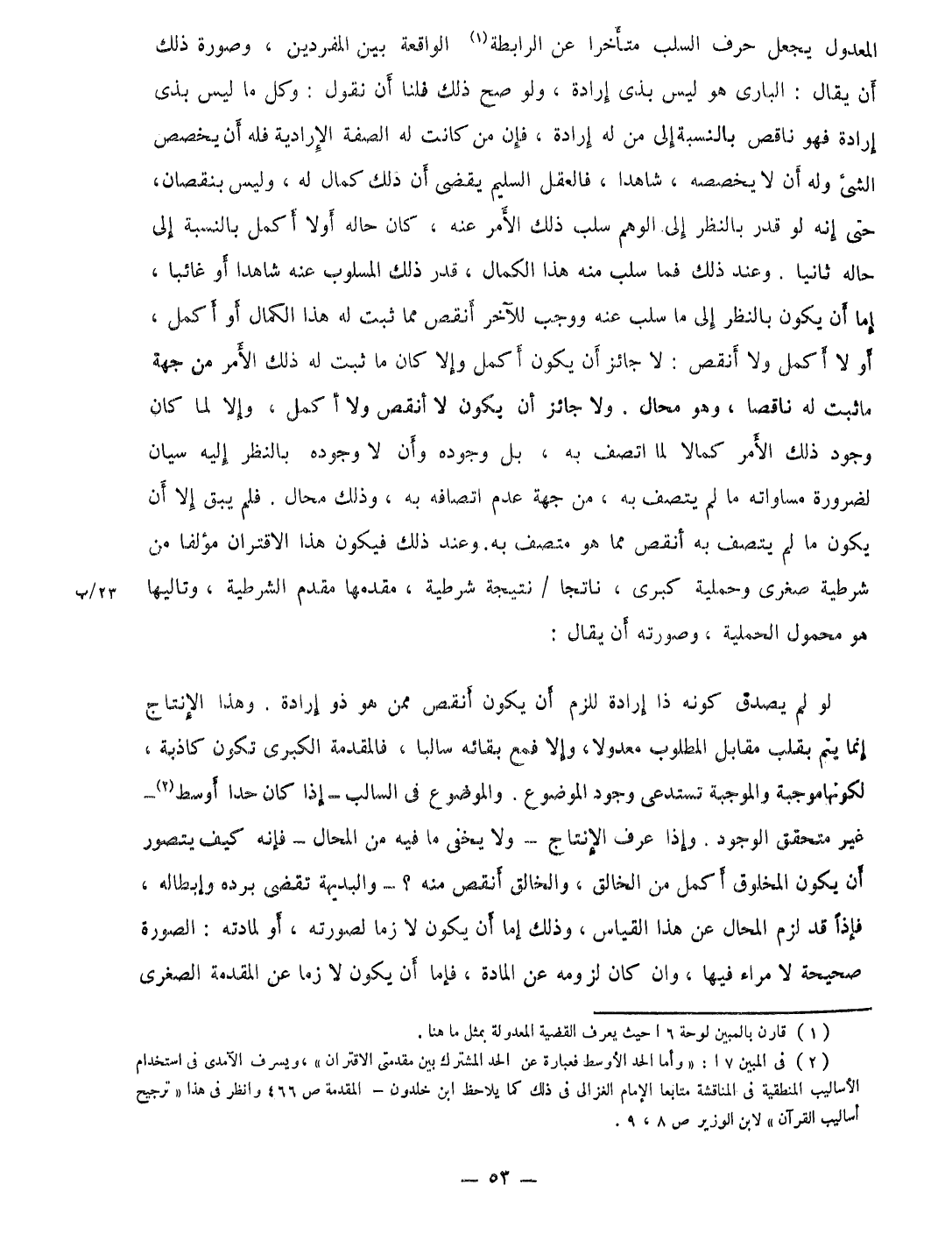 المعدول يَجْعَل حرف السَّلب مُتَأَخِّرًا عَن الرابطة الْوَاقِعَة بَين المفردين وَصُورَة ذَلِك أَن يُقَال البارى هُوَ لَيْسَ بِذِي إِرَادَة وَلَو صَحَّ ذَلِك فلنا أَن نقُول وكل مَا لَيْسَ بذى إِرَادَة فَهُوَ نَاقص بِالنِّسْبَةِ إِلَى من لَهُ إِرَادَة فَإِن من كَانَت لَهُ الصّفة الإرادية فَلهُ أَن يخصص الشئ وَله أَن لَا يخصصه شَاهدا فالعقل السَّلِيم يقْضى أَن ذَلِك كَمَال لَهُ وَلَيْسَ بِنُقْصَان حَتَّى إِنَّه لَو قدر بِالنّظرِ إِلَى الْوَهم سلب ذَلِك الْأَمر عَنهُ كَانَ حَاله أَولا أكمل بِالنِّسْبَةِ إِلَى حَاله ثَانِيًا وَعند ذَلِك فَمَا سلب مِنْهُ هَذَا الْكَمَال قدر ذَلِك المسلوب عَنهُ شَاهدا أَو غَائِبا إِمَّا أَن يكون بِالنّظرِ إِلَى مَا سلب عَنهُ وَوَجَب للْآخر أنقص مِمَّا ثَبت لَهُ هَذَا الْكَمَال اَوْ أكمل أَو لَا أكمل وَلَا أنقص لَا جَائِز أَن يكون أكمل وَإِلَّا كَانَ مَا ثَبت لَهُ ذَلِك الامر من جِهَة مَا ثَبت لَهُ نَاقِصا وَهُوَ محَال وَلَا جَائِز أَن يكون لَا أنقص وَلَا أكمل وَإِلَّا لما كَانَ وجود ذَلِك الْأَمر كمالا لما اتّصف بِهِ بل وجوده وَأَن لَا وجوده بِالنّظرِ إِلَيْهِ سيان لضَرُورَة مساواته مَا لم يَتَّصِف بِهِ من جِهَة عدم اتصافه بِهِ وَذَلِكَ محَال فَلم يبْق إِلَّا أَن يكون مَا لم يَتَّصِف بِهِ أنقص مِمَّا هُوَ متصف بِهِ وَعند ذَلِك فَيكون هَذَا الاقتران مؤلفا من شَرْطِيَّة صغرى وحملية كبرى ناتجا نتيجة شَرْطِيَّة مقدمها مقدم الشّرطِيَّة وتاليها هُوَ مَحْمُول الحملية وَصورته أَن يُقَال