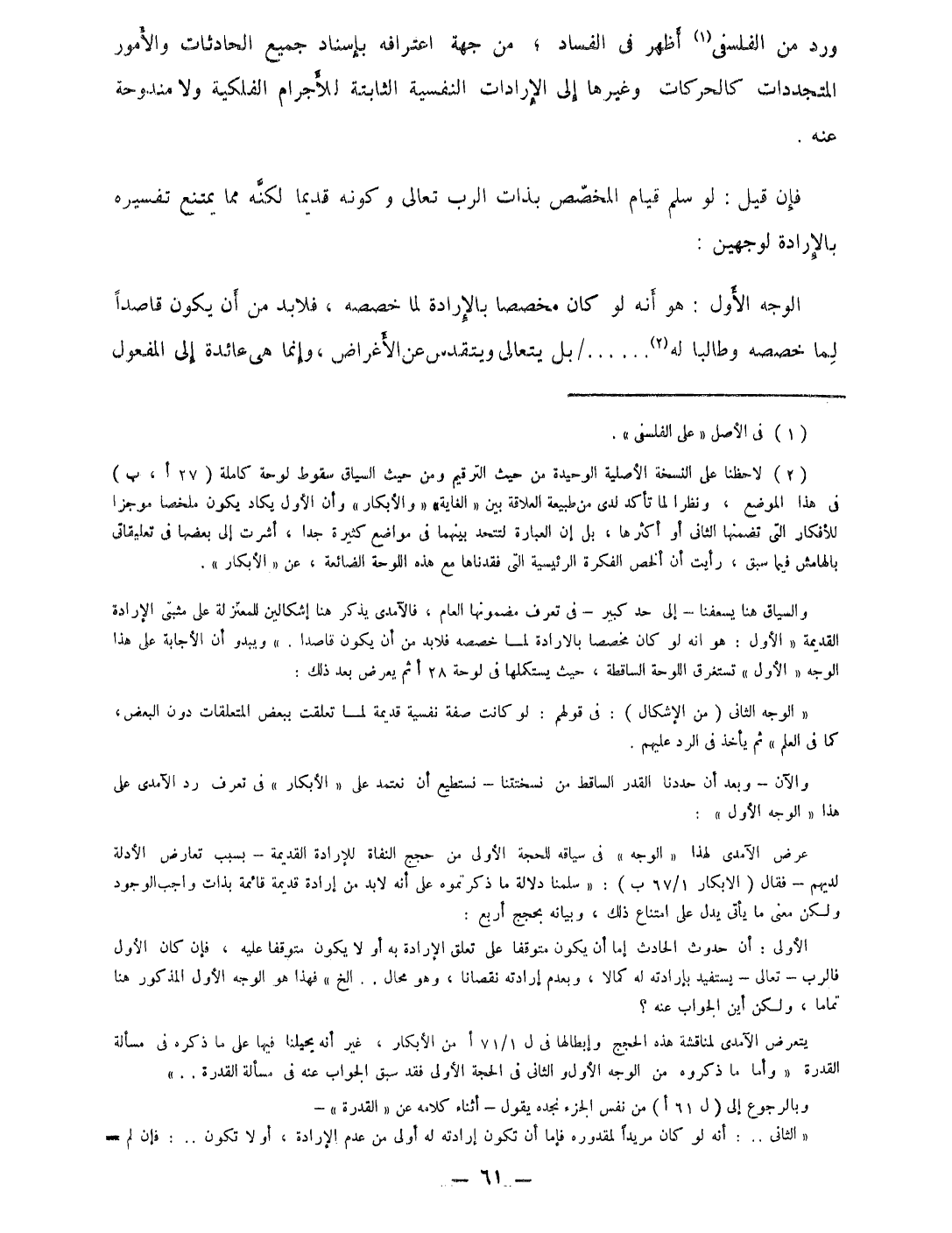 الْوَجْه الأول هُوَ أَنه لَو كَانَ مُخَصّصا بالإرادة لما خصصه فَلَا بُد من أَن يكون قَاصِدا لما خصصه وطالبا لَهُ بل يتعالى ويتقدس عَن الْأَغْرَاض وَإِنَّمَا هِيَ عَائِدَة إِلَى الْمَفْعُول
