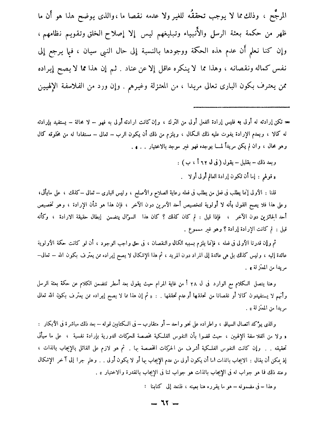 الْمُرَجح وَذَلِكَ مِمَّا لَا يُوجب تحَققه للْغَيْر وَلَا عَدمه نقصا مَا وَالَّذِي يُوضح هَذَا هُوَ أَن مَا ظهر من حِكْمَة بعثة الرُّسُل والأنبياء وتبليغهم لَيْسَ إِلَّا إصْلَاح الْخلق وتقويم نظامهم وَإِن كُنَّا نعلم أَن عدم هَذِه الْحِكْمَة ووجودها بِالنِّسْبَةِ إِلَى حَال النبى سيان فِيمَا يرجع إِلَى نفس كَمَاله ونقصانه وَهَذَا مِمَّا لَا يُنكره عَاقل إِلَّا عَن عناد ثمَّ إِن هَذَا مِمَّا لَا يَصح إِيرَاده مِمَّن يعْتَرف بِكَوْن البارى تَعَالَى مرِيدا من الْمُعْتَزلَة وَغَيرهم وَإِن ورد من الفلاسفة الإلهيين