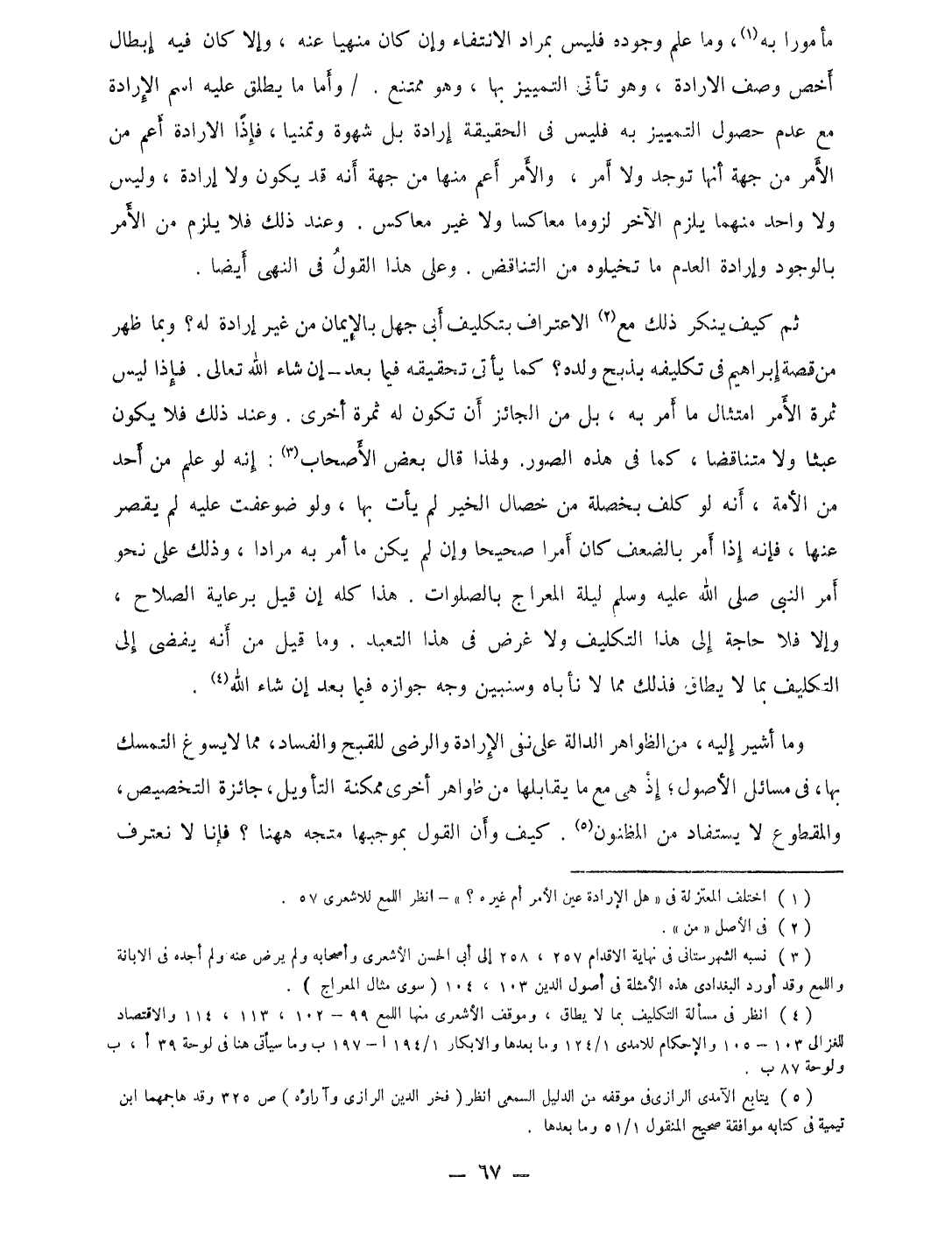 ثمَّ كَيفَ يُنكر ذَلِك مَعَ الِاعْتِرَاف بتكليف أَبى جهل بِالْإِيمَان من غير إِرَادَة لَهُ وَبِمَا ظهر من قصَّة إِبْرَاهِيم فِي تَكْلِيفه بِذبح وَلَده كَمَا يَأْتِي تَحْقِيقه فِيمَا بعد إِن شَاءَ الله تعإلى فَإِذا لَيْسَ ثَمَرَة الْأَمر امْتِثَال مَا أَمر بِهِ بل من الْجَائِز أَن تكون لَهُ ثَمَرَة أُخْرَى وَعند ذَلِك فَلَا يكون عَبَثا وَلَا متناقضا كَمَا فِي هَذِه الصُّور وَلِهَذَا قَالَ بعض الْأَصْحَاب إِنَّه لَو علم من أحد من الامة أَنه لَو كلف بخصله من خِصَال الْخَيْر لم يَأْتِ بهَا وَلَو ضوعفت عَلَيْهِ لم يقصر عَنْهَا فَإِنَّهُ إِذا امْر بالضعف كَانَ امرا صَحِيحا وَإِن لم يكن مَا أَمر بِهِ مرَادا وَذَلِكَ على نَحْو امْر النبى صلى الله عَلَيْهِ وَسلم لَيْلَة الْمِعْرَاج بالصلوات هَذَا كُله إِن قيل برعاية الصّلاح وَإِلَّا فَلَا حَاجَة إِلَى هَذَا التَّكْلِيف وَلَا غَرَض فِي هَذَا التَّعَبُّد وَمَا قيل من انه يفضى إِلَى التَّكْلِيف بِمَا لَا يُطَاق فَذَلِك مِمَّا لَا نأباه وسنبين وَجه جَوَازه فِيمَا بعد إِن شَاءَ الله