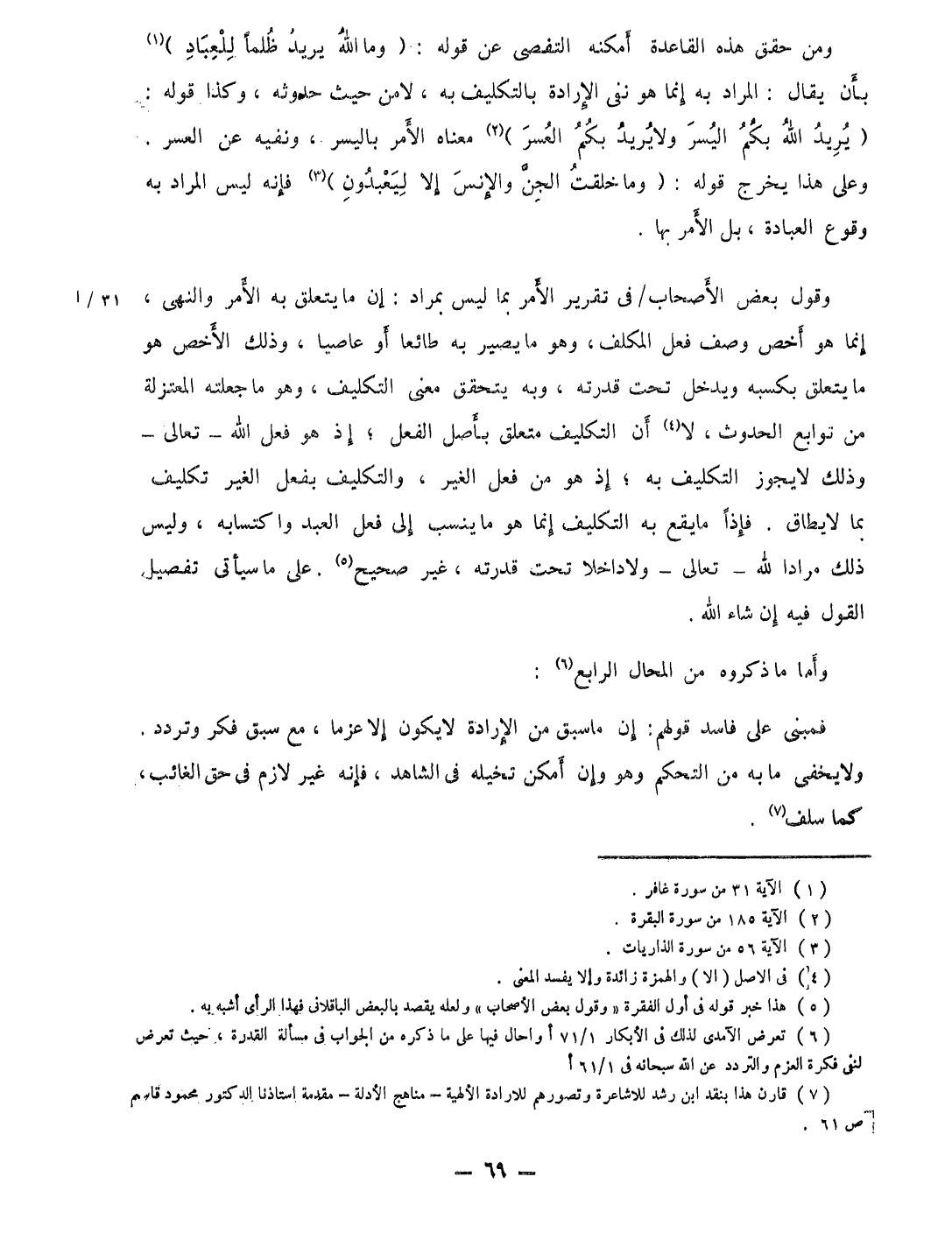 وَمن حقق هَذِه الْقَاعِدَة أمكنه التقصى عَن قَوْله {وَمَا الله يُرِيد ظلما للعباد} بِأَن يُقَال المُرَاد بِهِ إِنَّمَا هُوَ نفى الْإِرَادَة بالتكليف بِهِ لَا من حَيْثُ حُدُوثه وَكَذَا قَوْله {يُرِيد الله بكم الْيُسْر وَلَا يُرِيد بكم الْعسر} مَعْنَاهُ الْأَمر باليسر ونفيه عَن الْعسر وعَلى هَذَا يخرج قَوْله {وَمَا خلقت الْجِنّ وَالْإِنْس إِلَّا ليعبدون} فَإِنَّهُ لَيْسَ المُرَاد بِهِ وُقُوع الْعِبَادَة بل الْأَمر بهَا