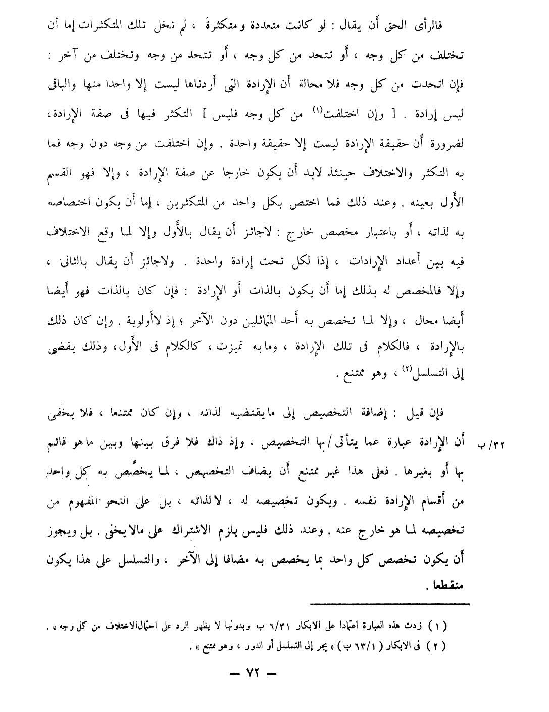 فَالرَّأْي الْحق أَن يُقَال لَو كَانَت مُتعَدِّدَة ومتكثرة لم تخل تِلْكَ المتكثرات إِمَّا أَن تخْتَلف من كل وَجه اَوْ تتحد من كل وَجه أَو تتحد من وَجه وتختلف من آخر فَإِن اتّحدت من كل وَجه فَلَا محَالة أَن الْإِرَادَة الَّتِي أردناها لَيست إِلَّا وَاحِدًا مِنْهَا وَالْبَاقِي لَيْسَ إِرَادَة وَإِن اخْتلفت من كل وَجه فَلَيْسَ التكثر فِيهَا فِي صفة الْإِرَادَة لضَرُورَة أَن حَقِيقَة الْإِرَادَة لَيست إِلَّا حَقِيقَة وَاحِدَة وَإِن اخْتلفت من وَجه دون وَجه فَمَا بِهِ التكثر وَالِاخْتِلَاف حِينَئِذٍ لَا بُد أَن يكون خَارِجا عَن صفة الْإِرَادَة وَإِلَّا فَهُوَ الْقسم الاول بِعَيْنِه وَعند ذَلِك فَمَا اخْتصَّ بِكُل وَاحِد من المتكثرين إِمَّا أَن يكون اخْتِصَاصه بِهِ لذاته أَو بِاعْتِبَار مُخَصص خَارج لَا جَائِز أَن يُقَال بالاول وَإِلَّا لما وَقع الِاخْتِلَاف فِيهِ بَين أعداد الإرادات إِذْ لكل تَحت إِرَادَة وَاحِدَة وَلَا جَائِز أَن يُقَال بِالثَّانِي وَإِلَّا فالمخصص لَهُ بذلك إِمَّا أَن يكون بِالذَّاتِ اَوْ الْإِرَادَة فَإِن كَانَ بِالذَّاتِ فَهُوَ أَيْضا محَال وَإِلَّا بِمَا تخصص بِهِ اُحْدُ المتماثلين دون الآخر إِذْ لَا أَوْلَوِيَّة وَإِن كَانَ ذَلِك بالإرادة فَالْكَلَام فِي تِلْكَ الْإِرَادَة وَمَا بِهِ تميزت كَالْكَلَامِ فِي الأول وَذَلِكَ يفضى إِلَى التسلسل وَهُوَ مُمْتَنع