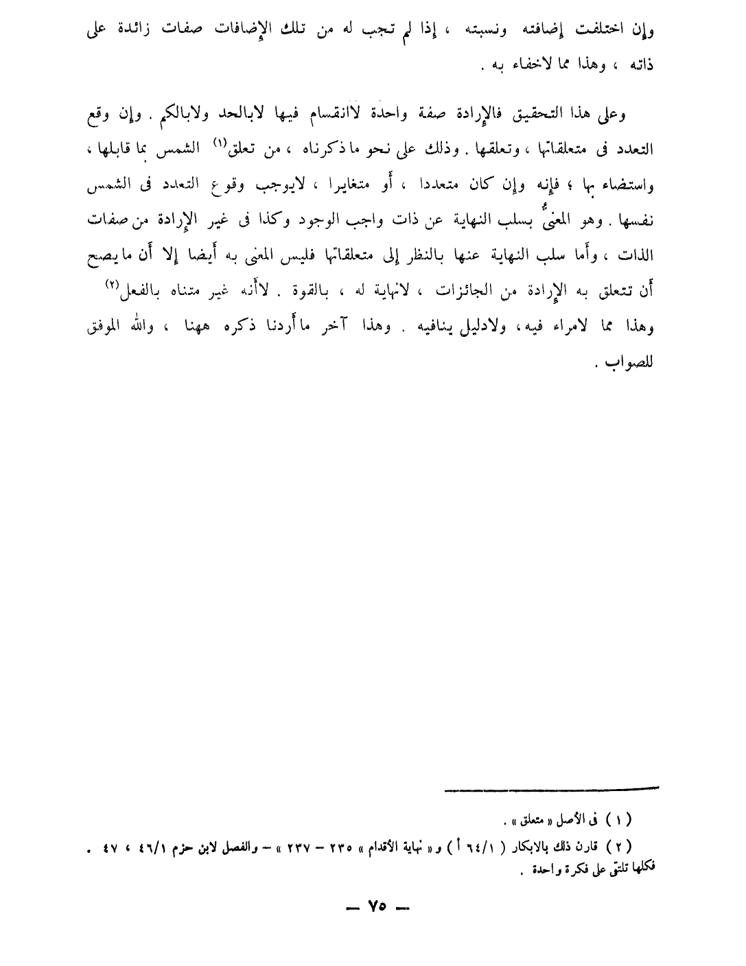 وعَلى هَذَا الْحقيق فالإرادة صفة وَاحِدَة لَا انقسام فِيهَا لَا بِالْحَدِّ وَلَا بالكم وَإِن وَقع التَّعَدُّد فِي متعلقاتها وتعلقها وَذَلِكَ على نَحْو مَا ذَكرْنَاهُ من تعلق الشَّمْس بِمَا قابلها واستضاء بهَا فَإِنَّهُ وَإِن كَانَ مُتَعَددًا أَو متغايرا لَا يُوجب وُقُوع التَّعَدُّد فِي الشَّمْس نَفسهَا وَهُوَ الْمَعْنى بسلب النِّهَايَة عَن ذَات وَاجِب الْوُجُود وَكَذَا فِي غير الْإِرَادَة من صِفَات الذَّات وَأما سلب النِّهَايَة عَنْهَا بِالنّظرِ إِلَى متعلقاتها فَلَيْسَ الْمَعْنى بِهِ أَيْضا إِلَّا ان مَا يَصح ان تتَعَلَّق بِهِ الْإِرَادَة من الجائزات لَا نِهَايَة لَهُ بِالْقُوَّةِ لَا انه غير متناه بِالْفِعْلِ