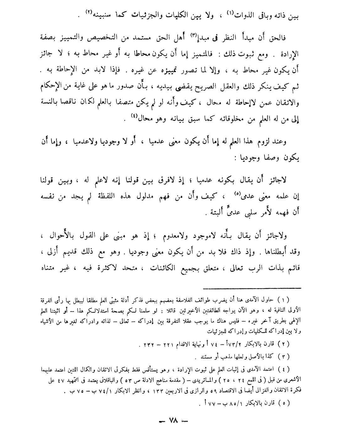 وَلَا جَائِز أَن يُقَال بِأَنَّهُ لَا مَوْجُود وَلَا مَعْدُوم إِذْ هُوَ مبْنى على القَوْل بالأحوال وَقد أبطلناها وَإِذ ذَاك فَلَا بُد من أَن يكون معنى وجوديا وَهُوَ مَعَ ذَلِك قديم أزلى قَائِم بِذَات الرب تَعَالَى مُتَعَلق بِجَمِيعِ الكائنات مُتحد لَا كَثْرَة فِيهِ غير متناه