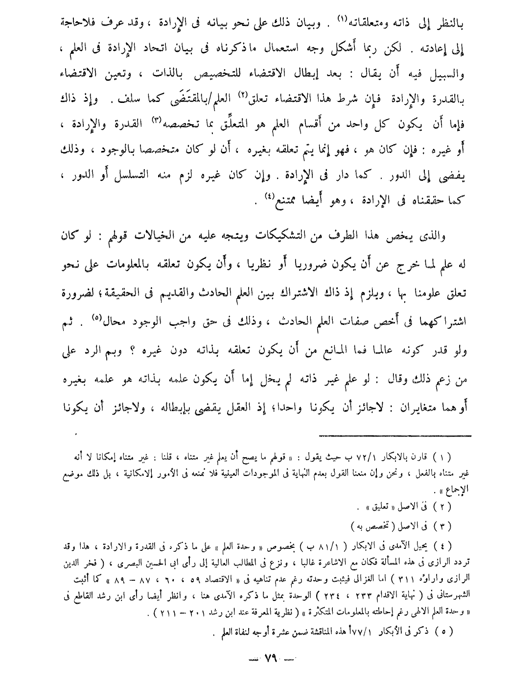 بِالنّظرِ إِلَى ذَاته ومتعلقاته وَبَيَان ذَلِك على نَحْو بَيَانه فِي الْإِرَادَة وَقد عرف فَلَا حَاجَة إِلَى إِعَادَته لَكِن رُبمَا أشكل وَجه اسْتِعْمَال مَا ذَكرْنَاهُ فِي بَيَان اتِّحَاد الْإِرَادَة فِي الْعلم والسبيل فِيهِ أَن يُقَال بعد إبِْطَال الِاقْتِضَاء للتخصيص بِالذَّاتِ وَتعين الِاقْتِضَاء بِالْقُدْرَةِ والارادة فَإِن شَرط هَذَا الِاقْتِضَاء تعلق الْعلم بالمقتضى كَمَا سلف وَإِذ ذَاك فإمَّا أَن يكون كل وَاحِد من اقسام الْعلم هُوَ الْمُتَعَلّق بِمَا تخصصه الْقُدْرَة والأرادة اَوْ غَيره فَإِن كَانَ هُوَ فَهُوَ انما يتم تعلقه بِغَيْرِهِ أَن لَو كَانَ متخصصا بالوجود وَذَلِكَ يفضى إِلَى الدّور كَمَا دَار فِي الْإِرَادَة وَإِن كَانَ غَيره لزم مِنْهُ التسلسل اَوْ الدّور كَمَا حققناه فِي الْإِرَادَة وَهُوَ أَيْضا مُمْتَنع