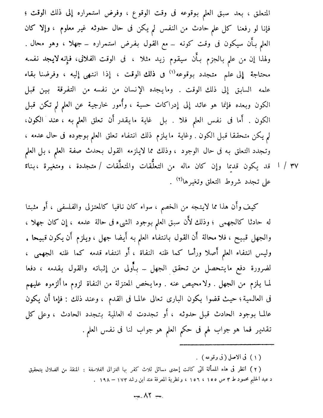 وَلِهَذَا إِن من علم بِالْجَزْمِ بِأَن سيقوم زيد مثلا فِي الْوَقْت الفلانى فَإِنَّهُ لَا يجد نَفسه محتاجة إِلَى علم متجدد بِوُقُوعِهِ فِي ذَلِك الْوَقْت اذا انْتهى اليه وفرضنا بَقَاء علمه السَّابِق الى ذَلِك الْوَقْت وَمَا يجده الْإِنْسَان من نَفسه من التَّفْرِقَة بَين قبل الْكَوْن وَبعده فَإِنَّمَا هُوَ عَائِد إِلَى إدراكات حسية وَأُمُور خارجية عَن الْعلم لم تكن قبل الْكَوْن أما فِي نفس الْعلم فَلَا بل غَايَة مَا يقدر ان تعلق الْعلم بِهِ عِنْد الْكَوْن لم يكن متحققا قبل الْكَوْن وَغَايَة مَا يلْزم ذَلِك انْتِفَاء تعلق الْعلم بِوُجُودِهِ فِي حَال عَدمه وتجدد التَّعَلُّق بِهِ فِي حَال الْوُجُود وَذَلِكَ مِمَّا لَا يلْزمه القَوْل بِحَدَث صفة الْعلم بل الْعلم قد يكون قَدِيما وَإِن كَانَ مَا لَهُ من التعلقات والمتعلقات متجدده ومتغيرة بِنَاء على تجدّد شُرُوط التَّعَلُّق وتغيرها
