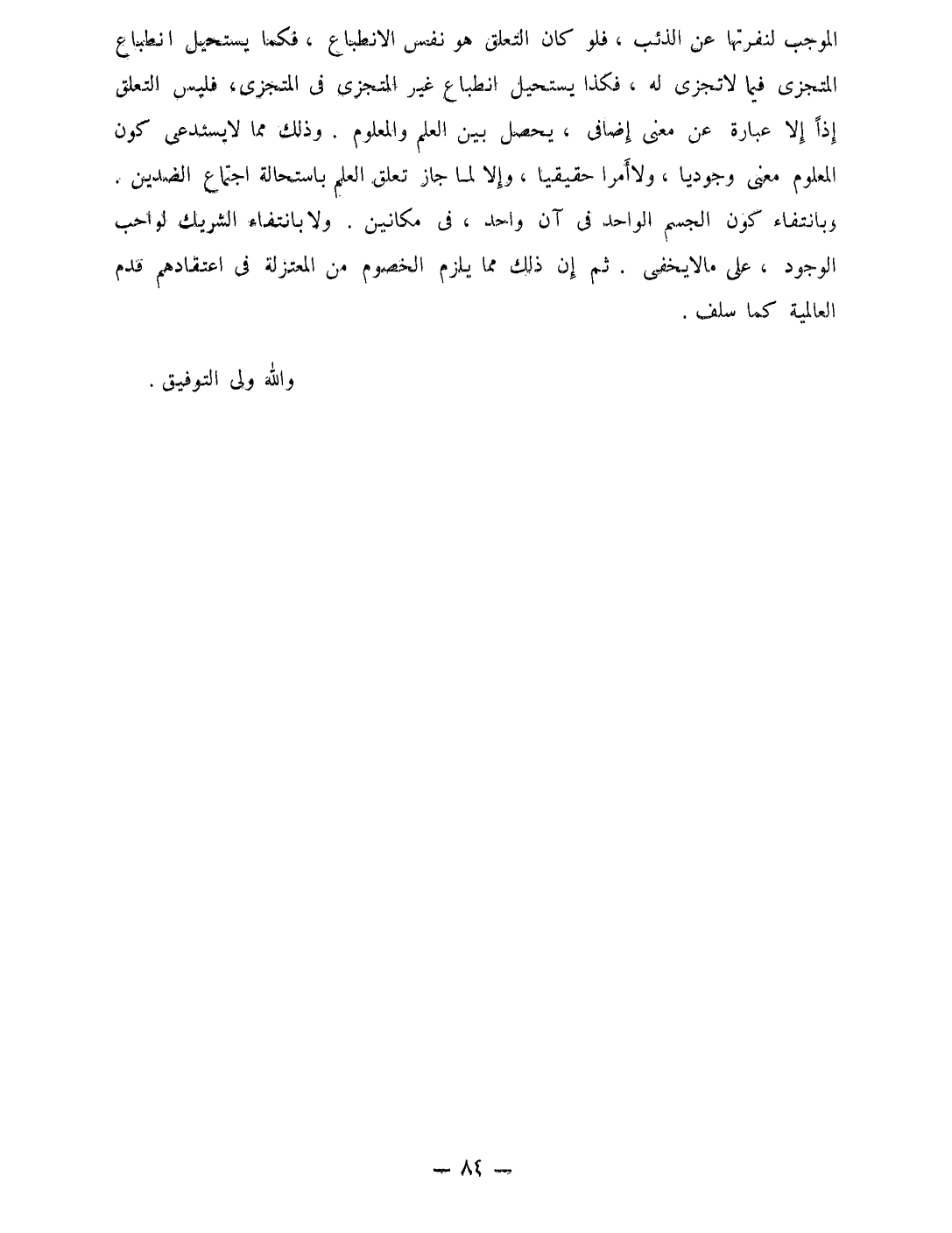 الْمُوجب لنفرتها عَن الذِّئْب فَلَو كَانَ التَّعَلُّق هُوَ نفس الانطباع فَكَمَا يَسْتَحِيل انطباع المتجزى فِيمَا لَا تجزى لَهُ فَكَذَا يَسْتَحِيل انطباع غير المتجزى فِي المتجزي فَلَيْسَ التَّعَلُّق إِذا إِلَّا عبارَة عَن معنى إضافى يحصل بَين الْعلم والمعلوم وَذَلِكَ مِمَّا لَا يَسْتَدْعِي كَون الْمَعْلُوم معنى وجوديا وَلَا أمرا حَقِيقِيًّا وَإِلَّا لما جَازَ تعلق الْعلم باستحالة اجْتِمَاع الضدين