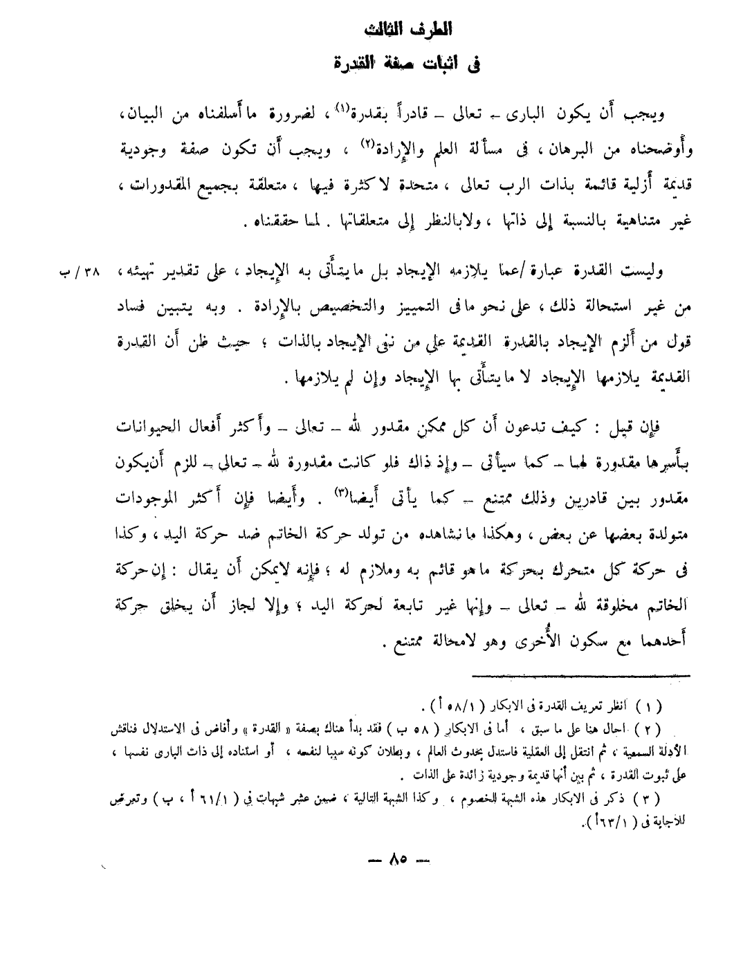 وَيجب أَن يكون البارى تَعَالَى قَادِرًا بقدرة لضَرُورَة مَا أسلفناه من الْبَيَان واوضحنا من الْبُرْهَان فِي مَسْأَلَة الْعلم والإرادة وَيجب أَن تكون صفة وجودية قديمَة أزلية قَائِمَة بِذَات الرب تعإلى متحدة لَا كَثْرَة فِيهَا مُتَعَلقَة بِجَمِيعِ المقدورات غير متناهية بِالنِّسْبَةِ إِلَى ذَاتهَا وَلَا بِالنّظرِ إِلَى متعلقاتها لما حققناه