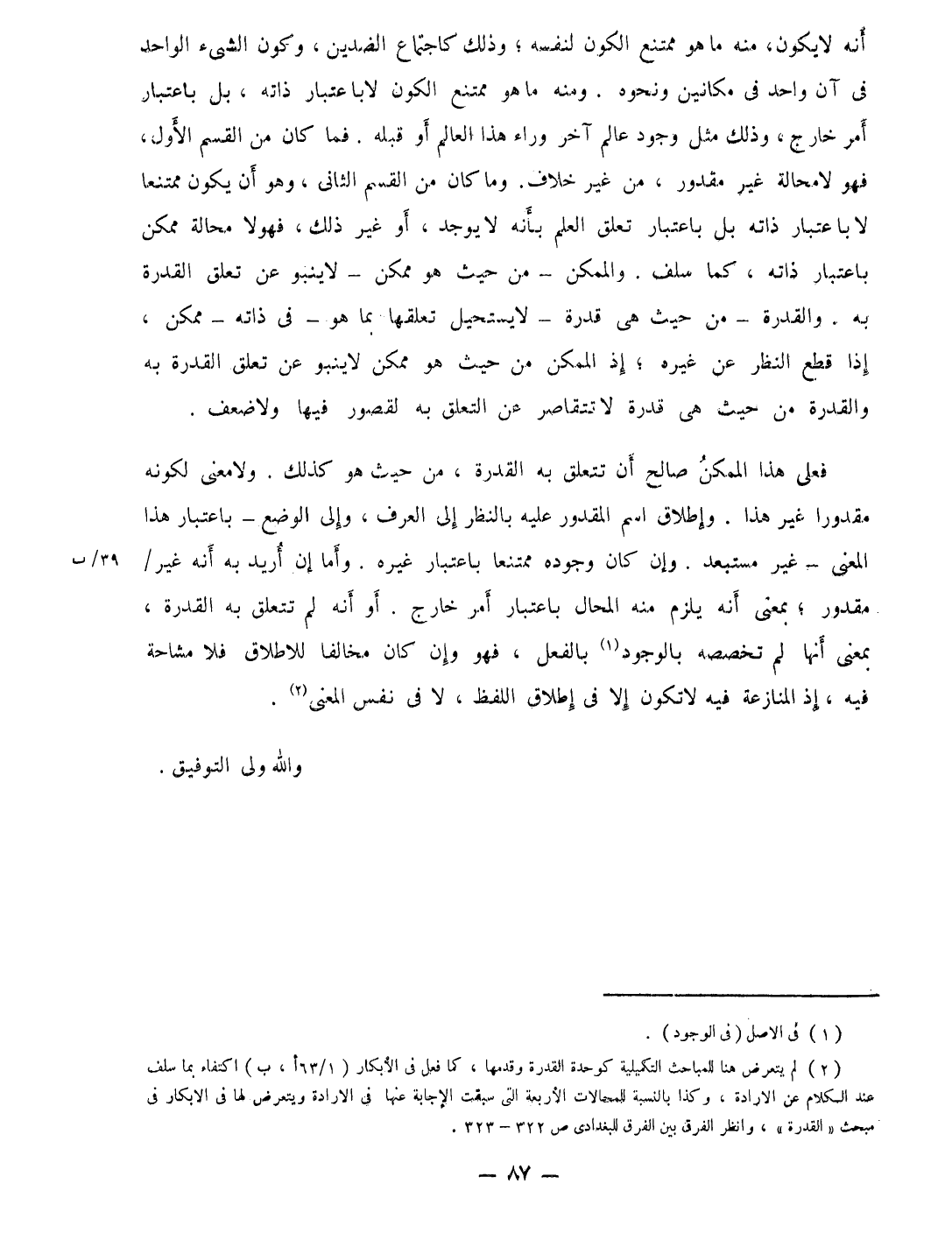 فعلى هَذَا الْمُمكن صَالح أَن تتَعَلَّق بِهِ الْقُدْرَة من حَيْثُ هُوَ كَذَلِك وَلَا معنى لكَونه مَقْدُورًا غير هَذَا وَإِطْلَاق اسْم الْمَقْدُور عَلَيْهِ بِالنّظرِ إِلَى الْعرف وَإِلَى الْوَضع بِاعْتِبَار هَذَا الْمَعْنى غير مستبعد وَإِن كَانَ وجوده مُمْتَنعا بِاعْتِبَار غَيره وَأما إِن أُرِيد بِهِ أَنه غير مَقْدُور بِمَعْنى أَنه يلْزم مِنْهُ الْمحَال بِاعْتِبَار أَمر خَارج أَو أَنه لم تتَعَلَّق بِهِ الْقُدْرَة بِمَعْنى أَنَّهَا لم تخصصه بالوجود بِالْفِعْلِ فَهُوَ وَإِن كَانَ مُخَالفا للاطلاق فَلَا مشاحة فِيهِ إِذْ الْمُنَازعَة فِيهِ لَا تكون إِلَّا فِي إِطْلَاق اللَّفْظ لَا فِي نفس الْمَعْنى وَالله ولى التَّوْفِيق
