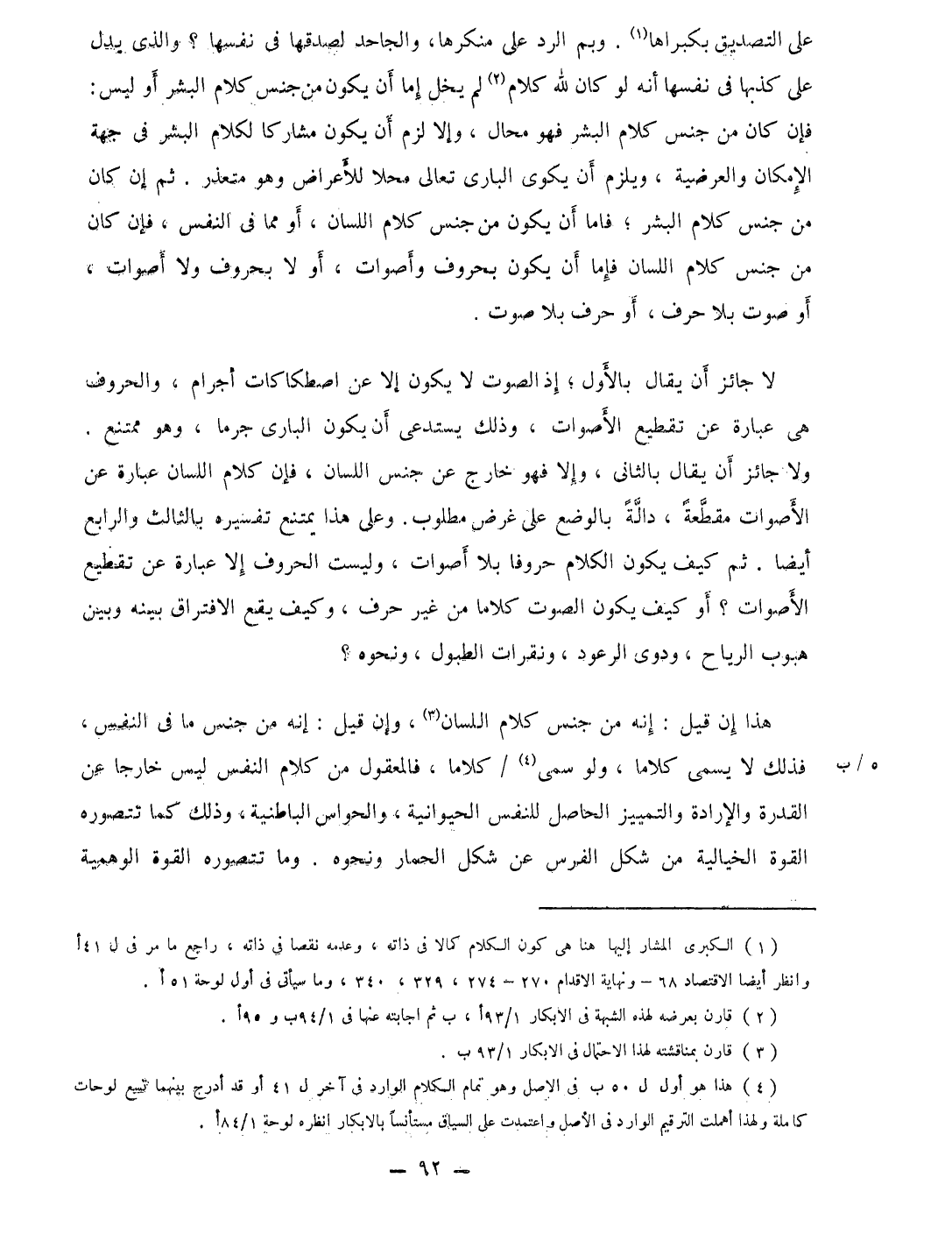 لَا جَائِز أَن يُقَال بِالْأولِ إِذْ الصَّوْت لَا يكون إِلَّا عَن اصطكاكات أجرام والحروف هِيَ عبارَة عَن تقطيع الْأَصْوَات وَذَلِكَ يستدعى أَن يكون البارى جرما وَهُوَ مُمْتَنع وَلَا جَائِز أَن يُقَال بالثانى وَإِلَّا فَهُوَ خَارج عَن جنس اللِّسَان فَإِن كَلَام اللِّسَان عبارَة عَن الْأَصْوَات مقطعَة دَالَّة بِالْوَضْعِ على غَرَض مَطْلُوب وعَلى هَذَا يمْتَنع تَفْسِيره بالثالث وَالرَّابِع أَيْضا ثمَّ كَيفَ يكون الْكَلَام حروفا بِلَا أصوات وَلَيْسَت الْحُرُوف إِلَّا عبارَة عَن تقطيع الْأَصْوَات أَو كَيفَ يكون الصَّوْت كلَاما من غير حرف وَكَيف يَقع الِافْتِرَاق بَينه وَبَين هبوب الرِّيَاح ودوى الرعود ونقرات الطبول وَنَحْوه