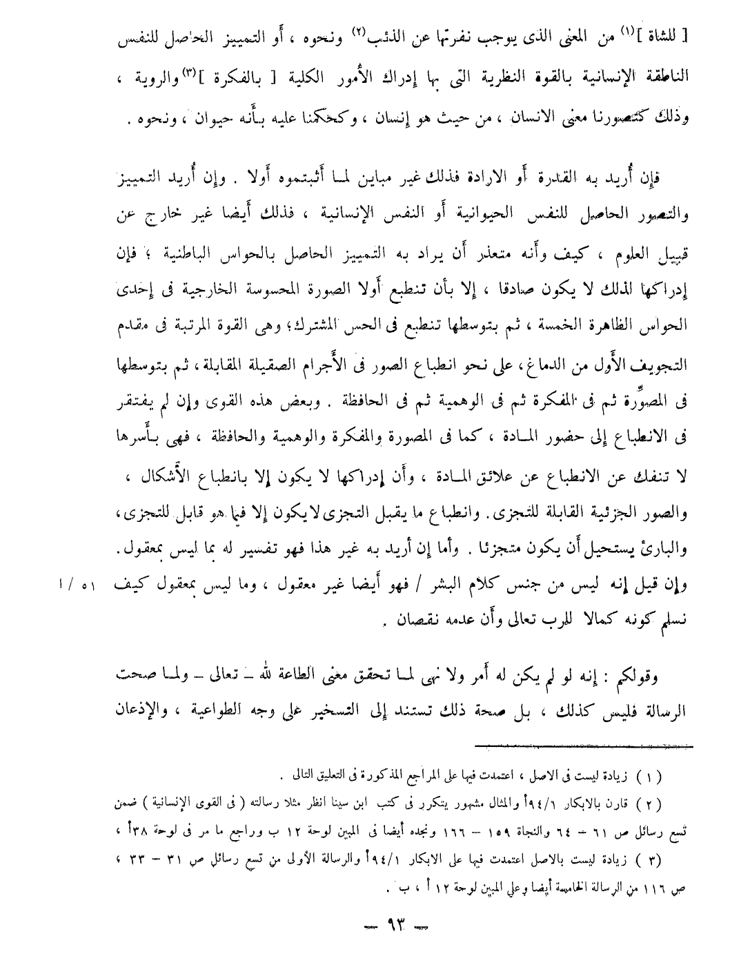 للشاة من الْمَعْنى الَّذِي يُوجب نفرتها عَن الذِّئْب وَنَحْوه أَو للتمييز الْحَاصِل للنَّفس والناطقة الإنسانية بِالْقُوَّةِ النظرية الَّتِى بهَا إِدْرَاك الْأُمُور الْكُلية بالفكرة والروية وَذَلِكَ كتصورنا معنى الْإِنْسَان من حَيْثُ هُوَ إِنْسَان وكحكمنا عَلَيْهِ بِأَنَّهُ حَيَوَان وَنَحْوه