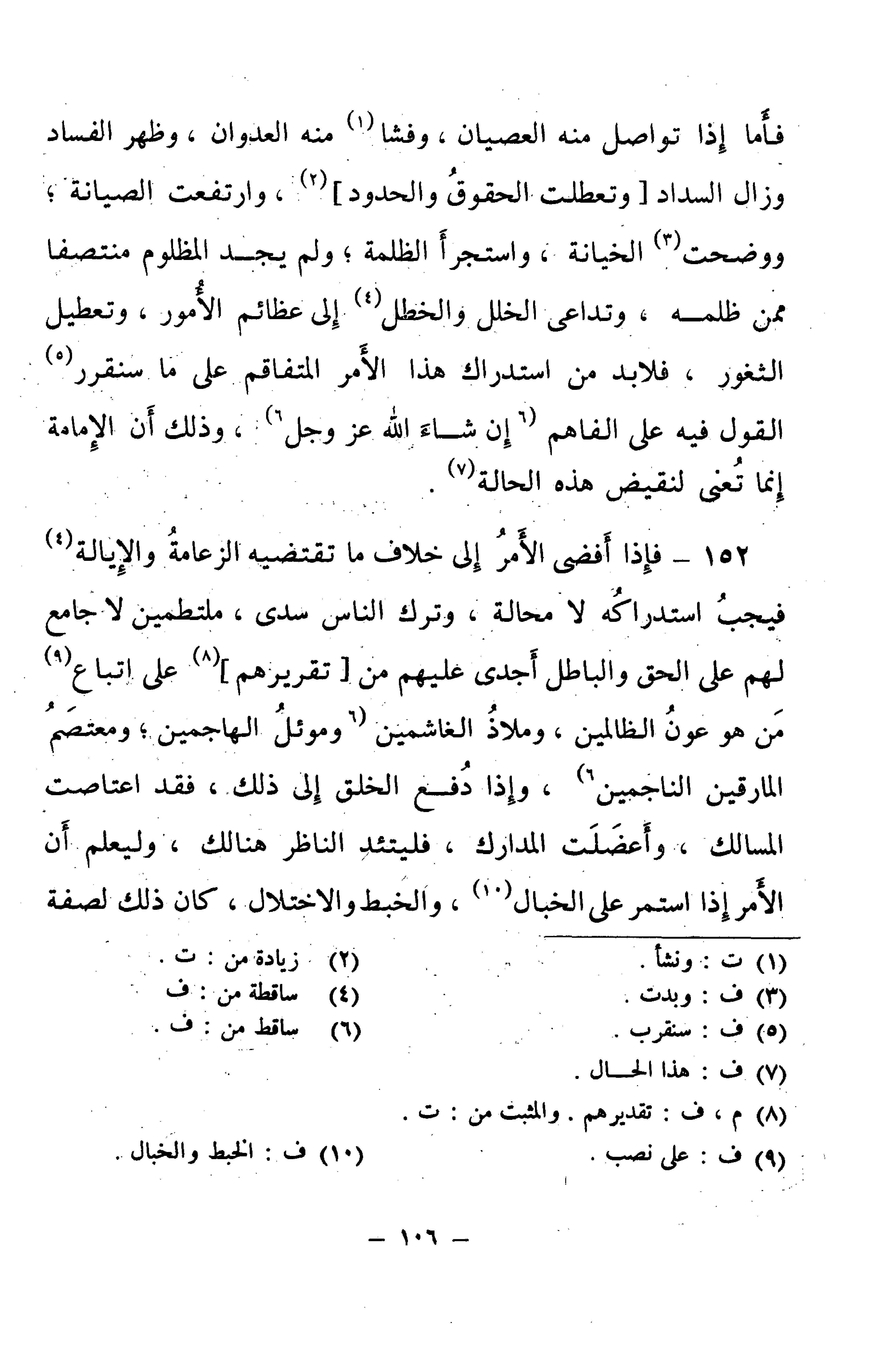 152 - فَإِذَا أَفْضَى الْأَمْرُ إِلَى خِلَافِ مَا تَقْتَضِيهِ الزَّعَامَةُ وَالْإِيَالَةُ، فَيَجِبُ اسْتِدْرَاكُهُ لَا مَحَالَةَ، وَتَرْكُ النَّاسِ سُدًى، مُلْتَطِمِينَ لَا جَامِعَ لَهُمْ عَلَى الْحَقِّ وَالْبَاطِلِ أَجْدَى عَلَيْهِمْ مِنْ تَقْرِيرِهِمْ عَلَى اتِّبَاعِ مَنْ هُوَ عَوْنُ الظَّالِمِينَ، وَمَلَاذُ الْغَاشِمِينَ، وَمَوْئِلُ الْهَاجِمِينَ، وَمُعْتَصَمُ الْمَارِقِينَ النَّاجِمِينَ، وَإِذَا دُفِعَ الْخَلْقُ إِلَى ذَلِكَ، فَقَدِ اعْتَاصَتِ الْمَسَالِكُ، وَأَعْضَلَتِ الْمَدَارِكُ، فَلْيَتَّئِدِ النَّاظِرُ هُنَالِكَ، وَلْيَعْلَمْ أَنَّ الْأَمْرَ إِذَا اسْتَمَرَّ عَلَى الْخَبَالِ، وَالْخَبْطِ وَالِاخْتِلَالِ، كَانَ ذَلِكَ لِصِفَةٍ
