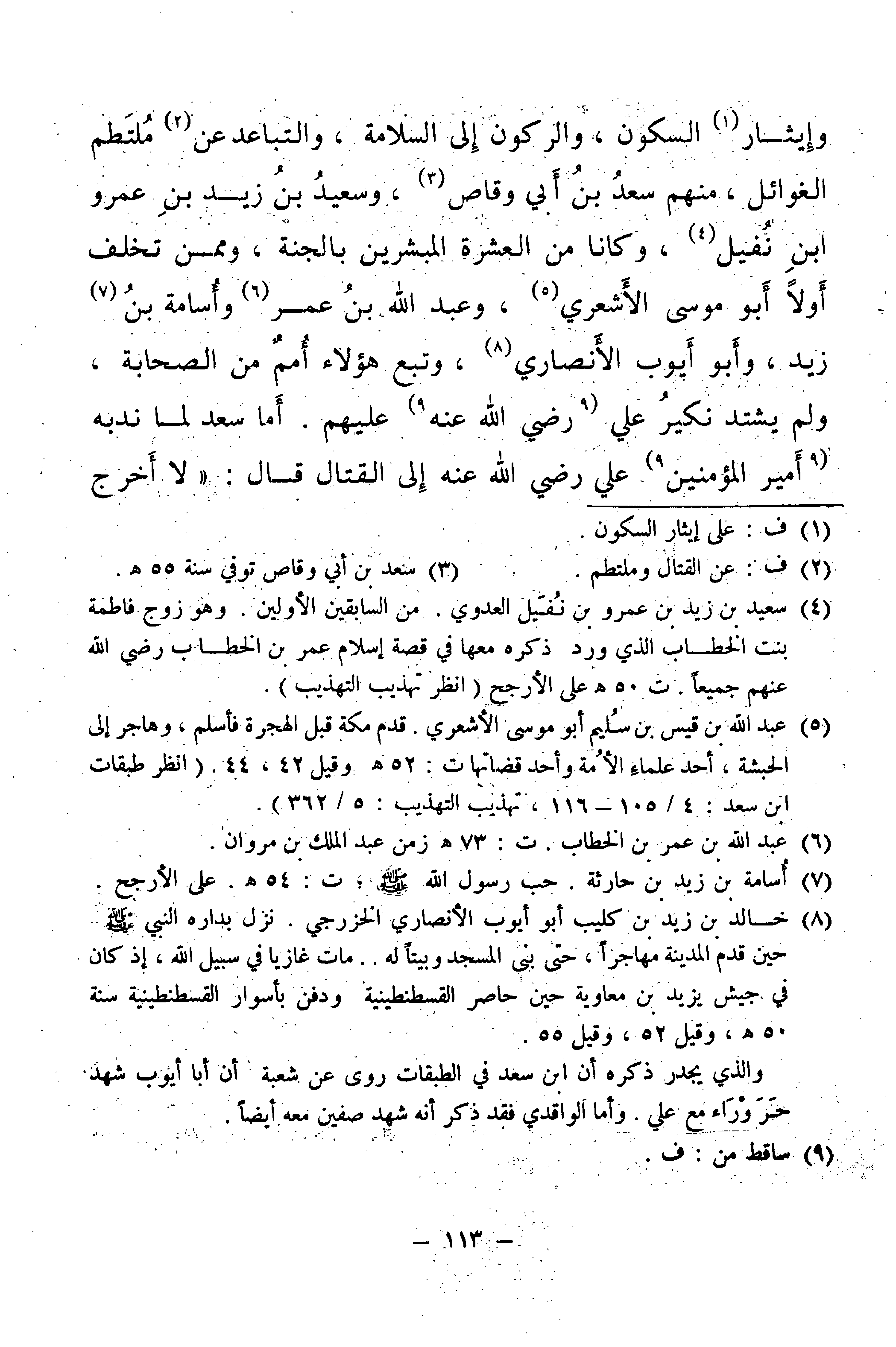 وَإِيثَارِ السُّكُونِ، لِرُكُونٍ إِلَى السَّلَامَةِ، وَالتَّبَاعُدِ عَنْ مُلْتَطَمِ الْغَوَائِلِ، مِنْهُمْ سَعْدُ بْنُ أَبِي وَقَّاصٍ، وَسَعِيدُ بْنُ زَيْدِ بْنِ عَمْرِو بْنِ نُفَيْلٍ، وَكَانَا مِنَ الْعَشَرَةِ الْمُبَشَّرِينَ بِالْجَنَّةِ، وَمِمَّنْ تَخَلَّفَ أَوَّلًا أَبُو مُوسَى الْأَشْعَرِيُّ، وَعَبْدُ اللَّهِ بْنُ عُمَرَ، وَأُسَامَةُ بْنُ زَيْدٍ، وَأَبُو أَيُّوبَ الْأَنْصَارِيُّ، وَتَبِعَ هَؤُلَاءِ أُمَمٌ مِنَ الصَّحَابَةِ، وَلَمْ يَشْتَدَّ نَكِيرُ عَلِيٍّ - رَضِيَ اللَّهُ عَنْهُ - عَلَيْهِمْ. أَمَّا سَعْدٌ لَمَّا نَدَبَهُ أَمِيرُ الْمُؤْمِنِينَ عَلِيٌّ - رَضِيَ اللَّهُ عَنْهُ - إِلَى الْقِتَالِ قَالَ: " لَا أَخْرُجُ
