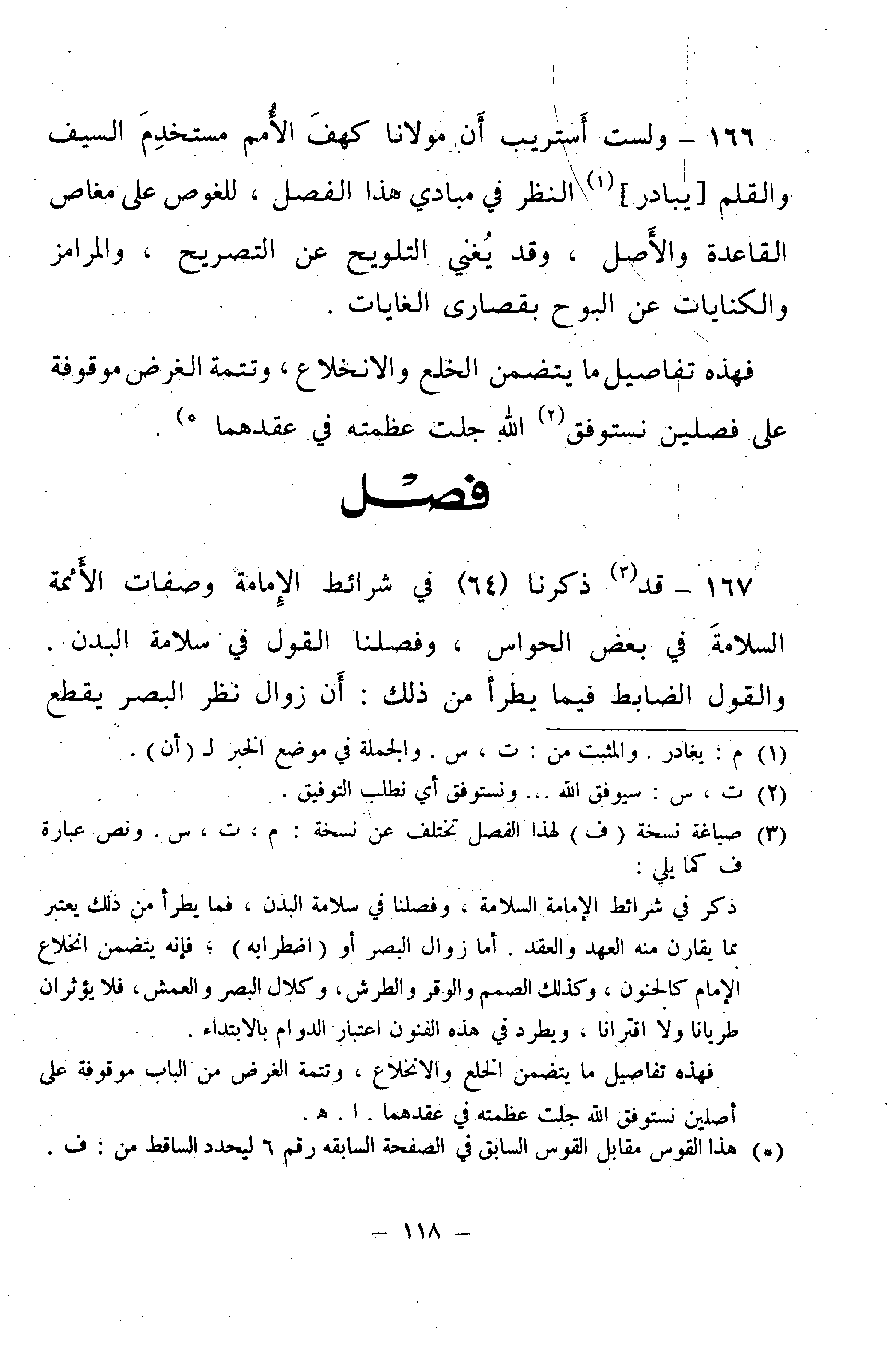 166 - وَلَسْتُ أَسَتَرِيبُ أَنَّ مَوْلَانَا كَهْفَ الْأُمَمِ مُسْتَخْدِمَ السَّيْفِ وَالْقَلَمِ يُبَادِرُ النَّظَرَ فِي مَبَادِي هَذَا الْفَصْلِ ; لِلْغَوْصِ عَلَى مَغَاصِ الْقَاعِدَةِ وَالْأَصْلِ، وَقَدْ يُغْنِي التَّلْوِيحُ عَنِ التَّصْرِيحِ، وَالْمَرَامِزُ وَالْكِنَايَاتُ عَنِ الْبَوْحِ بِقُصَارَى الْغَايَاتِ.
