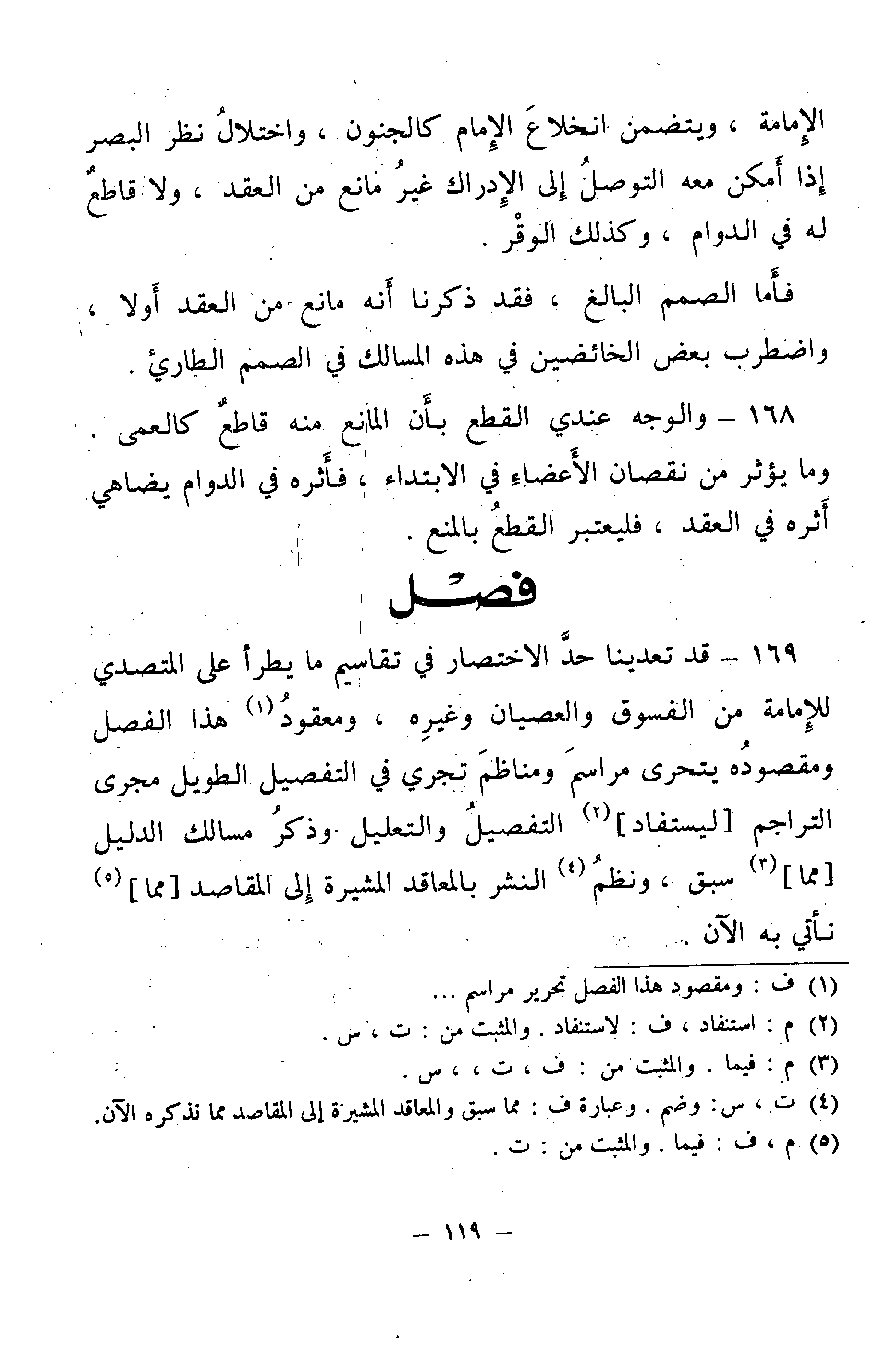 169 - قَدْ تَعَدَّيْنَا حَدَّ الِاخْتِصَارِ فِي تَقَاسِيمِ مَا يَطْرَأُ عَلَى الْمُتَصَدِّي لِلْإِمَامَةِ مِنَ الْفُسُوقِ وَالْعِصْيَانِ وَغَيْرِهِ، وَمَعْقُودُ هَذَا الْفَصْلِ وَمَقْصُودُهُ يَتَحَرَّى مَرَاسِمَ وَمَنَاظِمَ تَجْرِي فِي التَّفْصِيلِ الطَّوِيلِ مَجْرَى التَّرَاجِمِ لِيُسْتَفَادَ التَّفْصِيلُ وَالتَّعْلِيلُ وَذِكْرُ مَسَالِكِ الدَّلِيلِ مِمَّا سَبَقَ، وَنَظْمُ النَّشْرِ بِالْمَعَاقِدِ الْمُشِيرَةِ إِلَى الْمَقَاصِدِ مِمَّا نَأْتِي بِهِ الْآنَ.