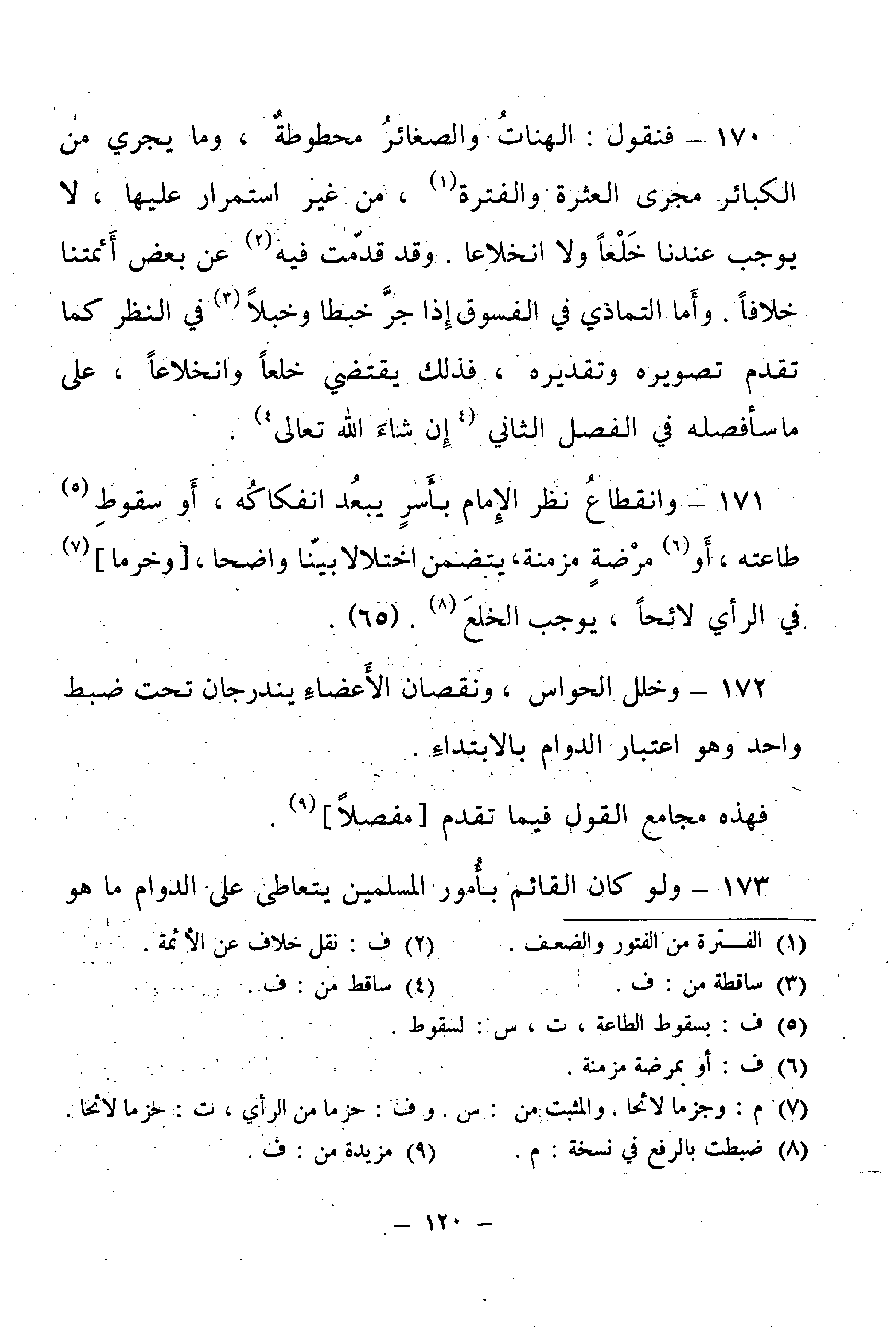 171 - وَانْقِطَاعُ نَظَرِ الْإِمَامِ بِأَسْرٍ بَعْدَ انْفِكَاكِهِ، أَوْ بِسُقُوطِ طَاعَتِهِ، أَوْ مَرْضَةٍ مُزْمِنَةٍ، يَتَضَمَّنُ اخْتِلَالًا بَيِّنًا وَاضِحًا، وَخَرْمًا فِي الرَّأْيِ لَائِحًا، يُوجِبُ الْخَلْعَ.
