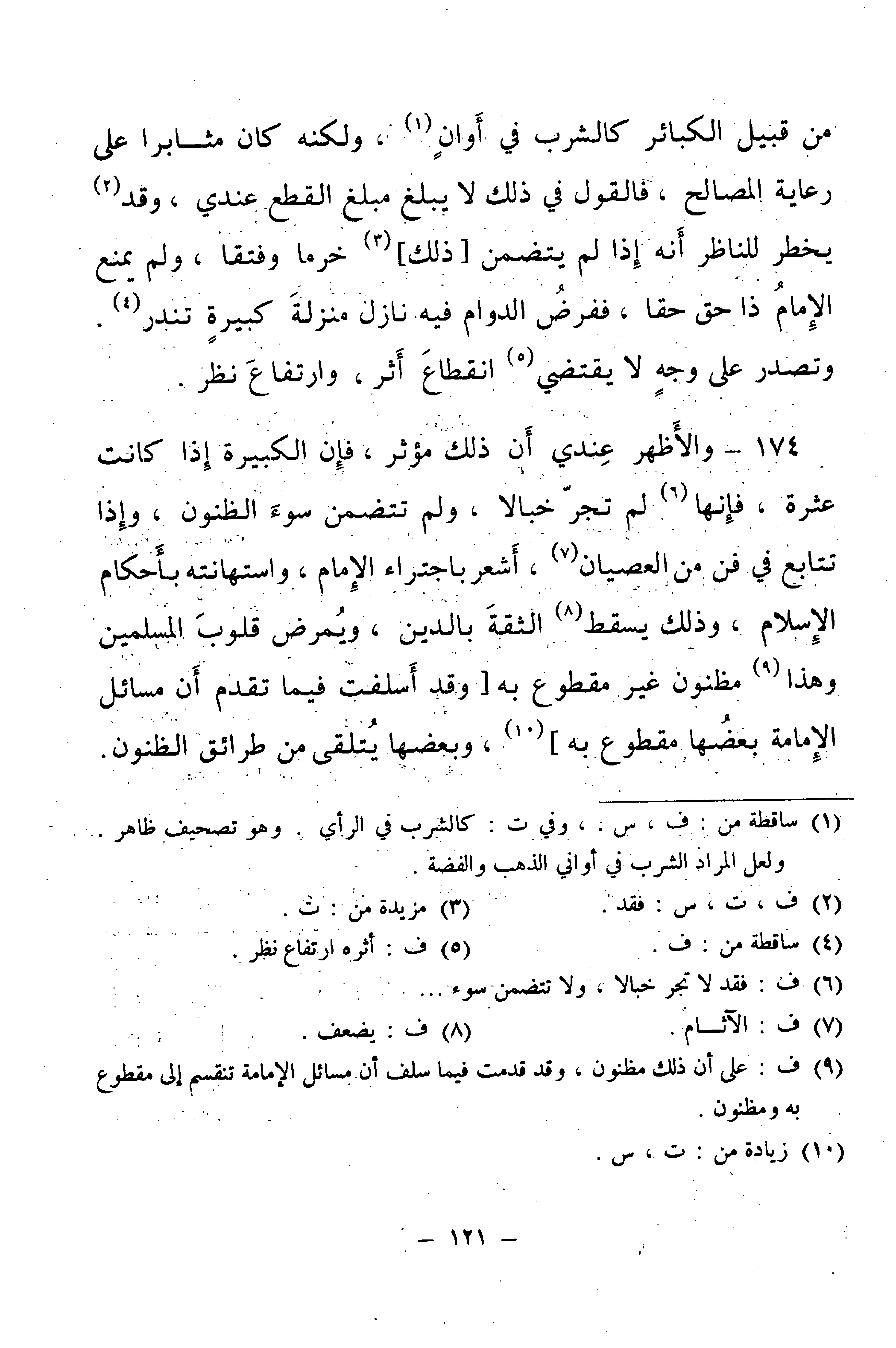 174 - وَالْأَظْهَرُ عِنْدِي أَنَّ ذَلِكَ مُؤَثِّرٌ، فَإِنَّ الْكَبِيرَةَ إِذَا كَانَتْ عَثْرَةً، فَإِنَّهَا لَمْ تَجُرَّ خَبَالًا، وَلَمْ تَتَضَمَّنْ سُوءَ الظُّنُونِ، وَإِذَا تَتَابَعَ فِي فَنٍّ مِنَ الْعِصْيَانِ، أَشْعَرَ بِاجْتِرَاءِ الْإِمَامِ، وَاسْتِهَانَتِهِ بِأَحْكَامِ الْإِسْلَامِ، وَذَلِكَ يُسْقِطُ الثِّقَةَ بِالدِّينِ، وَيُمْرِضُ قُلُوبَ الْمُسْلِمِينَ، وَهَذَا مَظْنُونٌ غَيْرُ مَقْطُوعٍ بِهِ، وَقَدْ أَسْلَفْتُ فِيمَا تَقَدَّمَ أَنَّ مَسَائِلَ الْإِمَامَةِ بَعْضُهَا مَقْطُوعٌ بِهِ، وَبَعْضُهَا يُتَلَقَّى مِنْ طَرَائِقِ الظُّنُونِ