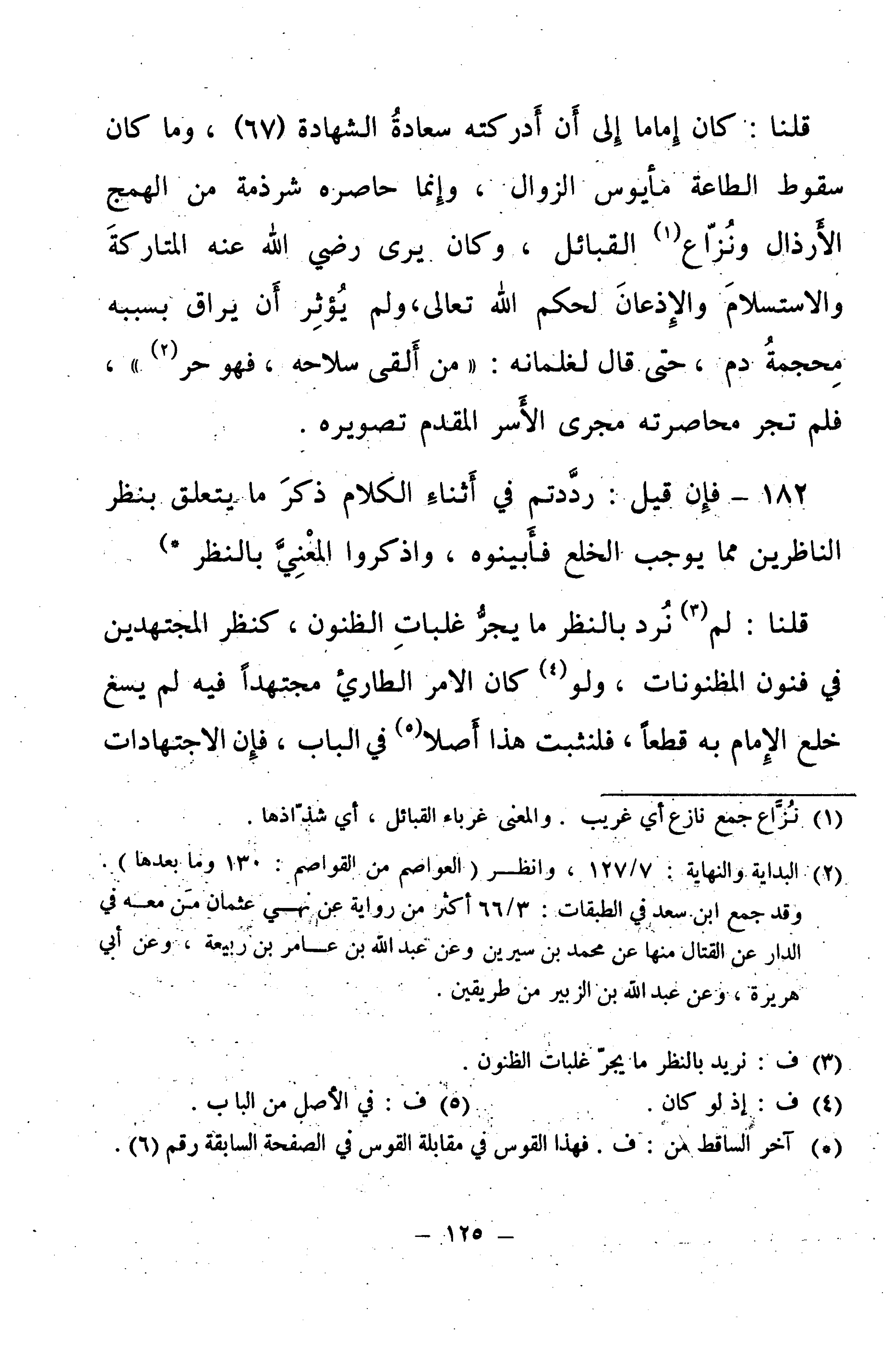 قُلْنَا كَانَ إِمَامًا إِلَى أَنْ أَدْرَكَتْهُ سَعَادَةُ الشَّهَادَةِ، وَمَا كَانَ سُقُوطُ الطَّاعَةِ مَأْيُوسَ الزَّوَالِ، وَإِنَّمَا حَاصَرَهُ شِرْذِمَةٌ مِنَ الْهَمَجِ الْأَرْذَالِ، وَنُزَّاعِ الْقَبَائِلِ، وَكَانَ يَرَى - رَضِيَ اللَّهُ عَنْهُ - الْمُتَارَكَةَ وَالِاسْتِسْلَامَ وَالْإِذْعَانَ لِحُكْمِ اللَّهِ تَعَالَى، وَلَمْ يُؤْثِرْ أَنْ يُرَاقَ بِسَبَبِهِ مِحْجَمَةُ دَمٍ، حَتَّى قَالَ لِغِلْمَانِهِ: " مَنْ أَلْقَى سِلَاحَهُ، فَهُوَ حُرٌّ " فَلَمْ تَجْرِ مُحَاصَرَتُهُ مَجْرَى الْأَسْرِ الْمُقَدَّمِ تَصْوِيرُهُ.