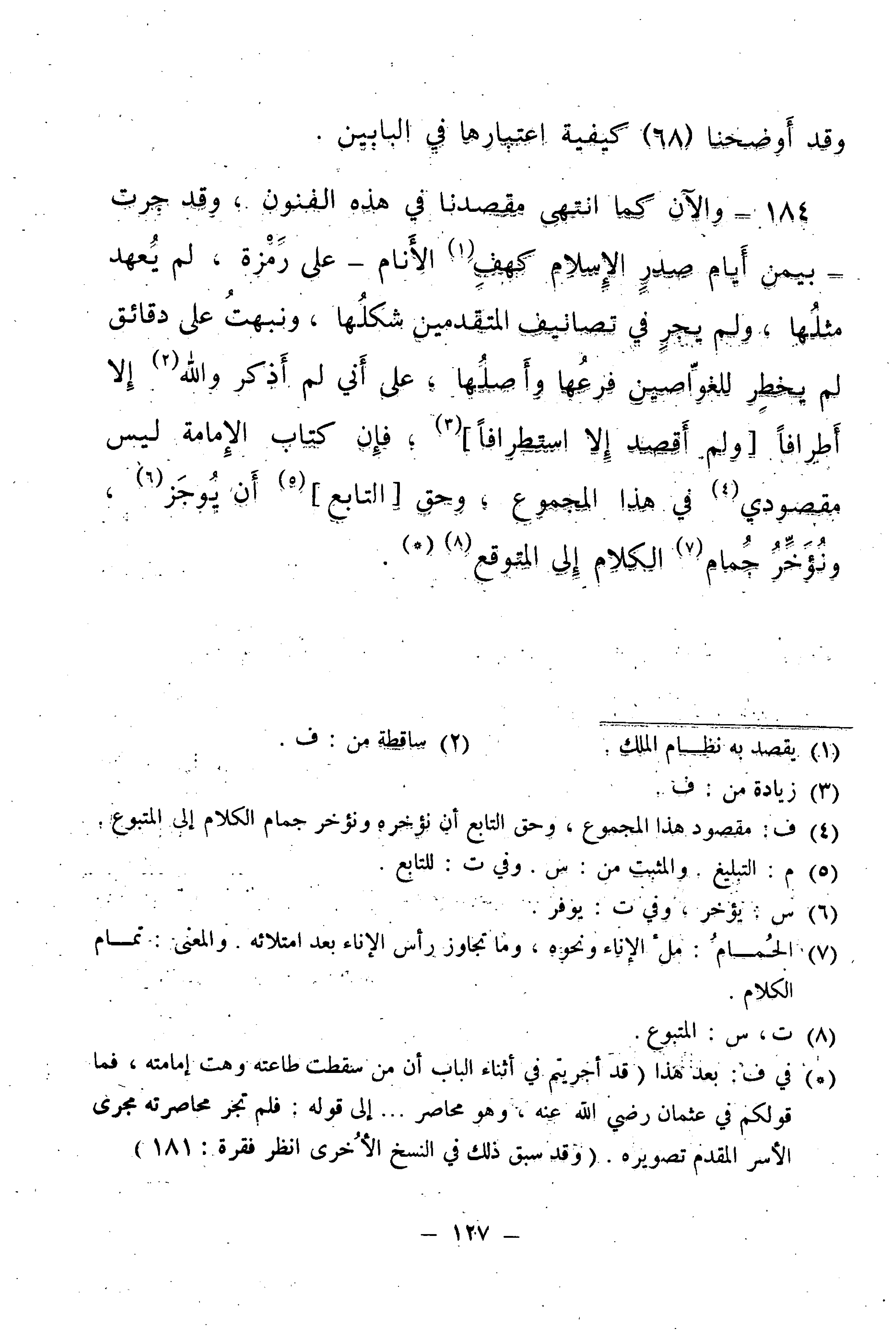 184 - وَالْآنَ كَمَا انْتَهَى مَقْصِدُنَا فِي هَذِهِ الْفُنُونِ، وَقَدْ جَرَتْ بِيُمْنِ أَيَّامِ صَدْرِ الْإِسْلَامِ كَهْفِ الْأَنَامِ عَلَى رَمْزَةٍ، لَمْ يُعْهَدْ مِثْلُهَا، وَلَمْ يَجْرِ فِي تَصَانِيفِ الْمُتَقَدِّمِينَ شَكْلُهَا، وَنَبَّهْتُ عَلَى دَقَائِقَ لَمْ يَخْطِرْ لِلْغَوَّاصِينَ فَرْعُهَا وَأَصْلُهَا، عَلَى أَنِّي لَمْ أَذْكُرْ - وَاللَّهِ - إِلَّا أَطْرَافًا، وَلَمْ أَقْصِدْ إِلَّا اسْتِطْرَافًا، فَإِنَّ كِتَابَ الْإِمَامَةِ لَيْسَ مَقْصُودِي فِي هَذَا الْمَجْمُوعِ، وَحَقُّ التَّابِعِ أَنْ يُوجَزَ، وَنُؤَخِّرُ جُمَامَ الْكَلَامِ إِلَى الْمُتَوَقَّعِ.