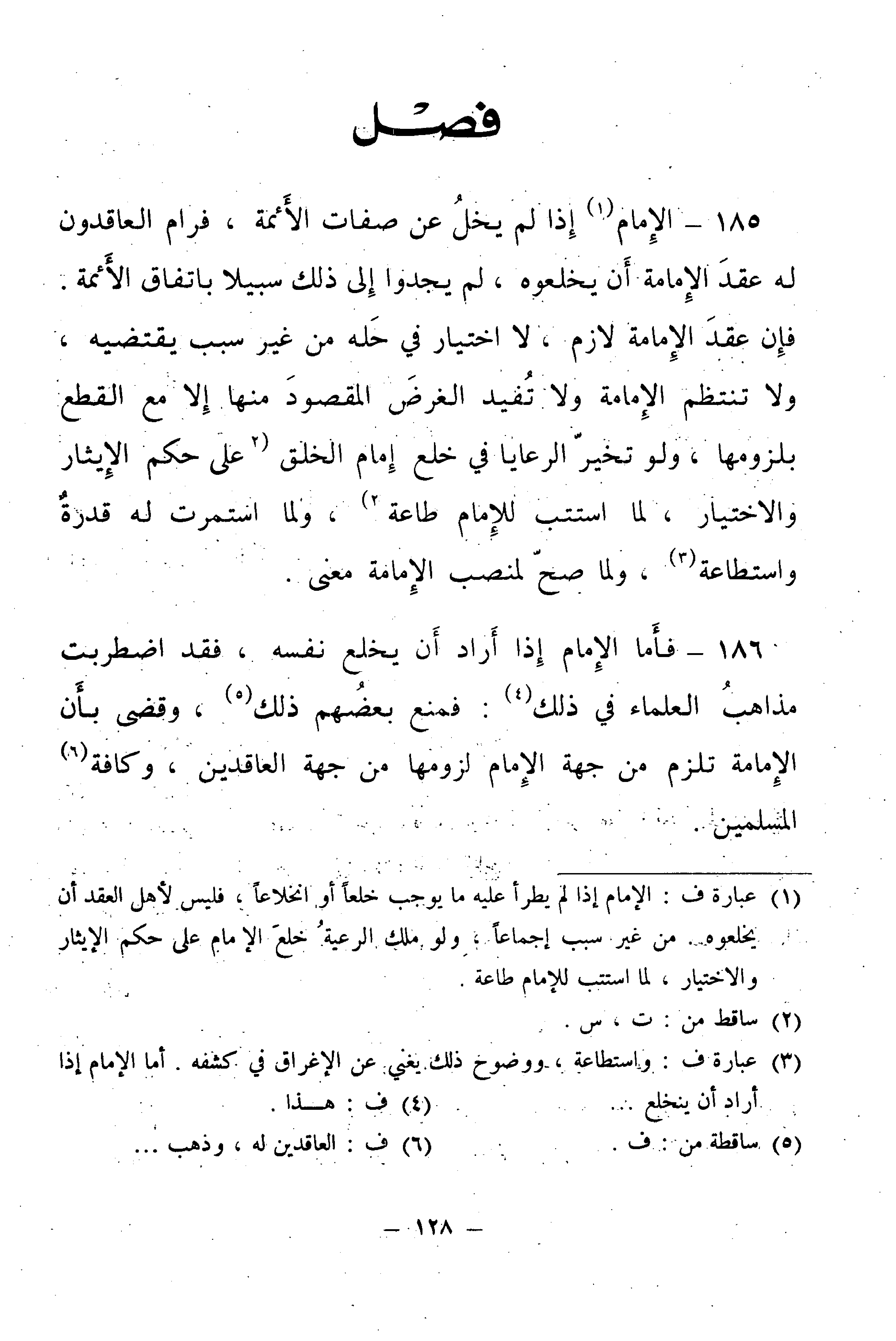 185 - الْإِمَامُ إِذَا لَمْ يَخْلُ عَنْ صِفَاتِ الْأَئِمَّةِ، فَرَامَ الْعَاقِدُونَ لَهُ عَقْدَ الْإِمَامَةِ أَنْ يَخْلَعُوهُ، لَمْ يَجِدُوا إِلَى ذَلِكَ سَبِيلًا بِاتِّفَاقِ الْأَئِمَّةِ. فَإِنَّ عَقْدَ الْإِمَامَةِ لَازِمٌ، لَا اخْتِيَارَ فِي حَلِّهِ مِنْ غَيْرِ سَبَبٍ يَقْتَضِيهِ، وَلَا تَنْتَظِمُ الْإِمَامَةُ، وَلَا تُفِيدُ الْغَرَضَ الْمَقْصُودَ مِنْهَا إِلَّا مَعَ الْقَطْعِ بِلُزُومِهَا، وَلَوْ تَخَيَّرَ الرَّعَايَا فِي خَلْعِ إِمَامٍ الْخُلُقَ عَلَى حُكْمِ الْإِيثَارِ وَالِاخْتِيَارِ، لَمَا اسْتَتَبَّ لِلْإِمَامِ طَاعَةٌ، وَلِمَا اسْتَمَرَّتْ لَهُ قُدْرَةٌ وَاسْتِطَاعَةٌ، وَلَمَا صَحَّ لِمَنْصِبِ الْإِمَامَةِ مَعْنًى.