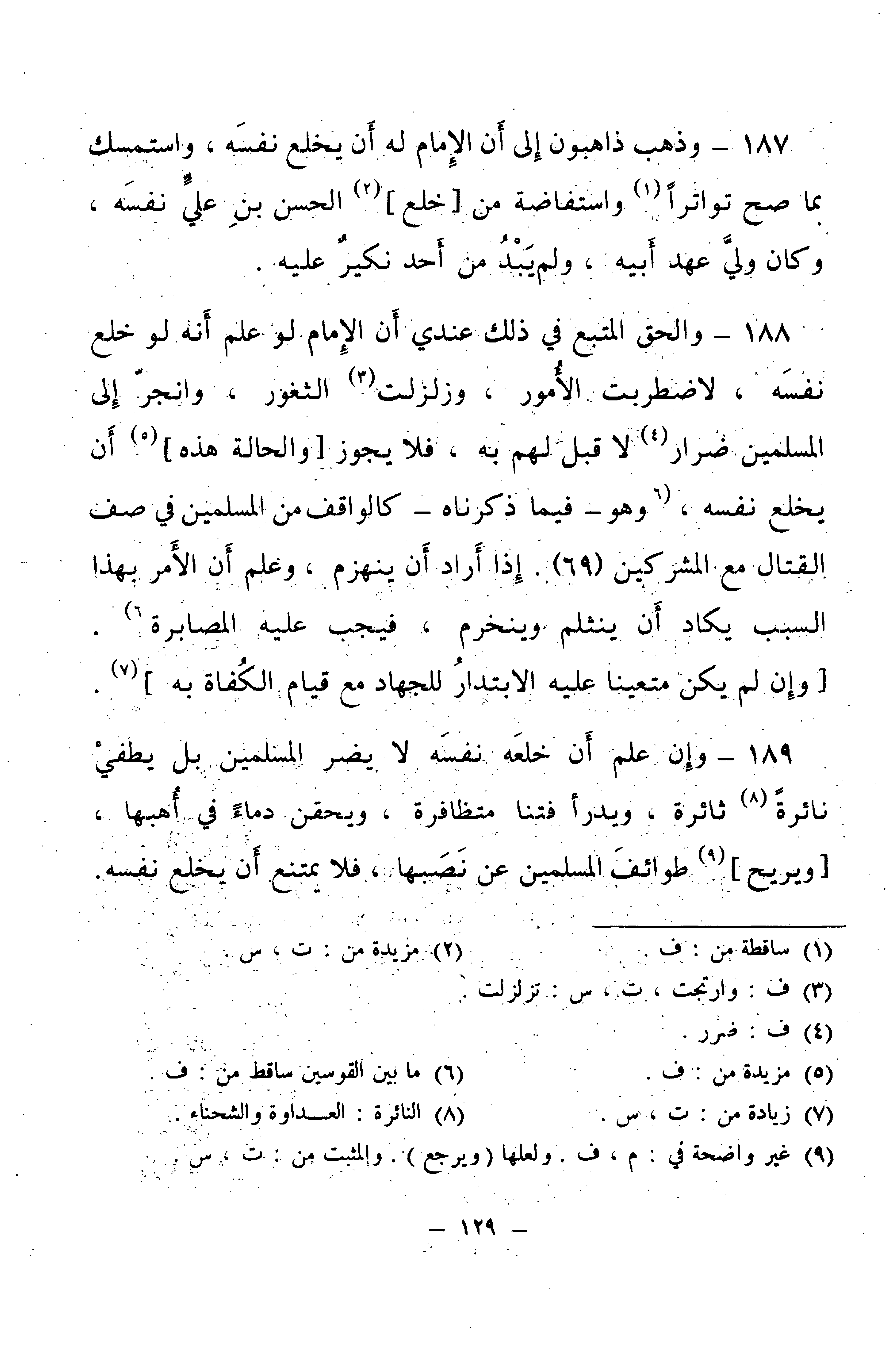 187 - وَذَهَبَ ذَاهِبُونَ إِلَى أَنَّ الْإِمَامَ لَهُ أَنْ يَخْلَعَ نَفْسَهُ، وَاسْتَمْسَكَ بِمَا صَحَّ تَوَاتُرًا وَاسْتِفَاضَةً مِنْ خَلْعِ الْحَسَنِ بْنِ عَلِيٍّ نَفْسَهُ، وَكَانَ وَلِيَّ عَهْدِ أَبِيهِ، وَلَمْ يَبْدُ مِنْ أَحَدٍ نَكِيرٌ عَلَيْهِ.