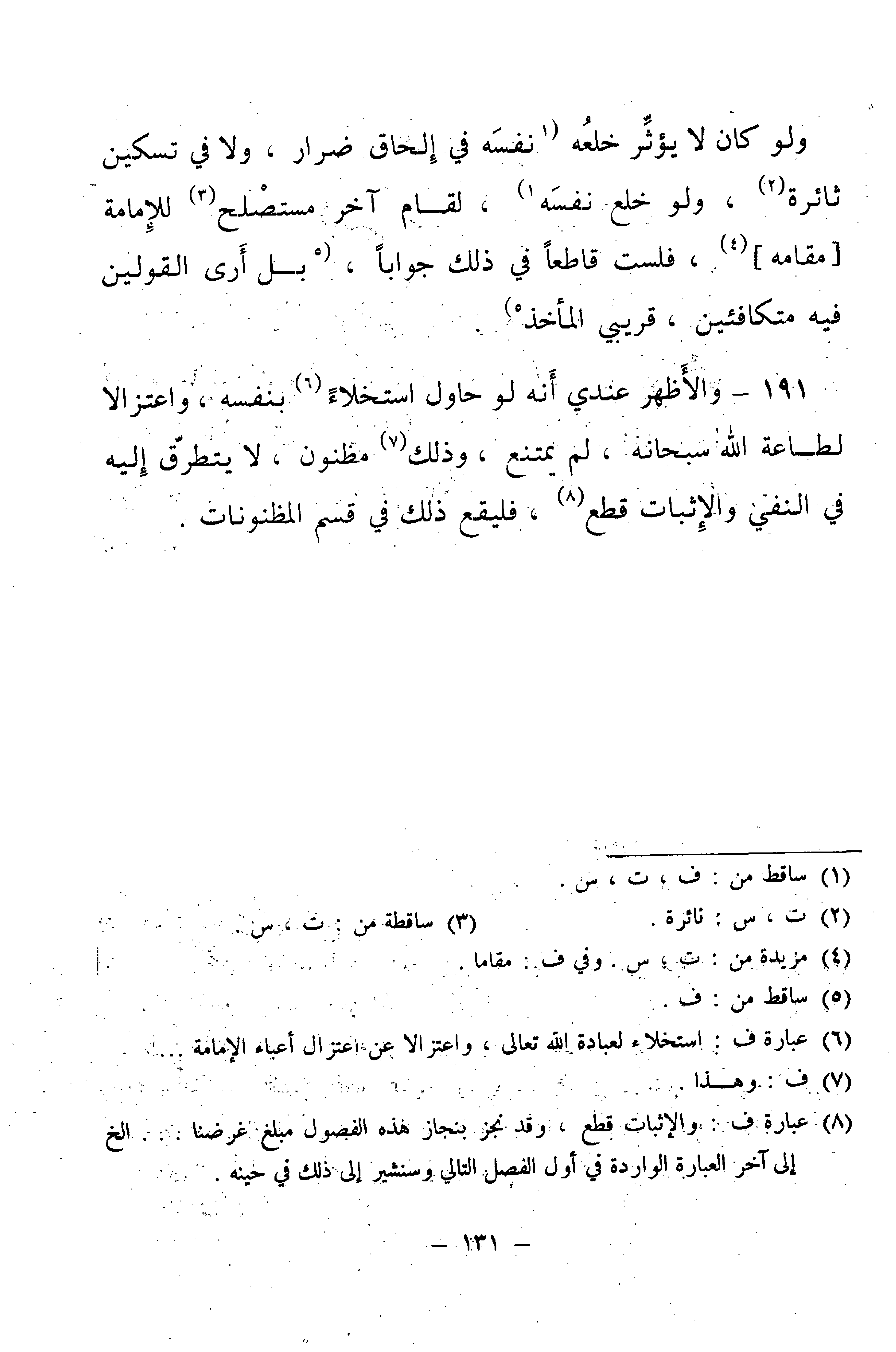 191 - وَالْأَظْهَرُ عِنْدِي أَنَّهُ لَوْ حَاوَلَ اسْتِخْلَاءً بِنَفْسِهِ، وَاعْتِزَالًا لِطَاعَةِ اللَّهِ سُبْحَانَهُ، لَمْ يَمْتَنِعْ، وَذَلِكَ مَظْنُونٌ، لَا يَتَطَرَّقُ إِلَيْهِ فِي النَّفْيِ وَالْإِثْبَاتِ قَطْعٌ، فَلْيَقَعْ ذَلِكَ فِي قِسْمِ الْمَظْنُونَاتِ.