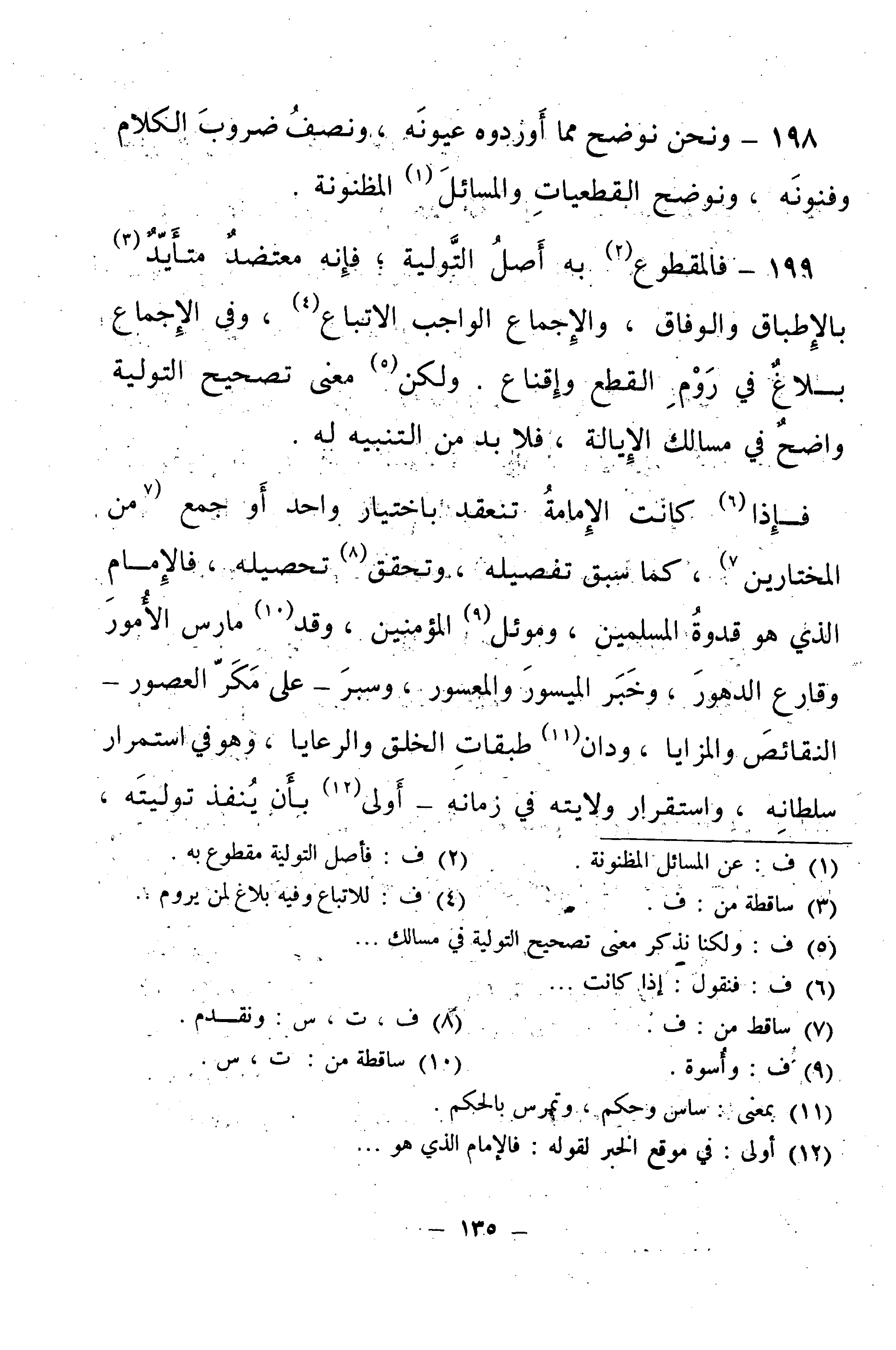199 - فَالْمَقْطُوعُ بِهِ أَصْلُ التَّوْلِيَةِ، فَإِنَّهُ مُعْتَضَدٌ مُتَأَيَّدٌ بِالْإِطْبَاقِ وَالْوِفَاقِ، وَالْإِجْمَاعِ الْوَاجِبِ الِاتِّبَاعِ، وَفِي الْإِجْمَاعِ بَلَاغٌ فِي رَوْمِ الْقَطْعِ وَإِقْنَاعٌ. وَلَكِنْ مَعْنَى تَصْحِيحِ التَّوْلِيَةِ وَاضِحٌ فِي مَسَالِكِ الْإِيَالَةِ، فَلَا بُدَّ مِنَ التَّنْبِيهِ لَهُ.