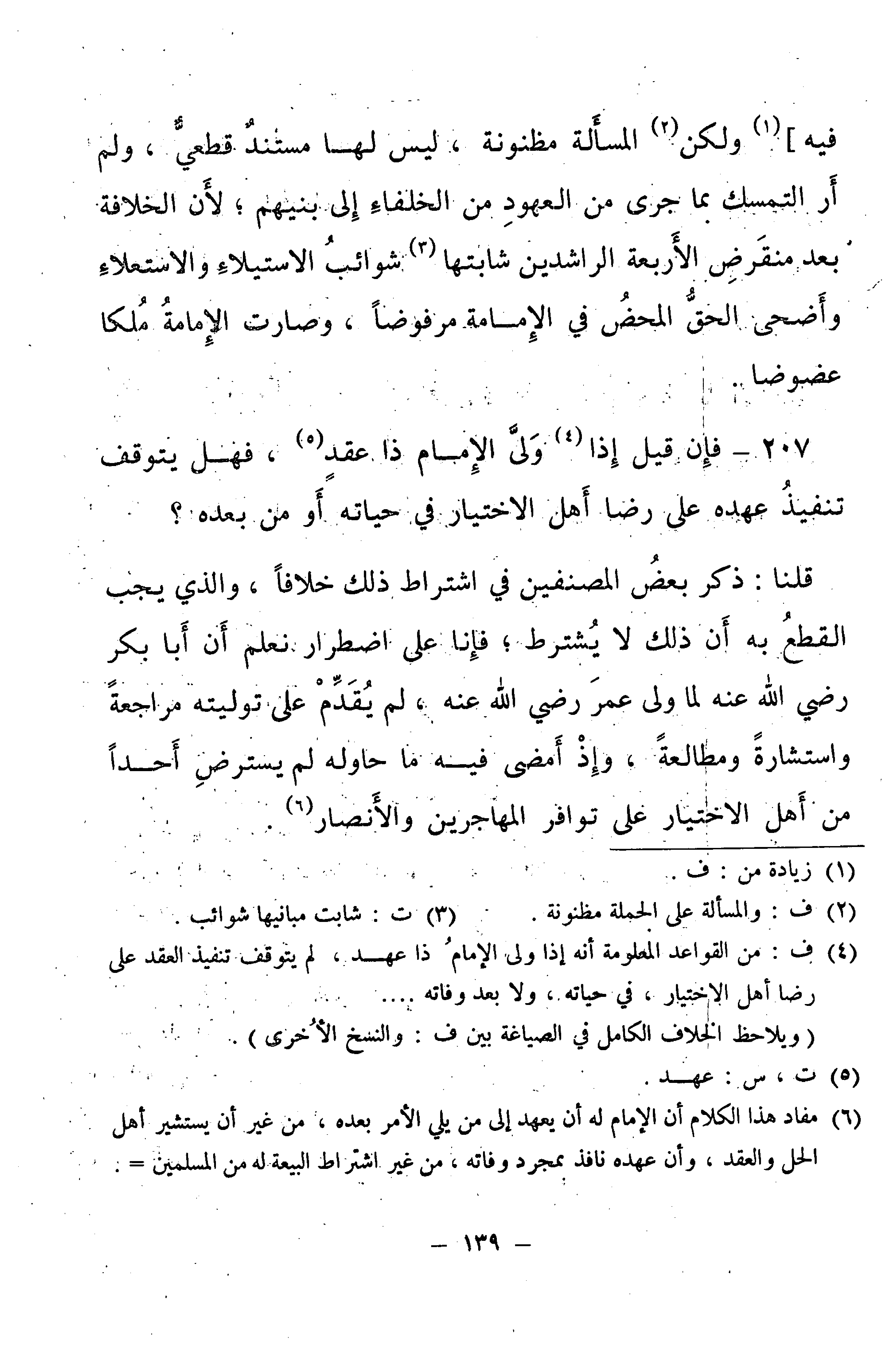 فِيهِ] وَلَكِنَّ الْمَسْأَلَةَ مَظْنُونَةٌ، لَيْسَ لَهَا مُسْتَنَدٌ قَطْعِيٌّ، وَلَمْ أَرَ التَّمَسُّكَ بِمَا جَرَى مِنَ الْعُهُودِ مِنَ الْخُلَفَاءِ إِلَى بَنِيهِمْ ; لِأَنَّ الْخِلَافَةَ بَعْدَ مُنْقَرَضِ الْأَرْبَعَةِ الرَّاشِدِينَ شَابَتْهَا شَوَائِبُ الِاسْتِيلَاءِ وَالِاسْتِعْلَاءِ، وَأَضْحَى الْحَقُّ الْمَحْضُ فِي الْإِمَامَةِ مَرْفُوضًا، وَصَارَتِ الْإِمَامَةُ مُلْكًا عَضُوضًا.