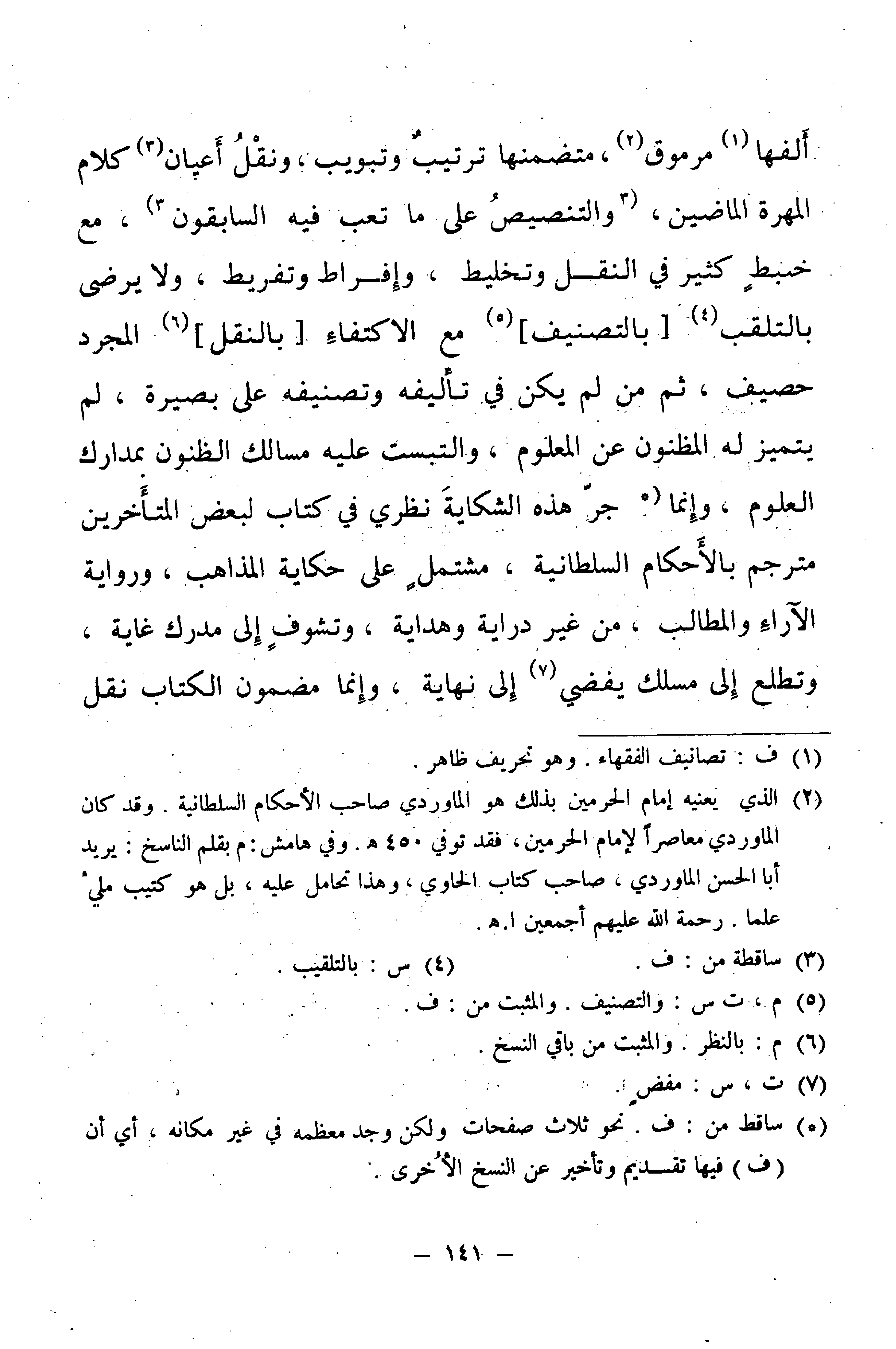 أَلَّفَهَا مَرْمُوقٌ، مُتَضَمَّنُهَا تَرْتِيبٌ وَتَبْوِيبٌ، وَنَقْلُ أَعْيَانِ كَلَامِ الْمَهَرَةِ الْمَاضِينَ، وَالتَّنْصِيصُ عَلَى مَا تَعِبَ فِيهِ السَّابِقُونَ، مَعَ خَبْطٍ كَثِيرٍ فِي النَّقْلِ وَتَخْلِيطٍ، وَإِفْرَاطٍ وَتَفْرِيطٍ، لَا يَرْضَى بِالتَّلَقُّبِ بِالتَّصْنِيفِ مَعَ الِاكْتِفَاءِ بِالنَّقْلِ الْمُجَرَّدِ حَصِيفٌ، ثُمَّ مَنْ لَمْ يَكُنْ فِي تَأْلِيفِهِ وَتَصْنِيفِهِ عَلَى بَصِيرَةٍ، لَمْ يَتَمَيَّزْ لَهُ الْمَظْنُونُ عَنِ الْمَعْلُومِ، وَالْتَبَسَتْ عَلَيْهِ مَسَالِكُ الظُّنُونِ بِمَدَارِكِ الْعُلُومِ، وَإِنَّمَا جَرَّ هَذِهِ الشِّكَايَةَ نَظَرِي فِي كِتَابٍ لِبَعْضِ الْمُتَأَخِّرِينَ مُتَرْجَمٌ بِالْأَحْكَامِ السُّلْطَانِيَّةِ، مُشْتَمِلٌ عَلَى حِكَايَةِ الْمَذَاهِبِ، وَرِوَايَةِ الْآرَاءِ وَالْمَطَالِبِ، مِنْ غَيْرِ دِرَايَةٍ وَهِدَايَةٍ، وَتَشَوُّفٍ إِلَى مَدْرَكِ غَايَةٍ، وَتَطَلُّعٍ إِلَى مَسْلَكٍ يُفْضِي إِلَى نِهَايَةٍ، وَإِنَّمَا مَضْمُونُ الْكِتَابِ نَقْلُ
