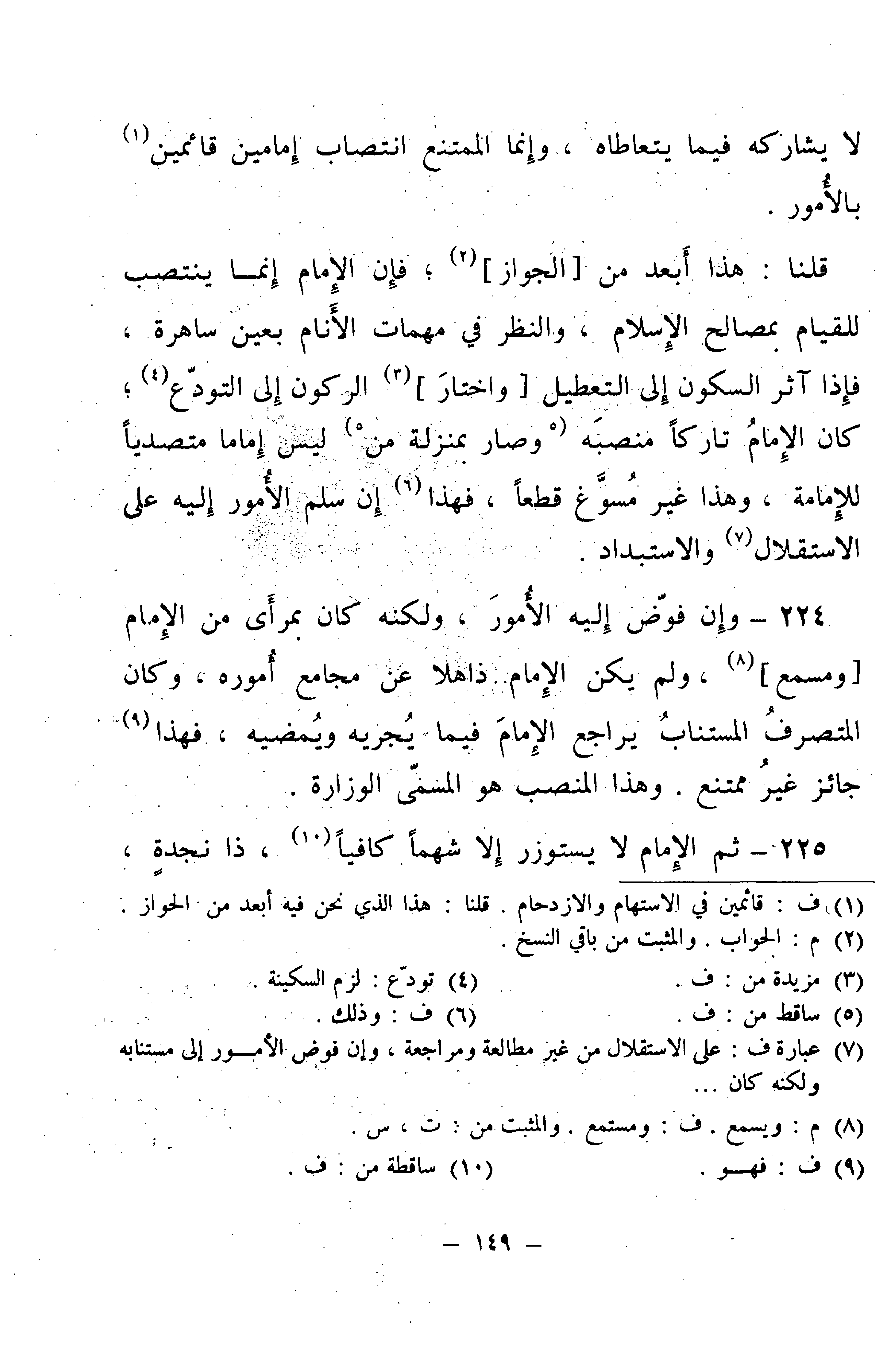 224 - وَإِنْ فَوَّضَ إِلَيْهِ الْأُمُورَ، وَلَكِنَّهُ كَانَ بِمَرْأَى مِنِ الْإِمَامِ وَمَسْمَعٍ، وَلَمْ يَكُنِ الْإِمَامُ ذَاهِلًا عَنْ مَجَامِعِ أُمُورِهِ، وَكَانَ الْمُتَصَرِّفُ الْمُسْتَنَابُ يُرَاجِعُ الْإِمَامَ فِيمَا يُجْرِيهِ وَيُمْضِيهِ، فَهَذَا جَائِزٌ غَيْرُ مُمْتَنَعٍ، وَهَذَا الْمَنْصِبُ هُوَ الْمُسَمَّى الْوِزَارَةُ.