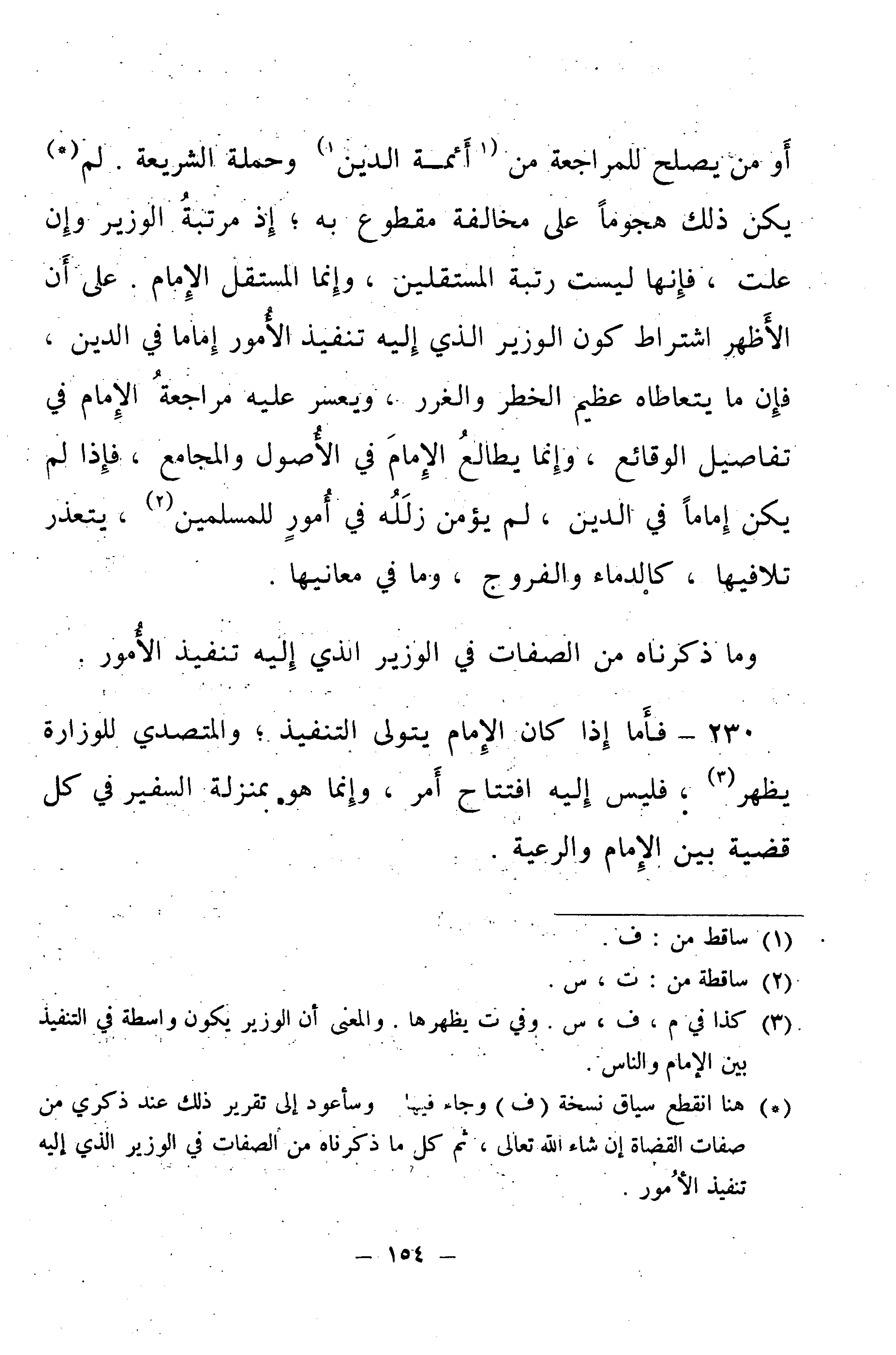 230 - فَأَمَّا إِذَا كَانَ الْإِمَامُ يَتَوَلَّى التَّنْفِيذَ ; وَالْمُتَصَدِّي لِلْوِزَارَةِ يَظْهَرُ ; فَلَيْسَ إِلَيْهِ افْتِتَاحُ أَمْرٍ، وَإِنَّمَا هُوَ بِمَنْزِلَةِ السَّفِيرِ فِي كُلِّ قَضِيَّةٍ بَيْنَ الْإِمَامِ وَالرَّعِيَّةِ.
