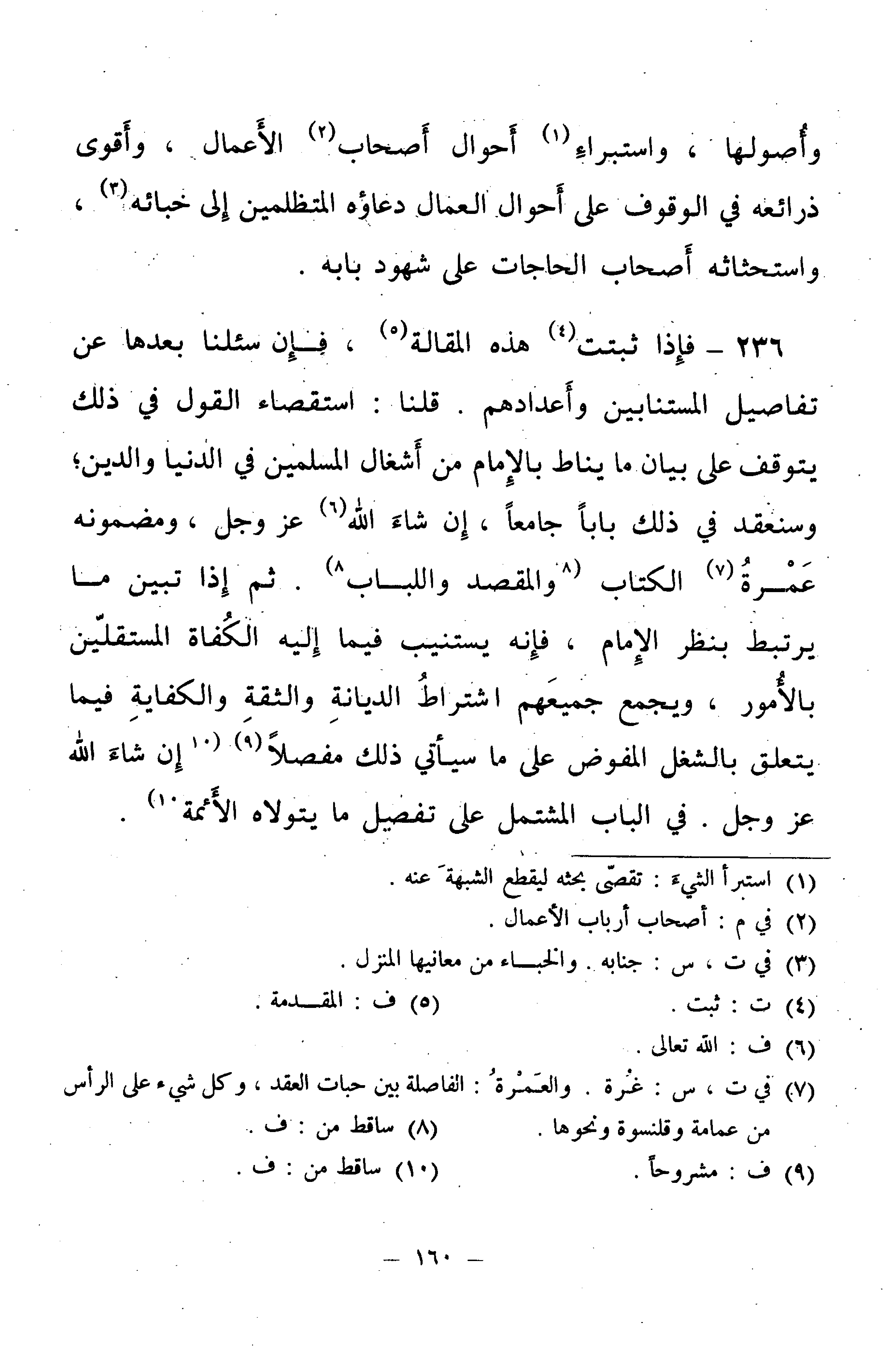 236 - فَإِذَا ثَبَتَتْ هَذِهِ الْمَقَالَةُ، فَإِنْ سُئِلْنَا بَعْدَهَا عَنْ تَفَاصِيلِ الْمُسْتَنَابِينَ وَأَعْدَادِهِمْ. قُلْنَا: اسْتِقْصَاءُ الْقَوْلِ فِي ذَلِكَ يَتَوَقَّفُ عَلَى بَيَانِ مَا يُنَاطُ بِالْإِمَامِ مِنْ أَشْغَالِ الْمُسْلِمِينَ فِي الدُّنْيَا وَالدِّينِ ; وَسَنَعْقِدُ فِي ذَلِكَ بَابًا جَامِعًا، إِنْ شَاءَ اللَّهُ عَزَّ وَجَلَّ، وَمَضْمُونُهُ عَمْرَةُ الْكِتَابِ وَالْمَقْصِدِ وَاللُّبَابِ. ثُمَّ إِذَا تَبَيَّنَ مَا يَرْتَبِطُ بِنَظَرِ الْإِمَامِ، فَإِنَّهُ يَسْتَنِيبُ فِيمَا إِلَيْهِ الْكُفَاةَ الْمُسْتَقِلِّينَ بِالْأُمُورِ، وَيَجْمَعُ جَمِيعَهُمُ اشْتِرَاطُ الدِّيَانَةِ وَالثِّقَةِ وَالْكِفَايَةِ فِيمَا يَتَعَلَّقُ بِالشُّغُلِ الْمُفَوَّضِ عَلَى مَا سَيَأْتِي ذَلِكَ مُفَصَّلًا، إِنْ شَاءَ اللَّهُ عَزَّ وَجَلَّ. فِي الْبَابِ الْمُشْتَمِلِ عَلَى تَفْصِيلِ مَا يَتَوَلَّاهُ الْأَئِمَّةُ.