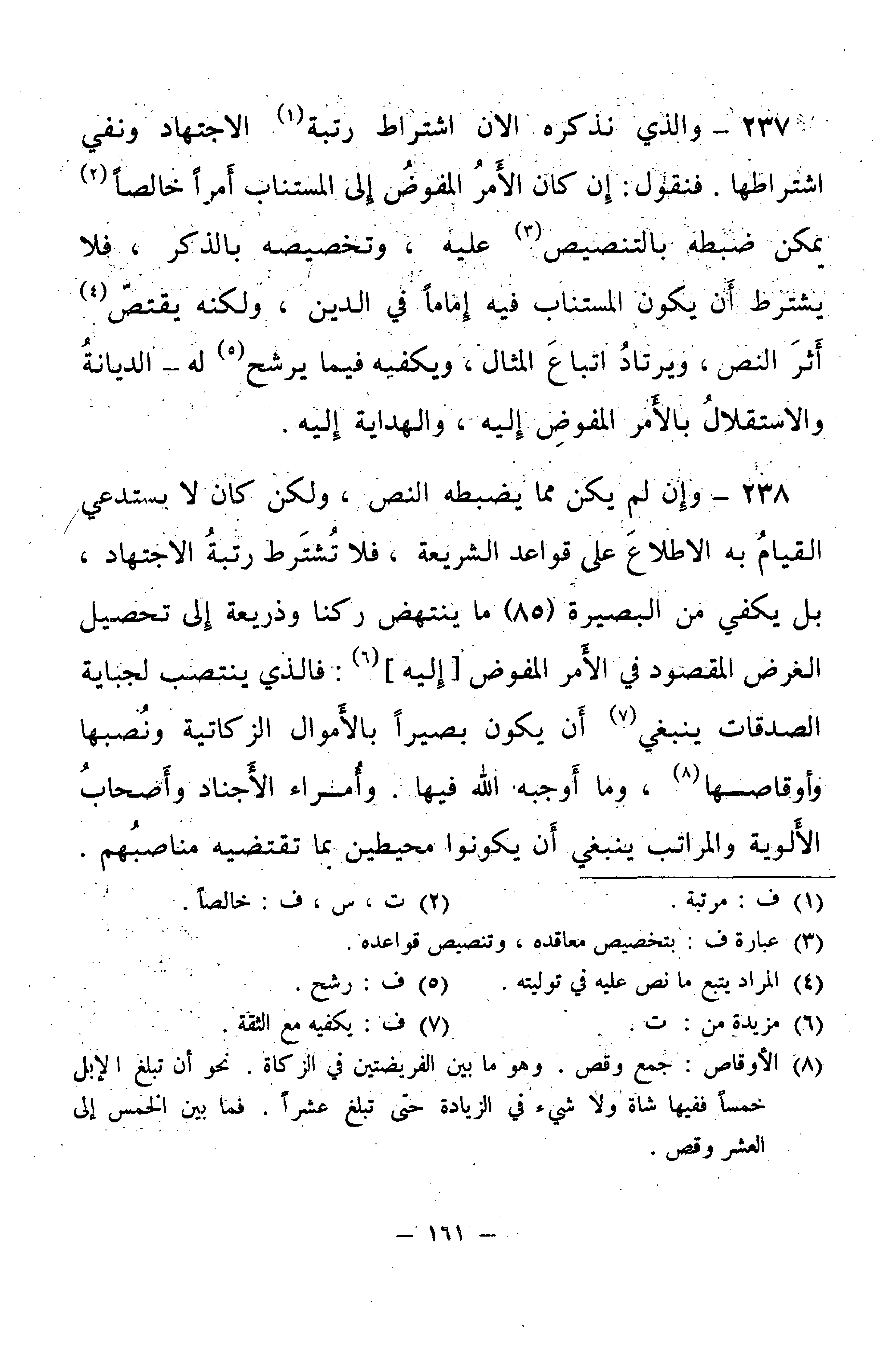238 - وَإِنْ لَمْ يَكُنْ مِمَّا يَضْبِطُهُ النَّصُّ، وَلَكِنْ كَانَ لَا يَسْتَدْعِي الْقِيَامُ بِهِ الِاطِّلَاعَ عَلَى قَوَاعِدِ الشَّرِيعَةِ، فَلَا يُشْتَرَطُ رُتْبَةُ الِاجْتِهَادِ، بَلْ يَكْفِي مِنَ الْبَصِيرَةِ مَا يَنْتَهِضُ رُكْنًا وَذَرِيعَةً إِلَى تَحْصِيلِ الْغَرَضِ الْمَقْصُودِ فِي الْأَمْرِ الْمُفَوَّضِ إِلَيْهِ: فَالَّذِي يَنْتَصِبُ لِجِبَايَةِ الصَّدَقَاتِ يَنْبَغِي أَنْ يَكُونَ بَصِيرًا بِالْأَمْوَالِ الزَّكَاتِيَّةِ وَنُصُبِهَا وَأَوْقَاصِهَا، وَمَا أَوْجَبَهُ اللَّهُ فِيهَا. وَأُمَرَاءُ الْأَجْنَادِ وَأَصْحَابُ الْأَلْوِيَةِ وَالْمَرَاتِبِ يَنْبَغِي أَنْ يَكُونُوا مُحِيطِينَ بِمَا تَقْتَضِيهِ مَنَاصِبُهُمْ.