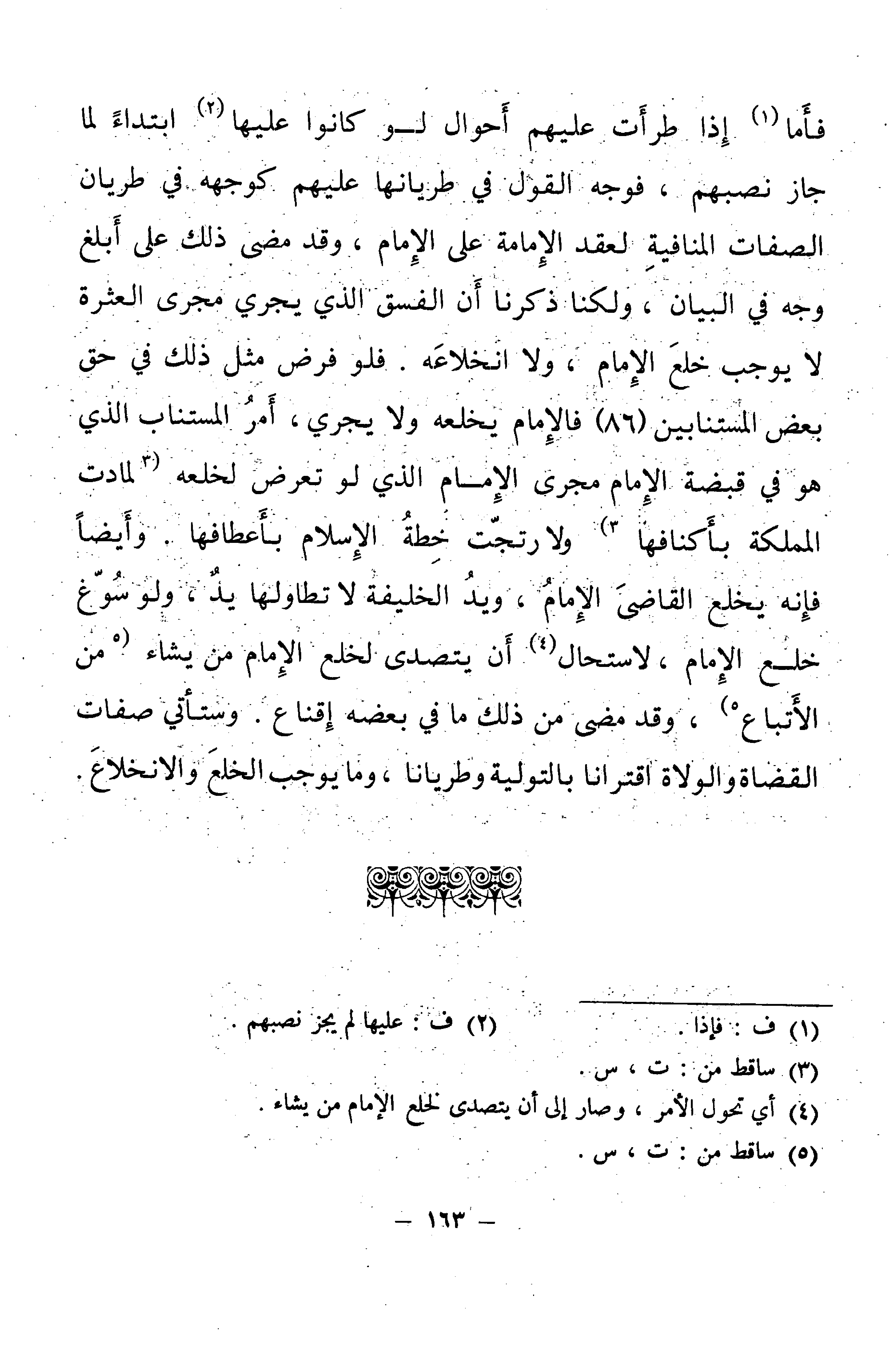 فَأَمَّا إِذَا طَرَأَتْ عَلَيْهِمْ أَحْوَالٌ لَوْ كَانُوا عَلَيْهَا ابْتِدَاءً لَمَا جَازَ نَصْبُهُمْ، فَوَجْهُ الْقَوْلِ فِي طَرَيَانِهَا عَلَيْهِمْ كَوَجْهِهِ فِي طَرَيَانِ الصِّفَاتِ الْمُنَافِيَةِ لِعَقْدِ الْإِمَامَةِ عَلَى الْإِمَامِ، وَقَدْ مَضَى ذَلِكَ عَلَى أَبْلَغِ وَجْهٍ فِي الْبَيَانِ، وَلَكِنَّا ذَكَرْنَا أَنَّ الْفِسْقَ الَّذِي يَجْرِي مَجْرَى الْعَثْرَةِ لَا يُوجِبُ خَلْعَ الْإِمَامِ، وَلَا انْخِلَاعَهُ. فَلَوْ فُرِضَ مِثْلُ ذَلِكَ فِي حَقِّ بَعْضِ الْمُسْتَنَابِينِ فَالْإِمَامُ يَخْلَعُهُ، وَلَا يَجْرِي أَمْرُ الْمُسْتَنَابِ الَّذِي هُوَ فِي قَبْضَةِ الْإِمَامِ، مَجْرَى الْإِمَامِ الَّذِي لَوْ تَعَرَّضَ لِخَلْعِهِ لَمَادَتِ الْمَمْلَكَةُ بِأَكْنَافِهَا، وَلَارْتَجَّتْ خِطَّةُ الْإِسْلَامِ بِأَعْطَافِهَا. وَأَيْضًا فَإِنَّهُ يَخْلَعُ الْقَاضِيَ الْإِمَامُ، وَيَدُ الْخَلِيفَةِ لَا تُطَاوِلُهَا يَدٌ، وَلَوْ سُوِّغَ خَلْعُ الْإِمَامِ، لَاسْتَحَالَ أَنْ يَتَصَدَّى لِخَلْعِ الْإِمَامِ مَنْ يَشَاءُ مِنَ الْأَتْبَاعِ، وَقَدْ مَضَى مِنْ ذَلِكَ مَا فِي بَعْضِهِ إِقْنَاعٌ، وَسَتَأْتِي صِفَاتُ الْقُضَاةِ وَالْوُلَاةِ اقْتِرَانًا بِالتَّوْلِيَةِ وَطَرَيَانًا، وَمَا يُوجِبُ الْخَلْعَ وَالِانْخِلَاعَ.