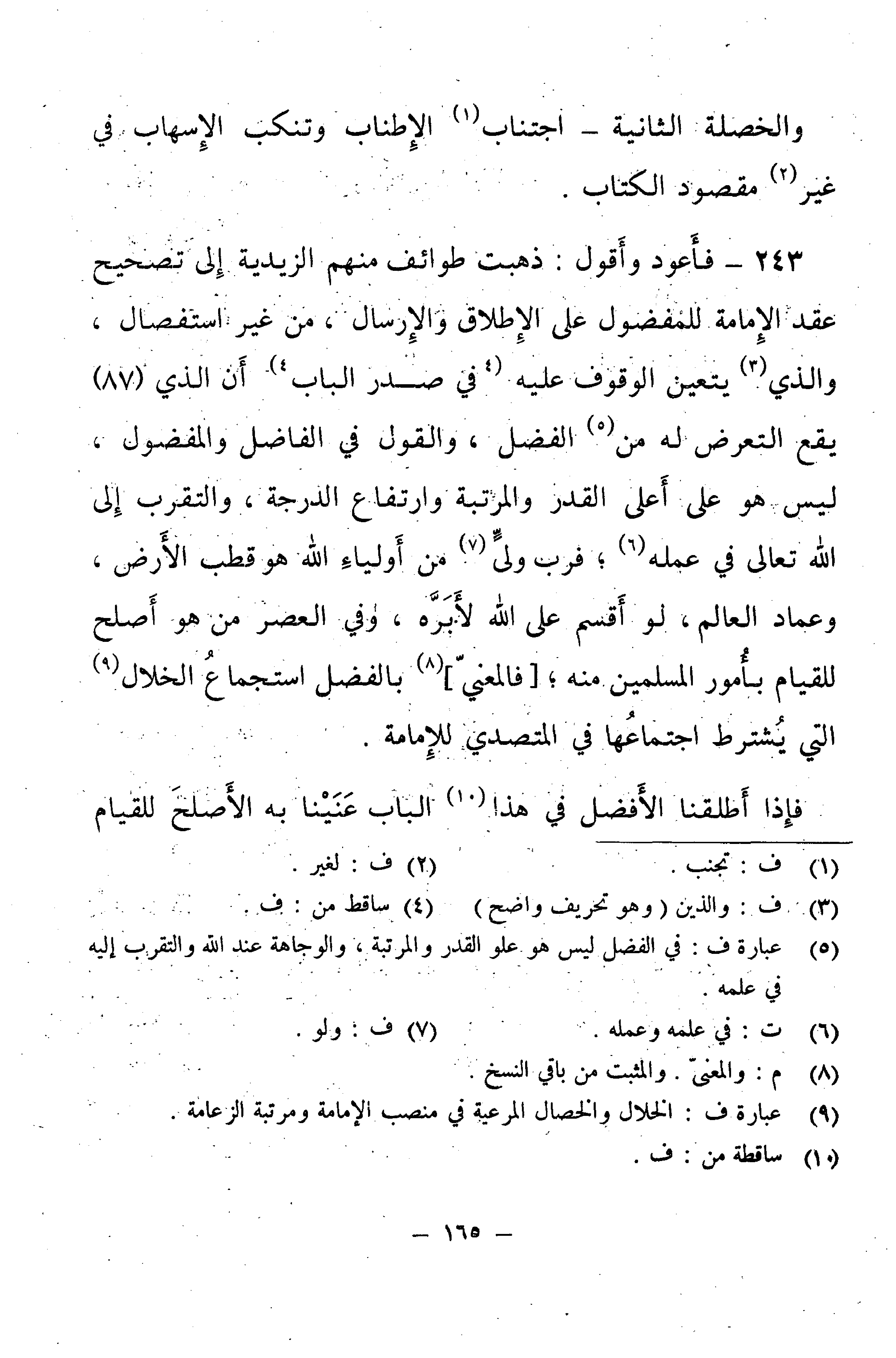 243 - فَأَعُودُ وَأَقُولُ: ذَهَبَتْ طَوَائِفُ مِنْهُمُ الزَّيْدِيَّةُ إِلَى تَصْحِيحِ عَقْدِ الْإِمَامَةِ لِلْمَفْضُولِ عَلَى الْإِطْلَاقِ وَالْإِرْسَالِ، مِنْ غَيْرِ اسْتِفْصَالٍ، وَالَّذِي يَتَعَيَّنُ الْوُقُوفُ عَلَيْهِ فِي صَدْرِ الْبَابِ، أَنَّ الَّذِي يَقَعُ التَّعَرُّضُ لَهُ مِنَ الْفَضْلِ، وَالْقَوْلِ فِي الْفَاضِلِ وَالْمَفْضُولِ، لَيْسَ هُوَ عَلَى أَعْلَى الْقَدْرِ وَالْمَرْتَبَةِ وَارْتِفَاعِ الدَّرَجَةِ، وَالتَّقَرُّبِ إِلَى اللَّهِ تَعَالَى فِي عَمَلِهِ، فَرُبَّ وَلِيٍّ مِنْ أَوْلِيَاءِ اللَّهِ هُوَ قُطْبُ الْأَرْضِ، وَعِمَادُ الْعَالَمِ، لَوْ أَقْسَمَ عَلَى اللَّهِ لَأَبَرَّهُ، وَفِي الْعَصْرِ مَنْ هُوَ أَصْلَحُ لِلْقِيَامِ بِأُمُورِ الْمُسْلِمِينَ مِنْهُ، فَالْمَعْنِيُّ بِالْفَضْلِ اسْتِجْمَاعُ الْخِلَالِ الَّتِي يُشْتَرَطُ اجْتِمَاعُهَا فِي الْمُتَصَدِّي لِلْإِمَامَةِ.