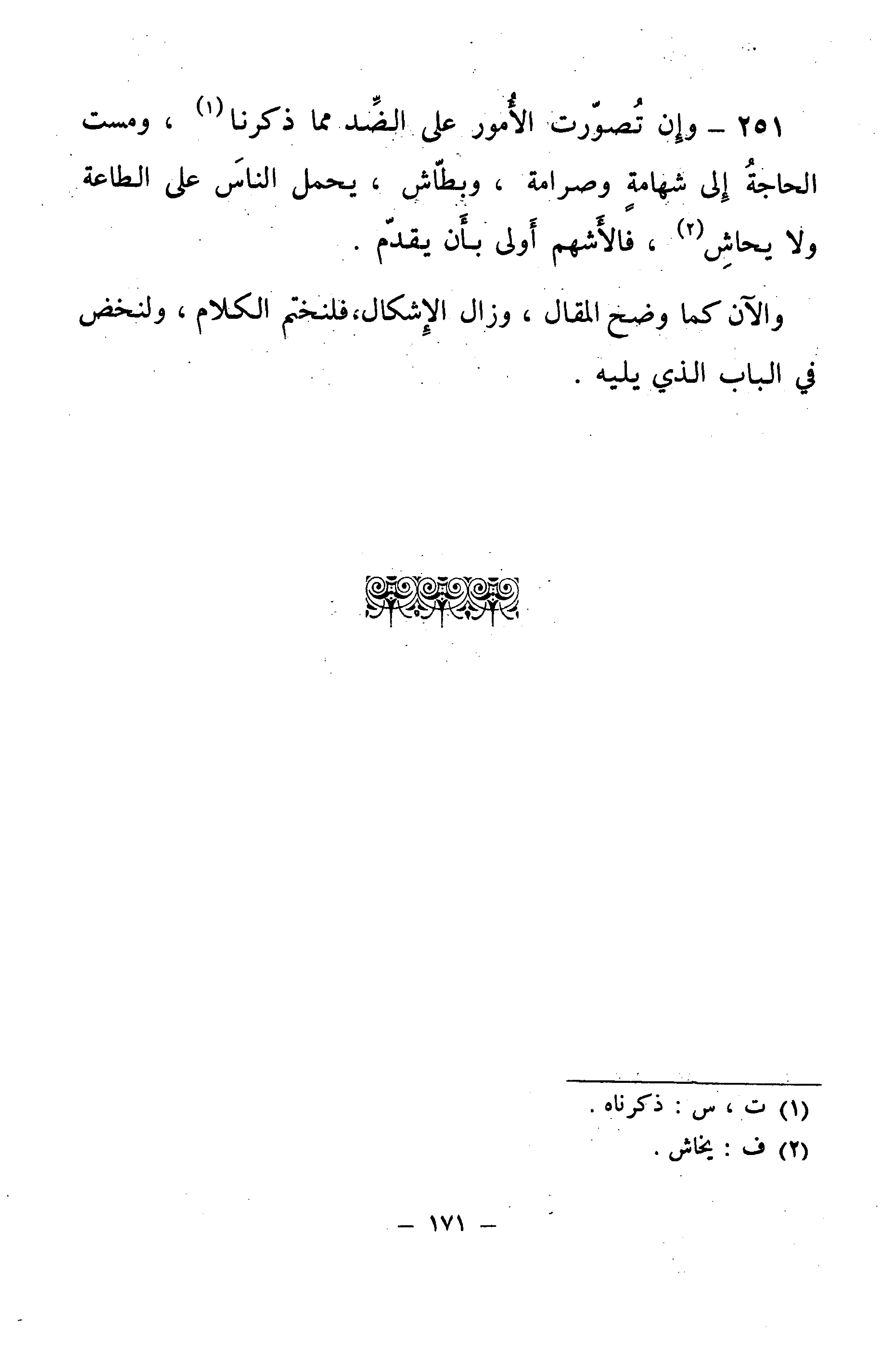 251 - وَإِنْ تُصُوِّرَتِ الْأُمُورَ عَلَى الضِّدِّ مِمَّا ذَكَرْنَاهُ، وَمَسَّتِ الْحَاجَةُ إِلَى شَهَامَةٍ وَصَرَامَةٍ، وَبَطَّاشٍ، يَحْمِلُ النَّاسَ عَلَى الطَّاعَةِ وَلَا يُحَاشِ، فَالْأَشْهَمُ أَوْلَى بِأَنْ يُقَدَّمَ.