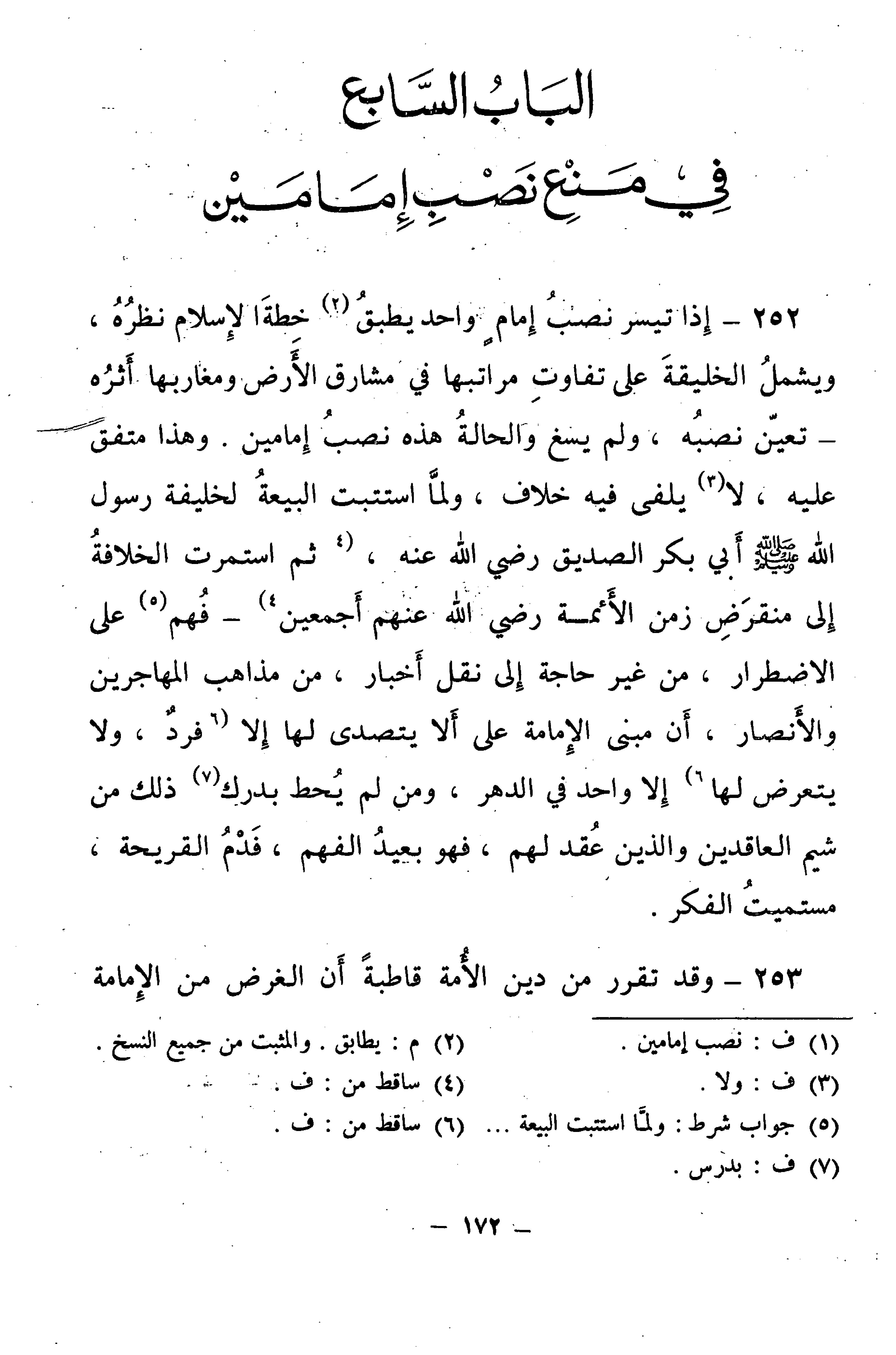252 - إِذَا تَيَسَّرَ نَصْبُ إِمَامٍ وَاحِدٍ يُطَبِّقُ خِطَّةَ الْإِسْلَامِ نَظَرُهُ، وَيَشْمَلُ الْخَلِيقَةَ عَلَى تَفَاوُتِ مَرَاتِبِهَا فِي مَشَارِقِ الْأَرْضِ وَمَغَارِبِهَا أَثَرُهُ، تَعَيَّنَ نَصْبُهُ، وَلَمْ يَسُغْ - وَالْحَالَةُ هَذِهِ - نَصْبُ إِمَامَيْنِ. وَهَذَا مُتَّفَقٌ عَلَيْهِ، لَا يُلْفَى فِيهِ خِلَافٌ، وَلَمَّا اسْتَتَبَّتِ الْبَيْعَةُ لِخَلِيفَةِ رَسُولِ اللَّهِ - صَلَّى اللَّهُ عَلَيْهِ وَسَلَّمَ - أَبِي بَكْرٍ الصِّدِّيقِ - رَضِيَ اللَّهُ عَنْهُ - ثُمَّ اسْتَمَرَّتِ الْخِلَافَةُ إِلَى مُنْقَرَضِ زَمَنِ الْأَئِمَّةِ - رَضِيَ اللَّهُ عَنْهُمْ أَجْمَعِينَ - فُهِمَ عَلَى الِاضْطِرَارِ، مِنْ غَيْرِ حَاجَةٍ إِلَى نَقْلِ أَخْبَارٍ، مِنْ مَذَاهِبِ الْمُهَاجِرِينَ وَالْأَنْصَارِ، أَنَّ مَبْنَى الْإِمَامَةِ عَلَى أَنْ لَا يَتَصَدَّى لَهَا إِلَّا فَرْدٌ، وَلَا يَتَعَرَّضُ لَهَا إِلَّا وَاحِدٌ فِي الدَّهْرِ، وَمَنْ لَمْ يُحِطْ بِدَرْكِ ذَلِكَ مِنْ شِيَمِ الْعَاقِدِينَ وَالَّذِينَ عُقِدَ لَهُمْ، فَهُوَ بَعِيدُ الْفَهْمِ، فَدْمُ الْقَرِيحَةِ، مُسْتَمِيتُ الْفِكْرِ.