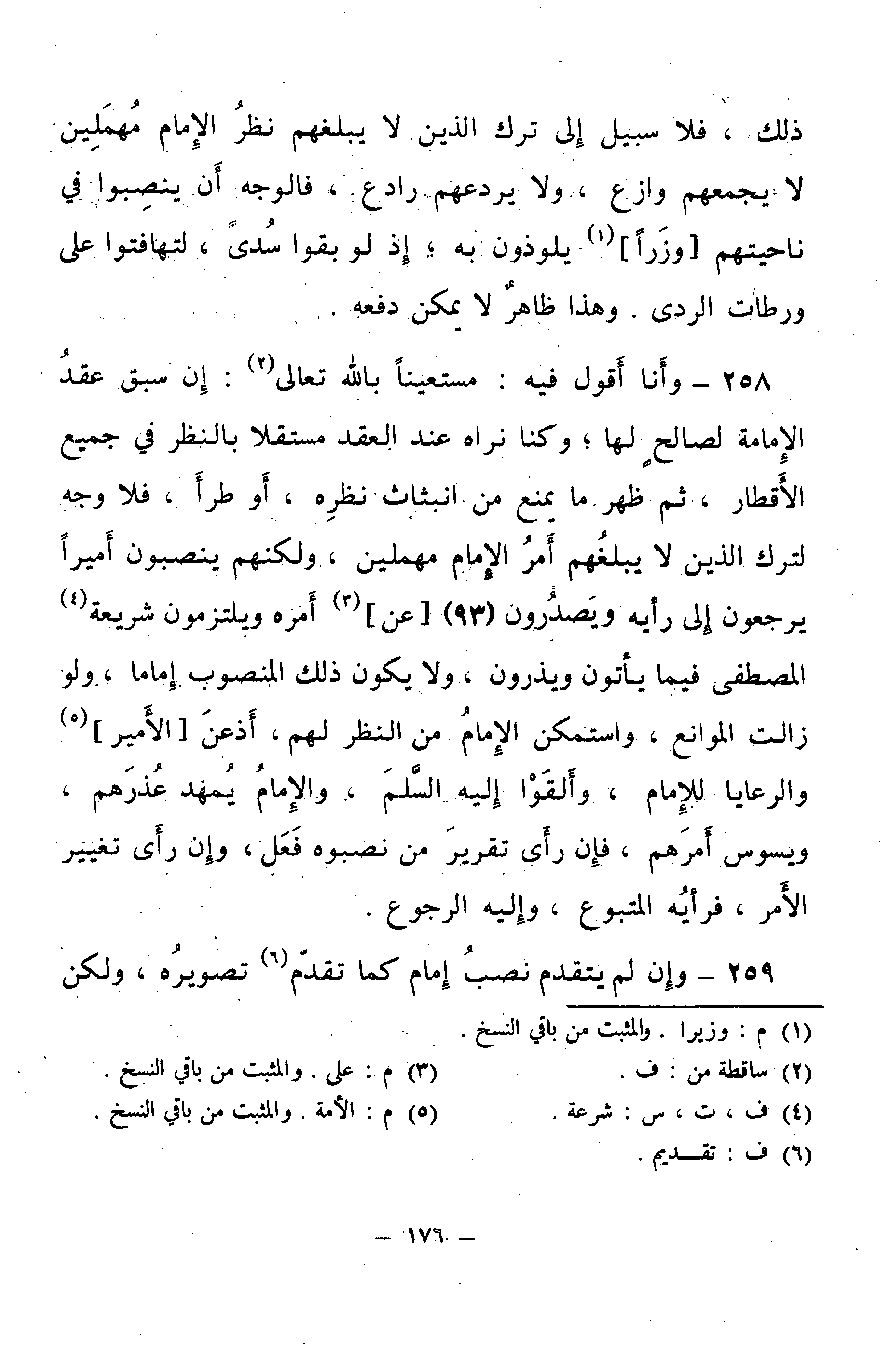 258 - وَأَنَا أَقُولُ فِيهِ: مُسْتَعِينًا بِاللَّهِ تَعَالَى: إِنْ سَبَقَ عَقْدُ الْإِمَامَةِ لِصَالِحٍ لَهَا، وَكُنَّا نَرَاهُ عِنْدَ الْعَقْدِ مُسْتَقِلًّا بِالنَّظَرِ فِي جَمِيعِ الْأَقْطَارِ، ثُمَّ ظَهَرَ مَا يَمْنَعُ مِنِ انْبِثَاثِ نَظَرِهِ، أَوْ طَرَأَ، فَلَا وَجْهَ لِتَرْكِ الَّذِينَ لَا يَبْلُغُهُمْ أَمْرُ الْإِمَامِ مُهْمَلِينَ، وَلَكِنَّهُمْ يُنَصِّبُونَ أَمِيرًا يَرْجِعُونَ إِلَى رَأْيِهِ وَيَصْدُرُونَ عَنْ أَمْرِهِ وَيَلْتَزِمُونَ شَرِيعَةَ الْمُصْطَفَى فِيمَا يَأْتُونَ وَيَذَرُونَ، وَلَا يَكُونُ ذَلِكَ الْمَنْصُوبُ إِمَامًا، وَلَوْ زَالَتِ الْمَوَانِعُ، وَاسْتَمَكْنَ الْإِمَامُ مِنَ النَّظَرِ لَهُمْ، أَذْعَنَ الْأَمِيرُ وَالرَّعَايَا لِلْإِمَامِ، وَأَلْقَوْا إِلَيْهِ السَّلَمَ، وَالْإِمَامُ يُمَهِّدُ عُذْرَهُمْ، وَيَسُوسُ أَمْرَهُمْ، فَإِنْ رَأَى تَقْرِيرَ مَنْ نَصَّبُوهُ فَعَلَ، وَإِنْ رَأَى تَغْيِيرَ الْأَمْرِ، فَرَأْيُهُ الْمَتْبُوعُ، وَإِلَيْهِ الرُّجُوعُ.