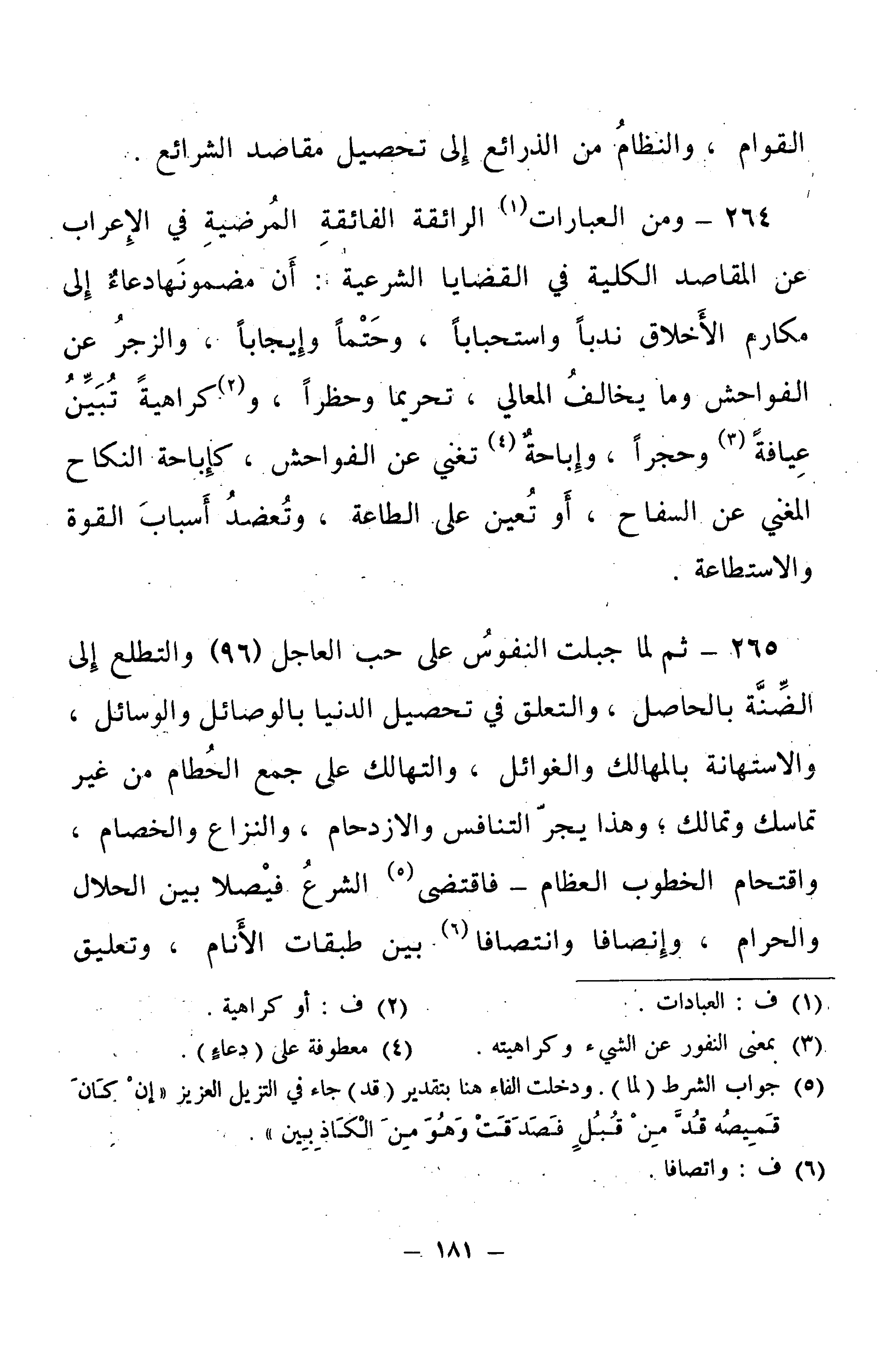 264 - وَمِنَ الْعِبَارَاتِ الرَّائِقَةِ الْفَائِقَةِ الْمُرْضِيَةِ فِي الْإِعْرَابِ عَنِ الْمَقَاصِدِ الْكُلِّيَّةِ فِي الْقَضَايَا الشَّرْعِيَّةِ: أَنَّ مَضْمُونَهَا دُعَاءٌ إِلَى مَكَارِمِ الْأَخْلَاقِ نَدْبًا وَاسْتِحْبَابًا، وَحَتْمًا وَإِيجَابًا، وَالزَّجْرُ عَنِ الْفَوَاحِشِ وَمَا يُخَالِفُ الْمَعَالِيَ، تَحْرِيمًا وَحَظْرًا، وَكَرَاهِيَةً تُبَيِّنُ عِيَافَةً وَحَجْرًا، وَإِبَاحَةٌ تُغْنِي عَنِ الْفَوَاحِشِ، كَإِبَاحَةِ النِّكَاحِ الْمُغْنِي عَنِ السِّفَاحِ، أَوْ تُعِينُ عَلَى الطَّاعَةِ، وَتُعْضِدُ أَسْبَابَ الْقُوَّةِ وَالِاسْتِطَاعَةِ.
