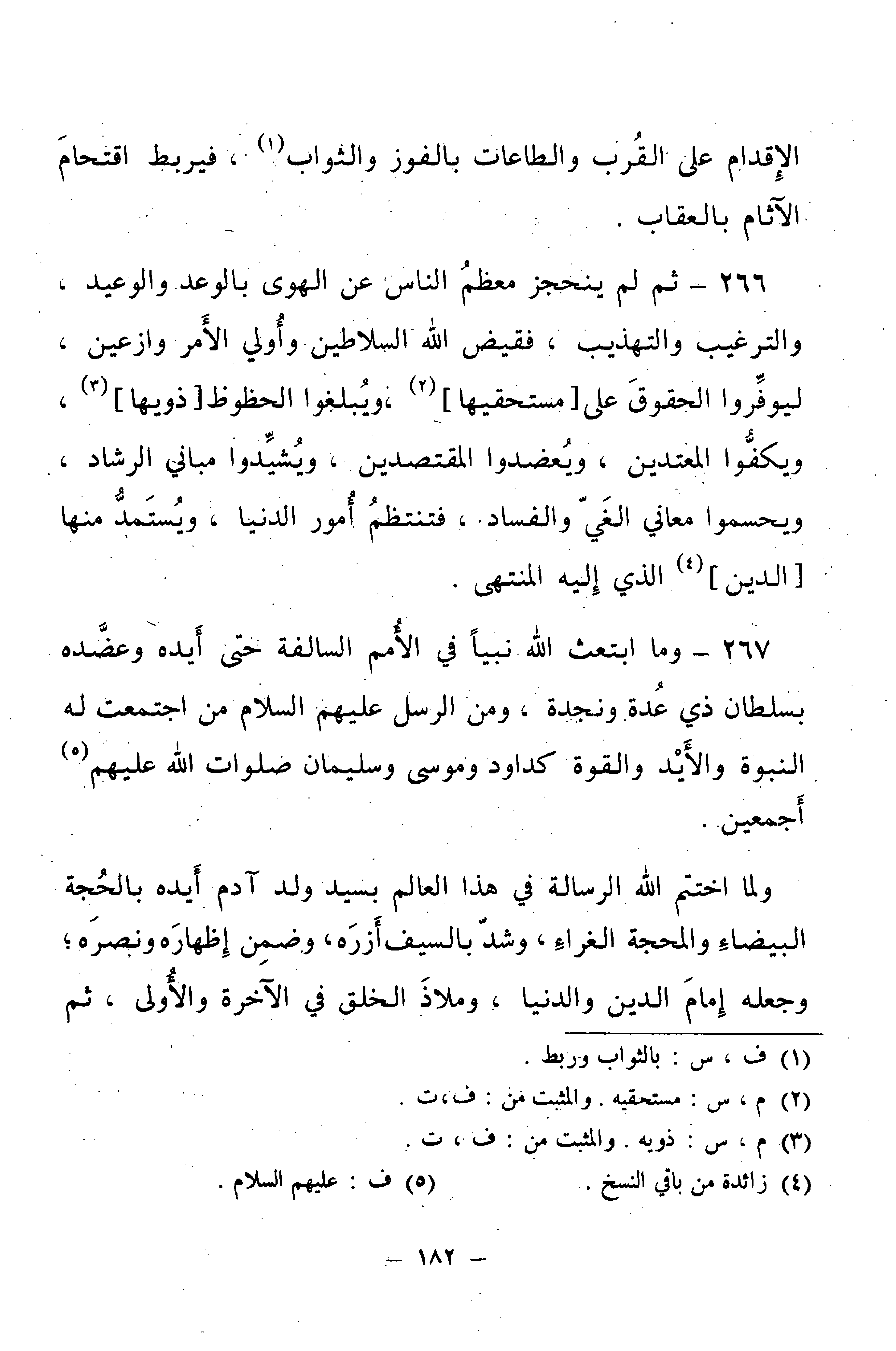 267 - وَمَا ابْتَعَثَ اللَّهُ نَبِيًّا فِي الْأُمَمِ السَّالِفَةِ حَتَّى أَيَّدَهُ وَعَضَّدَهُ بِسُلْطَانٍ ذِي عُدَّةٍ وَنَجْدَةٍ، وَمِنَ الرُّسُلِ - عَلَيْهِمُ السَّلَامُ - مَنِ اجْتَمَعَتْ لَهُ النُّبُوَّةُ وَالْأَيْدُ وَالْقُوَّةُ كَدَاوُدَ وَمُوسَى وَسُلَيْمَانَ - صَلَوَاتُ اللَّهِ عَلَيْهِمْ أَجْمَعِينَ.
