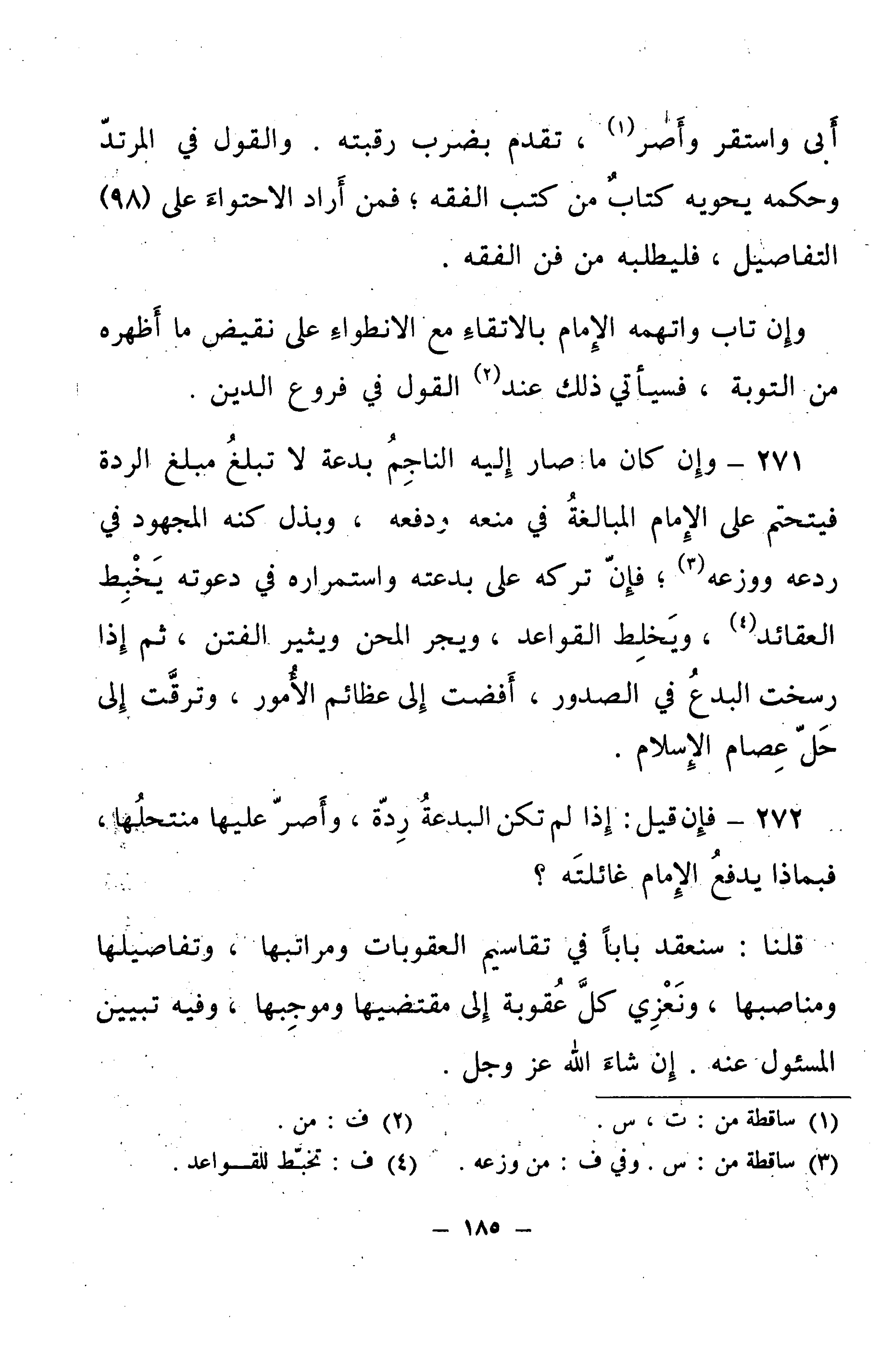272 - فَإِنْ قِيلَ: إِذَا لَمْ تَكُنِ الْبِدْعَةُ رِدَّةً، وَأَصَرَّ عَلَيْهَا مُنْتَحِلُهَا، فَبِمَاذَا يَدْفَعُ الْإِمَامُ غَائِلَتَهُ؟ .