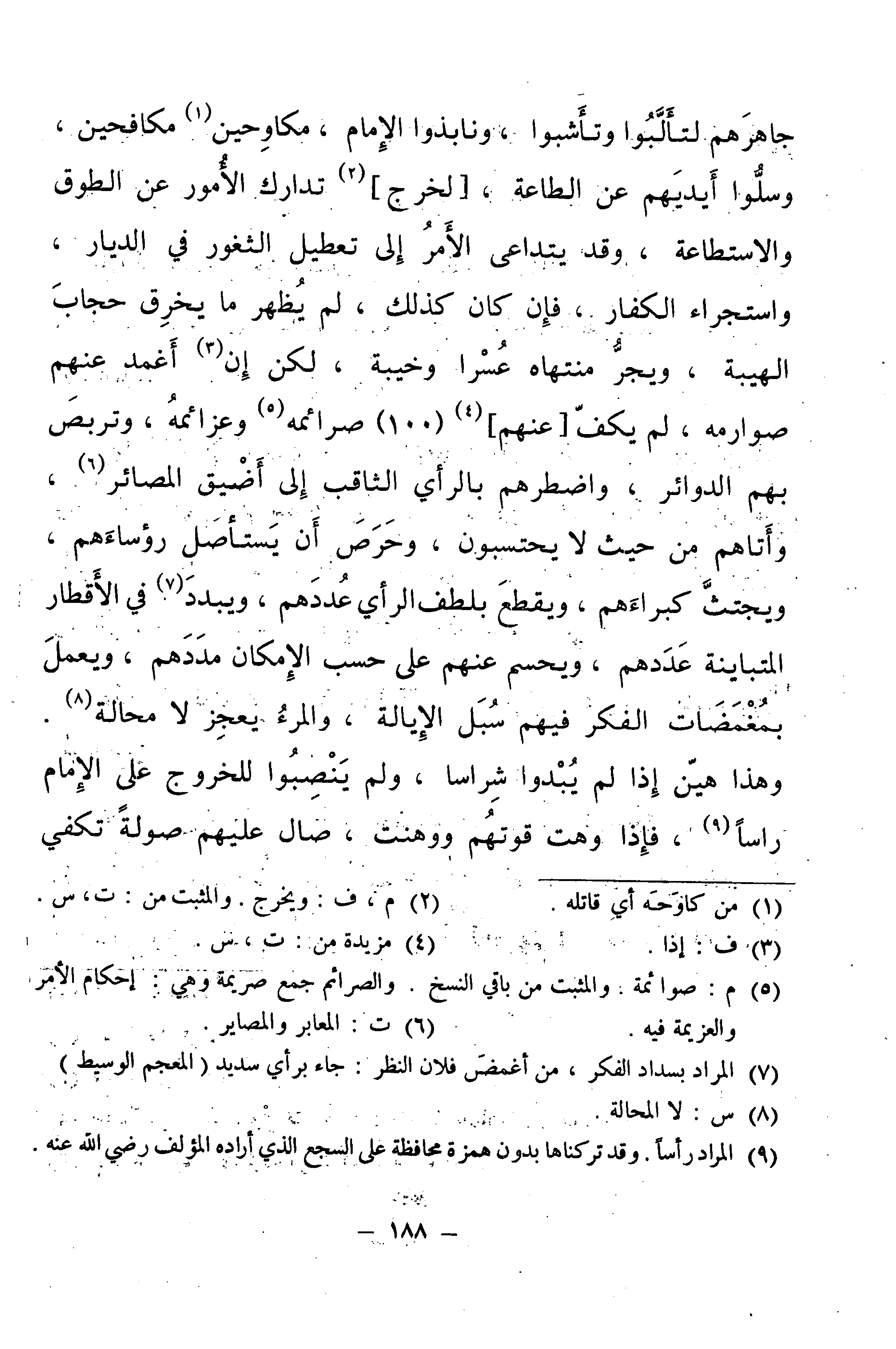 جَاهَرَهُمْ لَتَأَلَّبُوا وَتَأَشَّبُوا، وَنَابَذُوا الْإِمَامَ، مُكَاوِحِينَ مُكَافِحِينَ، وَسَلُّوا أَيْدِيَهُمْ عَنِ الطَّاعَةِ، لَخَرَجَ تَدَارُكُ الْأُمُورِ عَنِ الطَّوْقِ وَالِاسْتِطَاعَةِ، وَقَدْ يَتَدَاعَى الْأَمْرُ إِلَى تَعْطِيلِ الثُّغُورِ فِي الدِّيَارِ، وَاسْتِجْرَاءِ الْكُفَّارِ، فَإِنْ كَانَ كَذَلِكَ، لَمْ يُظْهِرْ مَا يَخْرُقُ حِجَابَ الْهَيْبَةِ، وَيَجُرُّ مُنْتَهَاهُ عُسْرًا وَخَيْبَةً، لَكِنْ إِنْ أَغْمَدَ عَنْهُمْ صَوَارِمَهُ، لَمْ يَكُفَّ عَنْهُمْ صَرَائِمَهُ، وَعَزَائِمَهُ، وَتَرَبَّصَ بِهِمُ الدَّوَائِرَ، وَاضْطَرَّهُمْ بِالرَّأْي الثَّاقِبِ إِلَى أَضْيَقِ الْمَصَائِرِ، وَأَتَاهُمْ مِنْ حَيْثُ لَا يَحْتَسِبُونَ، وَحَرَصَ أَنْ يَسْتَأْصِلَ رُؤَسَاءَهُمْ، وَيَجْتَثَّ كُبَرَاءَهُمْ، وَيَقْطَعَ بِلُطْفِ الرَّأْيِ عَدَدَهُمْ، وَيُبَدِّدَ فِي الْأَقْطَارِ الْمُتَبَايِنَةِ عَدَدَهُمْ، وَيَحْسِمُ عَنْهُمْ عَلَى حَسْبِ الْإِمْكَانِ مَدَدَهُمْ، وَيَعْمَلَ بِمُغْمَضَاتِ الْفِكْرِ فِيهِمْ سُبُلَ الْإِيَالَةِ، وَالْمَرْءُ يَعْجِزُ لَا مَحَالَةَ.