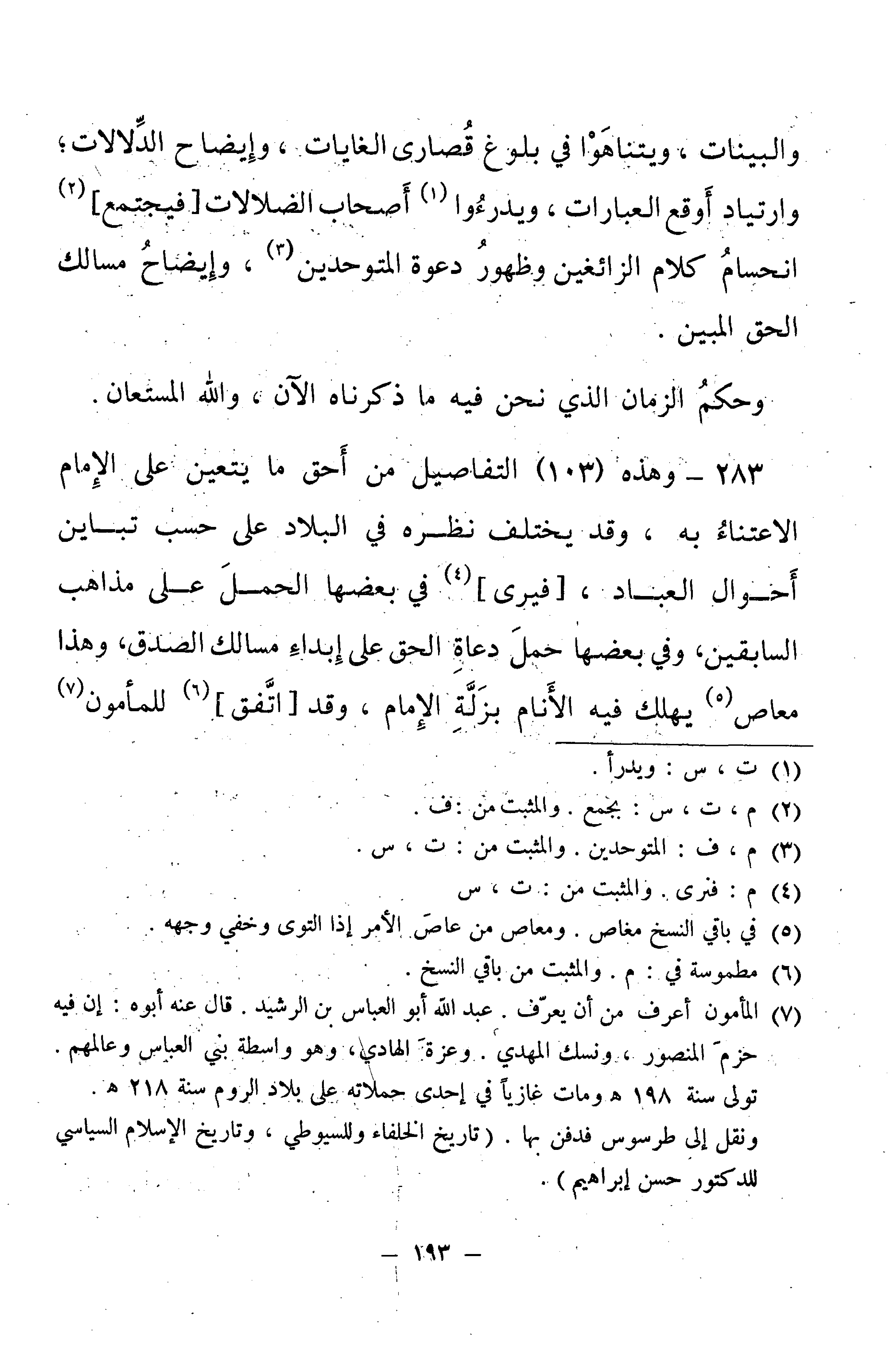283 - وَهَذِهِ تَفَاصِيلُ مِنْ أَحَقِّ مَا يَتَعَيَّنُ عَلَى الْإِمَامِ الِاعْتِنَاءُ بِهِ، وَقَدْ يَخْتَلِفُ نَظَرُهُ فِي الْبِلَادِ عَلَى حَسَبِ تَبَايُنِ أَحْوَالِ الْعِبَادِ، فَيَرَى فِي بَعْضِهَا الْحَمْلَ عَلَى مَذَاهِبِ السَّابِقِينَ، وَفِي بَعْضِهَا حَمْلَ دُعَاةِ الْحَقِّ عَلَى إِبْدَاءِ مَسَالِكِ الصِّدْقِ، وَهَذَا مَغَاصٌ يَهْلَكُ فِيهِ الْأَنَامُ بِزَلَّةِ الْإِمَامِ، وَقَدِ اتَّفَقَ لِلْمَأْمُونِ