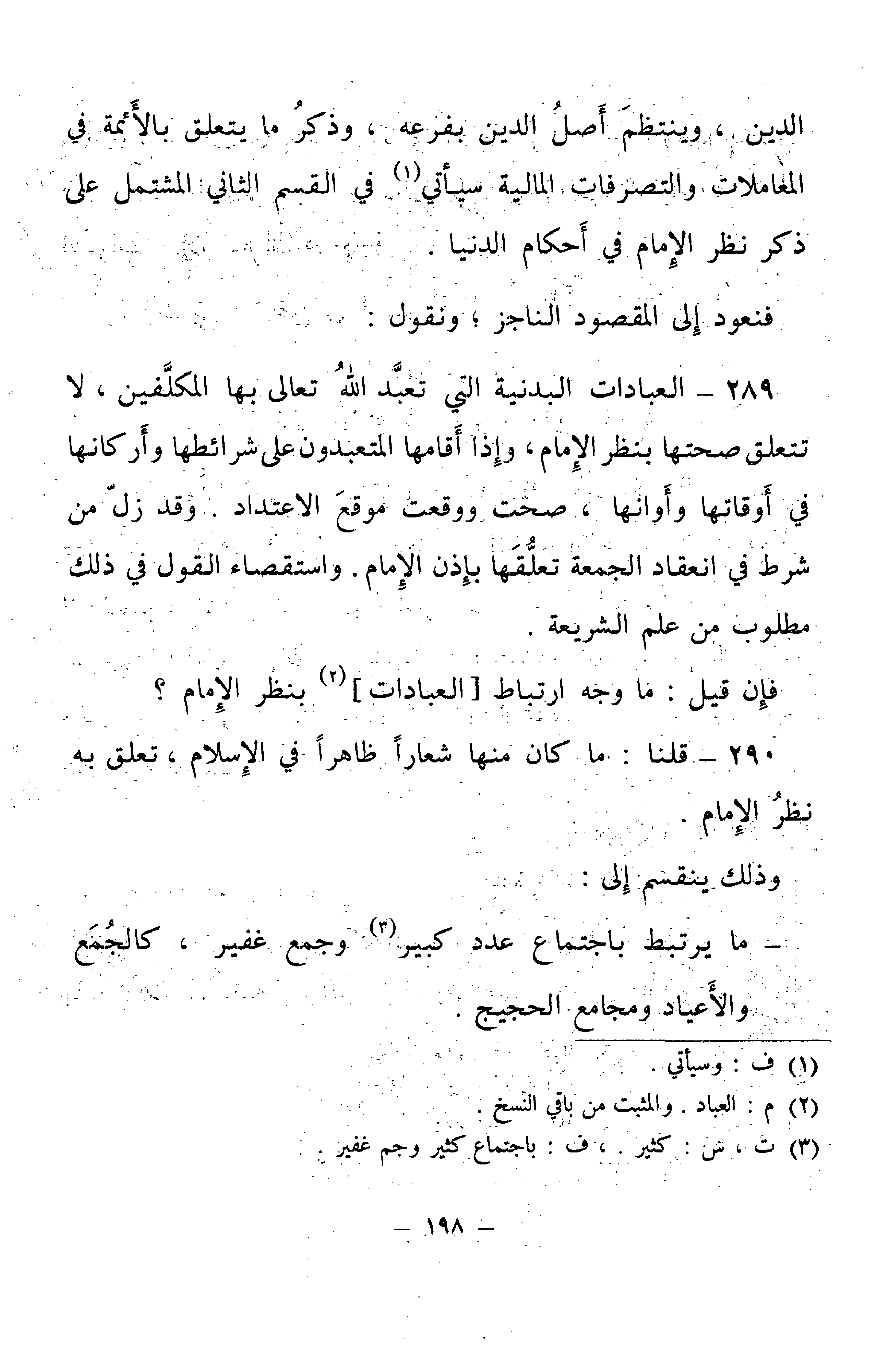 289 - الْعِبَادَاتُ الْبَدَنِيَّةُ الَّتِي تَعَبَّدَ اللَّهُ بِهَا الْمُكَلَّفِينَ، لَا تَتَعَلَّقُ صِحَّتُهَا بِنَظَرِ الْإِمَامِ، وَإِذَا أَقَامَهَا الْمُتَعَبِّدُونَ عَلَى شَرَائِطِهَا وَأَرْكَانِهَا فِي أَوْقَاتِهَا وَأَوَانِهَا، صَحَّتْ وَوَقَعَتْ مَوْقِعَ الِاعْتِدَادِ. وَقَدْ زَلَّ مَنْ شَرَطَ فِي انْعِقَادِ الْجُمُعَةِ تَعَلُّقُهَا بِإِذْنِ الْإِمَامِ. وَاسْتِقْصَاءُ الْقَوْلِ فِي ذَلِكَ مَطْلُوبٌ مِنْ عِلْمِ الشَّرِيعَةِ.
