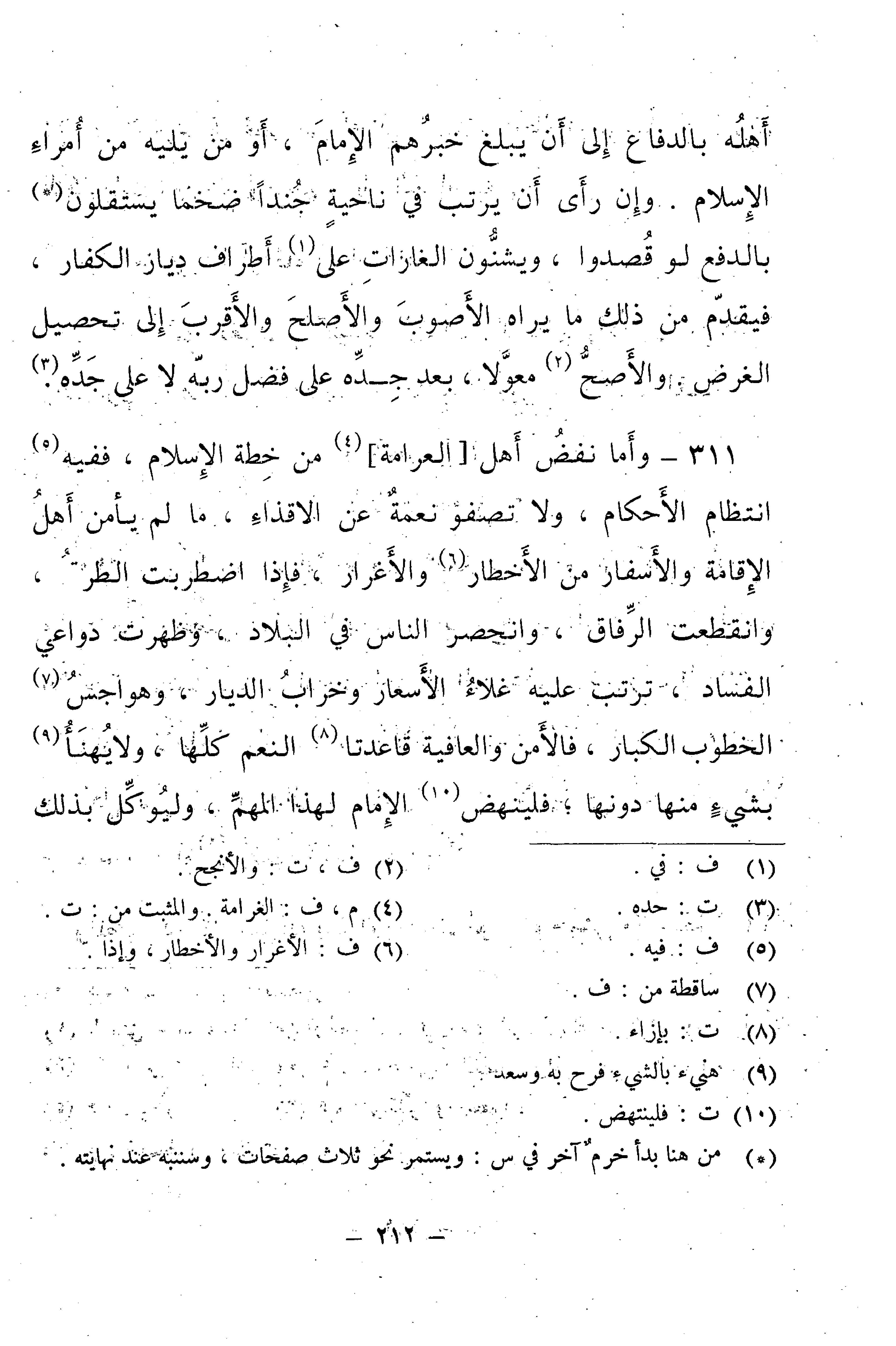 311 - وَأَمَّا نَفْضُ أَهْلِ الْغَرَامَةِ مِنْ خِطَّةِ الْإِسْلَامِ، فَفِيهِ انْتِظَامُ الْأَحْكَامِ، وَلَا تَصْفُو نِعْمَةٌ عَنِ الْأَقْذَاءِ، مَا لَمْ يَأْمَنْ أَهْلُ الْإِقَامَةِ وَالْأَسْفَارِ مِنَ الْأَخْطَارِ وَالْأَغْرَارِ، فَإِذَا اضْطَرَبَتِ الطُّرُقُ، وَانْقَطَعَتِ الرِّفَاقُ، وَانْحَصَرَ النَّاسُ فِي الْبِلَادِ، وَظَهَرَتْ دَوَاعِي الْفَسَادِ، تَرَتَّبَ عَلَيْهِ غَلَاءُ الْأَسْعَارِ، وَخَرَابُ الدِّيَارِ، وَهَوَاجِسُ الْخُطُوبِ الْكِبَارِ، فَالْأَمْنُ وَالْعَافِيَةُ قَاعِدَتَا النِّعَمِ كُلِّهَا، وَلَا يُهْنَأُ بِشَيْءٍ مِنْهَا دُونَهَا ; فَلْيَنْتَهِضِ الْإِمَامُ لِهَذَا الْمُهِمِّ، وَلِيُوَكِّلْ بِذَلِكَ