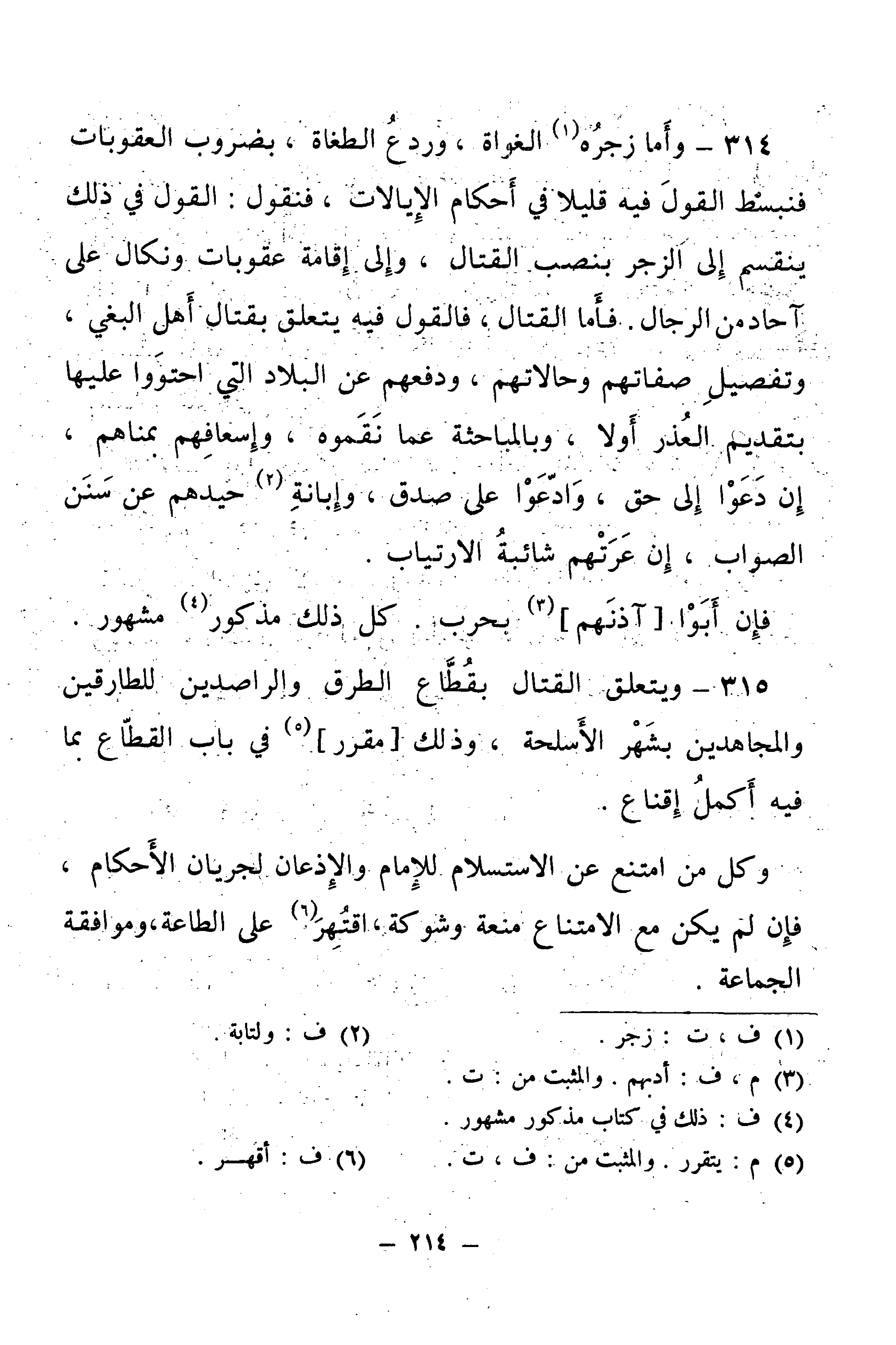 315 - وَيَتَعَلَّقُ الْقِتَالُ بِقُطَّاعِ الطُّرُقِ وَالرَّاصِدِينَ لِلطَّارِقِينَ، وَالْمُجَاهِدِينَ بِشَهْرِ الْأَسْلِحَةِ، وَذَلِكَ مُقَرَّرٌ فِي بَابِ الْقُطَّاعِ، بِمَا فِيهِ أَكْمَلُ إِقْنَاعٍ.