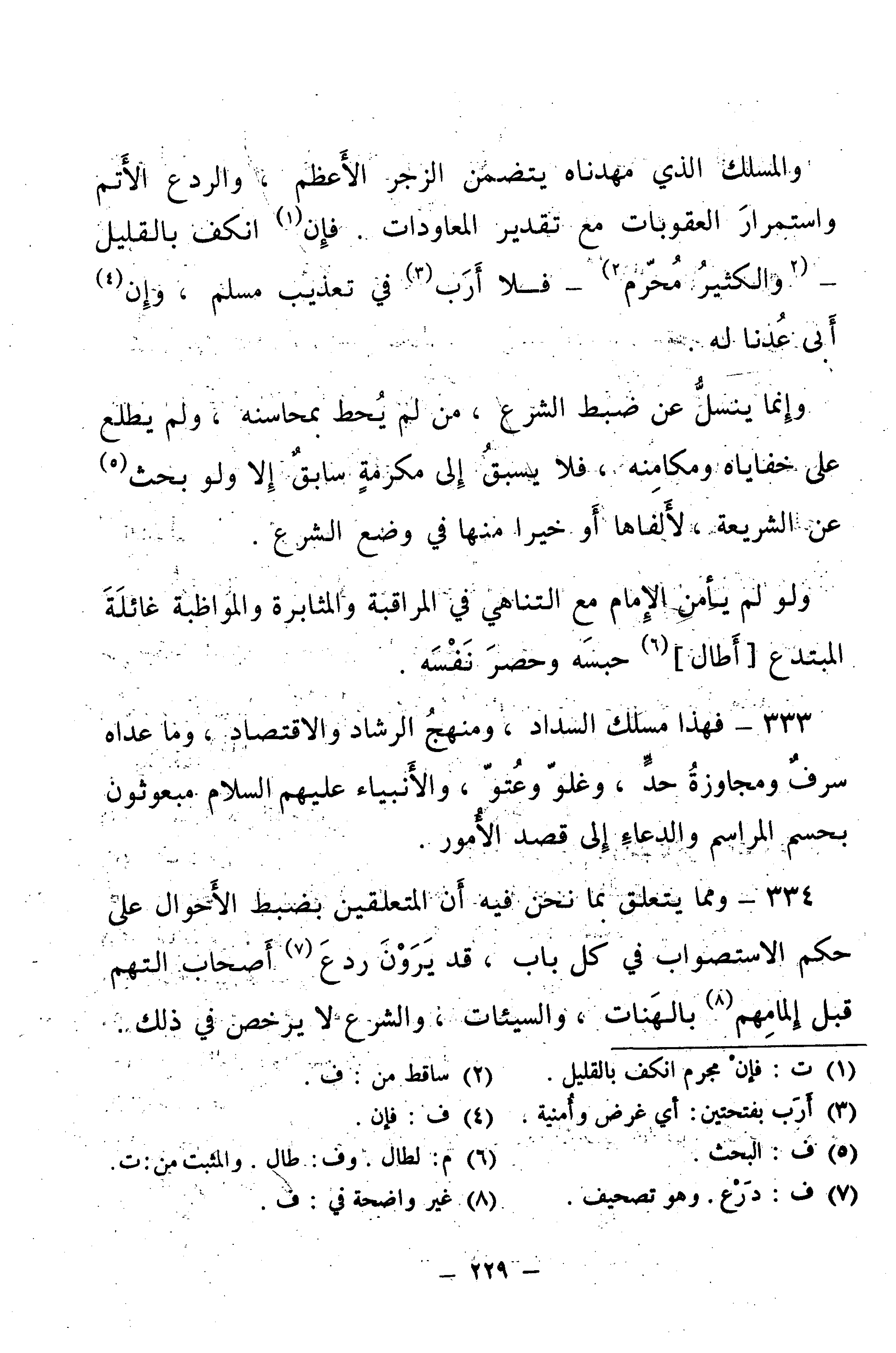 333 - فَهَذَا مَسْلَكُ السَّدَادِ، وَمَنْهَجُ الرَّشَادِ وَالِاقْتِصَادِ، وَمَا عَدَاهُ سَرَفٌ وَمُجَاوَزَةُ حَدٍّ، وَغُلُوٌّ وَعُتُوٌّ، وَالْأَنْبِيَاءُ - عَلَيْهِمُ السَّلَامُ - مَبْعُوثُونَ بِحَسْمِ الْمَرَاسِمِ، وَالدُّعَاءِ إِلَى قَصْدِ الْأُمُورِ.